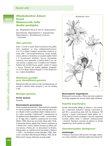 Gatunki roÊlin 4093 Rhododendron luteum Sweet Ró˝anecznik ˝ó∏ty Azalia pontyjska Rhododendron luteum Syn.: Rhododendron flavum G. Don fil., Azalea pontica L. Spermatophyta, Magnoliophytina [= Angiospermae], Magnoliopsida [= Dicotyledoneae], Ericaceae – wrzosowate 176 1cm Krzew 1–2,5 (4) m wysoki. System korzeniowy silny, p∏aski. LiÊcie opadajàce na zim´, pod∏ugowatolancetowate 6–12 cm d∏ugie, brzegiem szczeciniasto orz´sione, jesienià ˝ó∏te i czerwonopomaraƒczowe. Kwiaty okaza∏e, wonne, zebrane w kwiatostany na szczytach p´dów. Kielich o 5 lancetowatych dzia∏kach. Korona z∏ocisto˝ó∏ta, ow∏osiona, nieco grzbiecista, o Êrednicy oko∏o 5 cm, szeroko otwarta, o wàskiej rurce i 5 (rzadko 6 lub 7) ∏atkach. Pr´cików tyle, ile ∏atek korony; pr´ciki i s∏upek (1) wystajà z korony. Owocem jest torebka p´kajàca przegrodowo, 2–3 cm d∏uga. Nasiona d∏ugoÊci 1–2 mm, bardzo liczne, z ma∏ymi skrzyde∏kami. 10cm Poradniki ochrony siedlisk i gatunków Opis gatunku Mo˝liwoÊç pomy∏ki przy identyfikacji gatunku Ró˝anecznik ˝ó∏ty jest roÊlinà na tyle charakterystycznà, ˝e pomy∏ki z roÊlinami dziko rosnàcymi u nas nie wchodzà w gr´. Biologia gatunku Forma ˝yciowa Fanerofit. Rozmna˝anie generatywne Kwiaty rozwijajà si´ przed liÊçmi. Okres kwitnienia przypada na maj lub poczàtek czerwca. Kwiaty zawierajà nektar ukryty w d∏ugich rurkach (u podstawy zalà˝ni znajduje si´ tarczka z pi´ciu gruczo∏ów miodnikowych) i przystosowane sà do zapylania przez d∏ugotràbkowe motyle – zmierzchnikowce. W ciàgu dnia w zapylaniu uczestniczà te˝ inne owady (Macko 1930); zdarza si´, ˝e trzmiele rabujà nektar. Torebki dojrzewajà jesienià, p´kajà zimà. Nasiona rozsiewane sà w okresie zimy i wiosnà. Nasiona tworzone sà obficie, jednak zarówno w Polsce, jak i na stanowiskach na Ukrainie, kie∏kujà s∏abo, np. podczas kontroli stanowiska w Ko∏aczni, w 1993 r., nie stwierdzono siewek (Szkudlarz 1995). Natomiast w warunkach laboratoryjnych kie∏kujà w 90%, ale delikatne siewki masowo atakowane sà przez grzyby. owoc Rozmna˝anie wegetatywne Ró˝anecznik na stanowisku w Polsce rozmna˝a si´ g∏ównie na drodze wegetatywnej, tworzàc obficie p´dy odroÊlowe. Aspekty populacyjne ZaroÊla ró˝anecznika ˝ó∏tego na jedynym u nas stanowisku, w rezerwacie „Ko∏acznia”, zajmujà w pierwszych latach XXI w. powierzchni´ oko∏o 0,01 ha. Naliczono 190 krzewów o bardzo zró˝nicowanej liczbie p´dów, od 1 do 30. Rozwój krzewów przebiega w kierunku optymalnej zwartoÊci p∏atów, tak˝e w miejscach nas∏onecznionych i otwartych. Populacja rozmna˝a si´ g∏ównie na drodze wegetatywnej; siewki spotyka si´ rzadziej. Charakterystyka ekologiczna Autekologia W Ko∏aczni ró˝anecznik ˝ó∏ty porasta niski pagór wydmowy z sosnà, schodzàc w obni˝enie zaj´te przez olszyn´. Ro- RoÊliny kwiatowe Ênie na p∏ytkich, ubogich glebach pochodzenia bielicowego, umiarkowanie wilgotnych, mezotroficznych. Gatunek o du˝ej tolerancji; znosi zarówno du˝e nas∏onecznienie, jak te˝ cz´Êciowe ocienienie. W Polsce nie jest to roÊlina konkurencyjna w widnych lasach, a zw∏aszcza w m∏odnikach, jakkolwiek w ogrodach najlepiej roÊnie w du˝ym zag´szczeniu. Ekologiczne liczby wskaênikowe Êwiat∏a, temperatury, reakcji (odczynu gleby) i trofizmu wynoszà wg Zarzyckiego i in. (2002) – odpowiednio: L = 4, T = 4, R = 3, Tr = 3. Siedliska (wg Za∏àcznika I Dyrektywy Siedliskowej) Siedliska, na których wyst´puje ró˝anecznik w Polsce, nie znalaz∏y si´ w za∏àczniku I Dyrektywy Siedliskowej. Rozmieszczenie geograficzne Wyst´powanie na Êwiecie Centrum wyst´powania ró˝anecznika ˝ó∏tego znajduje si´ w górach Anatolii i na Kaukazie; du˝a oderwana wyspa – na pograniczu Wo∏ynia i Podola i we wschodnich Alpach (Meusel i in. 1978, Macko 1930, Sychowa 1962, KornaÊ, Medwecka-KornaÊ 2002). Jest interesujàce, ˝e gatunek wprowadzony na Wyspy Brytyjskie pod koniec XVIII w. szeroko si´ rozprzestrzeni∏ w tamtejszych zbiorowiskach leÊnych (Cross 1975). Wyst´powanie w Polsce Jedyne uznane za naturalne stanowisko w Polsce, odkryte w 1909 r., znajduje si´ w Ko∏aczni, na pó∏noc od Woli Zarczyckiej ko∏o Le˝ajska (Raciborski 1909), w dawnej Puszczy Sandomierskiej. Po∏o˝one jest oko∏o 300 km na po∏udniowy zachód od wyspowego stanowiska ró˝anecznika na Wo∏yniu (Macko 1930). Area∏ wyst´powania gatunku w Ko∏aczni od 100 lat nie powi´kszy∏ si´. Status gatunku Prawo mi´dzynarodowe: Konwencja Berneƒska (1979) – nie uwzgl´dniono; Dyrektywa Siedliskowa (1992) – gatunek proponowany przez Polsk´ jako uzupe∏nienie do Za∏àcznika II DS, uzyska∏ akceptacj´ ekspertów Unii Europejskiej (Makomaska-Juchiewicz i in. 2001); w∏àczony na mocy Traktatu Akcesyjnego podpisanego w Atenach w 2003 r. Prawo krajowe: Ochrona gatunkowa – Êcis∏a do 2001 r., obecnie ponownie na liÊcie gatunków chronionych. Kategorie IUCN: „Czerwona lista IUCN” (1996) – nie uwzgl´dniono; „Polska czerwona ksi´ga roÊlin” (Kaêmierczakowa, Zarzycki 2001) – CR. Wyst´powanie gatunku na obszarach prawem chronionych Ca∏a polska populacja chroniona jest w rezerwacie przyrody „Ko∏acznia” (pow. 0,11 ha), gdzie wyst´puje w postaci jednego zwartego p∏atu. Stan i dynamika populacji, potencjalne zagro˝enia Stan i dynamika populacji Od 1909 r., a wi´c od pierwszego opisu azalii w Ko∏aczni przez Raciborskiego, liczebnoÊç populacji i zajmowany przez nià area∏ ulega∏ niewielkim wahaniom. Liczba roÊlin by∏a niekiedy ograniczana przez k∏usownicze pozyskiwanie m∏odych krzewów lub siewek. Okresowo, zw∏aszcza przed ogrodzeniem stanowiska, wyst´powa∏y szkody spowodowane przez po˝ary i wypas byd∏a. Po ogrodzeniu zaÊ rezerwatu azalia by∏a nadmiernie ocieniona oraz wypierana przez dynamicznie rozwijajàce si´ je˝yny lub samosiew sosnowy i olchowy. Wspó∏cze