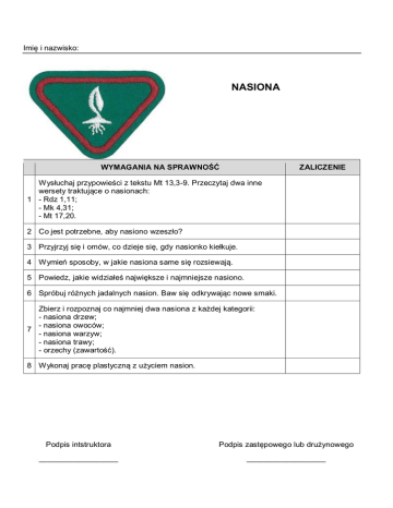Imię i nazwisko: NASIONA WYMAGANIA NA SPRAWNOŚĆ ZALICZENIE Wysłuchaj przypowieści z tekstu Mt 13,3-9. Przeczytaj dwa inne wersety traktujące o nasionach: 1 - Rdz 1,11; - Mk 4,31; - Mt 17,20. 2 Co jest potrzebne, aby nasiono wzeszło? 3 Przyjrzyj się i omów, co dzieje się, gdy nasionko kiełkuje. 4 Wymień sposoby, w jakie nasiona same się rozsiewają. 5 Powiedz, jakie widziałeś największe i najmniejsze nasiono. 6 Spróbuj różnych jadalnych nasion. Baw się odkrywając nowe smaki. Zbierz i rozpoznaj co najmniej dwa nasiona z każdej kategorii: - nasiona drzew; - nasiona owoców; 7 - nasiona warzyw; - nasiona trawy; - orzechy (zawartość). 8 Wykonaj pracę plastyczną z użyciem nasion. Podpis intstruktora Podpis zastępowego lub drużynowego __________________ __________________