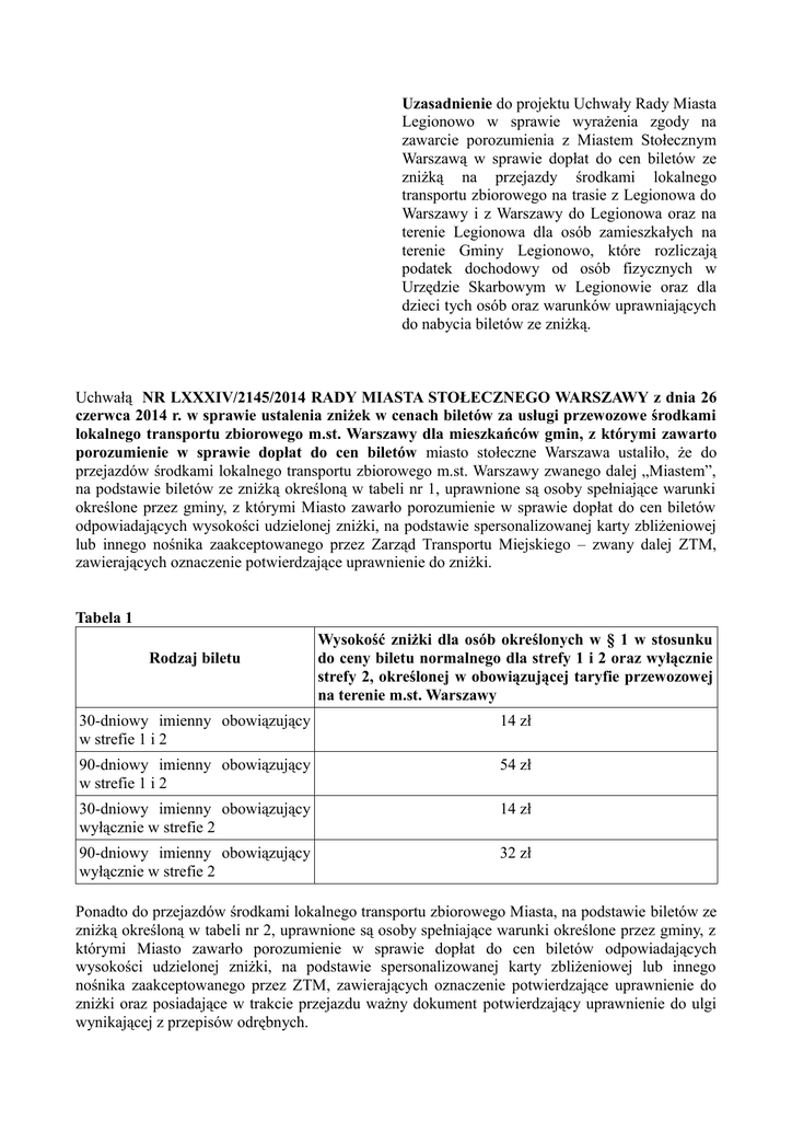 Uzasadnienie do projektu Uchwały Rady Miasta Legionowo w sprawie wyrażenia zgody na zawarcie porozumienia z Miastem Stołecznym Warszawą w sprawie dopłat do cen biletów ze zniżką na przejazdy środkami lokalnego transportu zbiorowego na trasie z Legionowa do Warszawy i z Warszawy do Legionowa oraz na terenie Legionowa dla osób zamieszkałych na terenie Gminy Legionowo, które rozliczają podatek dochodowy od osób fizycznych w Urzędzie Skarbowym w Legionowie oraz dla dzieci tych osób oraz warunków uprawniających do nabycia biletów ze zniżką. Uchwałą NR LXXXIV/2145/2014 RADY MIASTA STOŁECZNEGO WARSZAWY z dnia 26 czerwca 2014 r. w sprawie ustalenia zniżek w cenach biletów za usługi przewozowe środkami lokalnego transportu zbiorowego m.st. Warszawy dla mieszkańców gmin, z którymi zawarto porozumienie w sprawie dopłat do cen biletów miasto stołeczne Warszawa ustaliło, że do przejazdów środkami lokalnego transportu zbiorowego m.st. Warszawy zwanego dalej „Miastem”, na podstawie biletów ze zniżką określoną w tabeli nr 1, uprawnione są osoby spełniające warunki określone przez gminy, z którymi Miasto zawarło porozumienie w sprawie dopłat do cen biletów odpowiadających wysokości udzielonej zniżki, na podstawie spersonalizowanej karty zbliżeniowej lub innego nośnika zaakceptowanego przez Zarząd Transportu Miejskiego – zwany dalej ZTM, zawierających oznaczenie potwierdzające uprawnienie do zniżki. Tabela 1 Rodzaj biletu Wysokość zniżki dla osób określonych w § 1 w stosunku do ceny biletu normalnego dla strefy 1 i 2 oraz wyłącznie strefy 2, określonej w obowiązującej taryfie przewozowej na terenie m.st. Warszawy 30-dniowy imienny obowiązujący w strefie 1 i 2 14 zł 90-dniowy imienny obowiązujący w strefie 1 i 2 54 zł 30-dniowy imienny obowiązujący wyłącznie w strefie 2 14 zł 90-dniowy imienny obowiązujący wyłącznie w strefie 2 32 zł Ponadto do przejazdów środkami lokalnego transportu zbiorowego Miasta, na podstawie biletów ze zniżką określoną w tabeli nr 2, uprawnione są osoby spełniające warunki określone przez gminy, z którymi Miasto zawarło porozumienie w sprawie dopłat do cen biletów odpowiadających wysokości udzielonej zniżki, na podstawie spersonalizowanej karty zbliżeniowej lub innego nośnika zaakceptowanego przez ZTM, zawierających oznaczenie potwierdzające uprawnienie do zniżki oraz posiadające w trakcie przejazdu ważny dokument potwierdzający uprawnienie do ulgi wynikającej z przepisów odrębnych. Tabela 2 Rodzaj biletu Wysokość zniżki dla osób określonych w § 2 w stosunku do ceny biletu ulgowego dla strefy 1 i 2 oraz wyłącznie strefy 2, określonej w obowiązującej taryfie przewozowej na terenie m.st. Warszawy 30-dniowy imienny obowiązujący w strefie 1 i 2 7 zł 90-dniowy imienny obowiązujący w strefie 1 i 2 27 zł 30-dniowy imienny obowiązujący wyłącznie w strefie 2 7 zł 90-dniowy imienny obowiązujący wyłącznie wstrefie 2 16 zł Bilety ze zniżką otrzymują nazwę „Biletu Warszawa +”. Osobie uprawnionej do zniżek w cenach biletów za usługi przewozowe środkami lokalnego transportu zbiorowego organizowanymi przez Miasto na podstawie kilku tytułów, przysługuje jedna wybrana przez nią zniżka z uwzględnieniem postanowień uchwały. Zakup biletu ze zniżką jest możliwy jedynie w okresie obowiązywania porozumienia w sprawie dopłat do cen biletów zawartego z daną gminą. W przypadku wygaśnięcia porozumienia w sprawie dopłat do cen biletów z daną gminą, bilety zakupione ze zniżką przez pasażerów w okresie obowiązywania porozumienia zachowują ważność do końca terminu ważności biletu. Uchwała weszła w życie z dniem 1 sierpnia 2014 r. Program „Warszawa+” skierowany jest do gmin aglomeracji warszawskiej, których mieszkańcy korzystają codziennie z komunikacji zbiorowej organizowanej przez Zarząd Transportu Miejskiego, który działa w imieniu m.st. Warszawy. Dzięki porozumieniu między gminą a m.st. Warszawa, mieszkańcy aglomeracji mają dostęp do największej w Polsce zintegrowanej sieci komunikacyjnej, obejmującej: tramwaje, autobusy, metro, pociągi Szybkiej Kolei Miejskiej, autobusowe linie dowozowe typu „L”, a także – w ramach Wspólnego Biletu ZTM-KM-WKD – również pociągi Kolei Mazowieckich i Warszawskiej Kolei Dojazdowej. Nowa Oferta „Warszawa +” jest skierowana do samorządów, które są gotowe by zaoferować swoim mieszkańcom możliwość tańszego podróżowania komunikacją miejską. Tańszego, gdyż bilet 30 – dniowy imienny, ważny w obu strefach, kosztuje obecnie 210 zł (ulgowy 105 zł). Tymczasem mieszkaniec gminy, która zdecyduje się skorzystać z oferty „Warszawa+” zapłaci za niego jedynie 196 zł (ulgowy 98 zł). Na bilet 90 – dniowy imienny na obie strefy trzeba wydać bez zniżki 536 zł (ulgowy 268 zł). W ramach „Warszawa+” będzie kosztował tylko 482 zł (ulgowy 241 zł). Mieszkańcy gminy, będą też mogli kupić tańsze bilety tylko na drugą strefę. Bilet 30 – dniowy będzie kosztować 98zł (ulgowy 49 zł), a 90 – dniowy – 250 zł (ulgowy 125 zł). Dla porównania – bilety na drugą strefę bez zniżki kosztują odpowiednio 112 zł (56 zł) i 282 zł (141 zł). Różnicę w cenie biletów będzie pokrywać gmina Legionowo zgodnie z porozumieniem, które będzie zawarte z ZTM w Warszawie. Uprawnienie do dopłat będzie przysługiwało na podstawie spersonalizowanej karty zbliżeniowej, zaakceptowanej przez Zarząd Transportu Miejskiego w W-wie, zawierający legionowskie oznaczenie potwierdzające uprawnienie do dopłaty. Warunkiem niezbędnym do wydania mieszkańcom karty legionowianina jest zamieszkiwanie na terenie Legionowa oraz rozliczanie podatku dochodowego od osób fizycznych w Urzędzie Skarbowym w Legionowie.