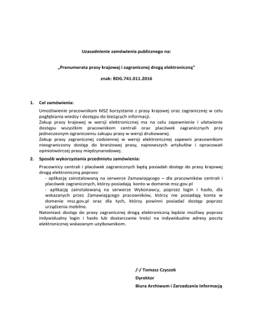 Uzasadnienie zamówienia publicznego na: „Prenumerata prasy krajowej i zagranicznej drogą elektroniczną” znak: BDG.741.011.2016 1. Cel zamówienia: Umożliwienie pracownikom MSZ korzystanie z prasy krajowej oraz zagranicznej w celu pogłębiania wiedzy i dostępu do bieżących informacji. Zakup prasy krajowej w wersji elektronicznej ma na celu zapewnienie i ułatwienie dostępu wszystkim pracownikom centrali oraz placówek zagranicznych przy jednoczesnym ograniczeniu zakupu prasy w wersji drukowanej. Zakup prasy zagranicznej codziennej w wersji elektronicznej zapewni pracownikom nieograniczony dostęp do branżowej prasy, najnowszych artykułów i opracowań opiniotwórczej prasy międzynarodowej. 2. Sposób wykorzystania przedmiotu zamówienia: Pracownicy centrali i placówek zagranicznych będą posiadali dostęp do prasy krajowej drogą elektroniczną poprzez: - aplikację zainstalowaną na serwerze Zamawiającego – dla pracowników centrali i placówek zagranicznych, którzy posiadają konto w domenie msz.gov.pl - aplikację zainstalowaną na serwerze Wykonawcy, poprzez login i hasło, dla wskazanych przez Zamawiającego pracowników, którzy nie posiadają konta w domenie msz.gov.pl oraz dla tych, którzy powinni posiadać dostęp poprzez urządzenia mobilne. Natomiast dostęp do prasy zagranicznej drogą elektroniczną będzie możliwy poprzez indywidualny login i hasło lub dostarczanie treści na indywidualne adresy poczty elektronicznej wskazanym użytkownikom. /-/ Tomasz Czyszek Dyrektor Biura Archiwum i Zarzadzania Informacją