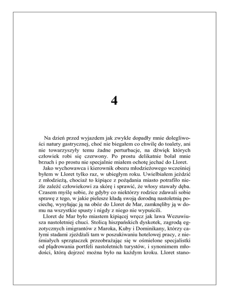 4 Na dzień przed wyjazdem jak zwykle dopadły mnie dolegliwości natury gastrycznej, choć nie biegałem co chwilę do toalety, ani nie towarzyszyły temu żadne perturbacje, na dźwięk których człowiek robi się czerwony. Po prostu delikatnie bolał mnie brzuch i po prostu nie specjalnie miałem ochotę jechać do Lloret. Jako wychowawca i kierownik obozu młodzieżowego wcześniej byłem w Lloret tylko raz, w ubiegłym roku. Uwielbiałem jeździć z młodzieżą, chociaż to kipiące z pożądania miasto potrafiło nieźle zaleźć człowiekowi za skórę i sprawić, że włosy stawały dęba. Czasem myślę sobie, że gdyby co niektórzy rodzice zdawali sobie sprawę z tego, w jakie pielesze kładą swoją dorodną nastoletnią pociechę, wysyłając ją na obóz do Lloret de Mar, zamknęliby ją w domu na wszystkie spusty i nigdy z niego nie wypuścili. Lloret de Mar było miastem kipiącej wręcz jak lawa Wezuwiusza nastoletniej chuci. Stolicą hiszpańskich dyskotek, zagrodą egzotycznych imigrantów z Maroka, Kuby i Dominikany, którzy całymi stadami zjeżdżali tam w poszukiwaniu hotelowej pracy, z nieśmiałych sprzątaczek przeobrażając się w ośmielone specjalistki od plądrowania portfeli nastoletnich turystów, i synonimem młodości, którą dojrzeć można było na każdym kroku. Lloret stano- wiło również swoistą stajnię świńskiej grypy i zatokę wszelkiej maści chorób, od opryszczki płciowej po AIDS. Śmiać mi się chce, kiedy pomyślę, jaką sensację rozdmuchały w tym roku masmedia, w związku z pandemią świńskiej grypy w tym zagajniku samego Lucyfera. O, tak, Lloret można by swobodnie określić takim właśnie mianem, jeśli ma się nieco kąśliwy umysł i zazdrości młodym ludziom tej od groma obecnej przyjemności, jaką potrafi dostarczyć to niewątpliwie urokliwe miasteczko. Moherowe berety żegnałyby się na rogu każdej ulicy, albo zaślepione pięknem katalońskiej Costa Brava, udawałyby, że niczego nie widzą. Otóż na Lloret de Mar egzotyczni murzyni sprzedawali nie mniej egzotyczne zakazane używki, egzotyczne Marokanki proponowały nie mniej egzotyczne marokańskie usługi (w tym HIV gratis, a scenerią mogła być zawsze kamienista plaża nocą), zaś błyskająca neonami kolekcja bodaj pięćdziesięciu dyskotek oferowała darmowe macanie po dupie, a w wersji soft − mizianie gejowskimi rękoma po heteryckich włosach. Jednym słowem − młodości, dodaj mi skrzydeł, niech odlecę! A odlecieć na Lloret de Mar też można było bardzo łatwo. Wystarczyło kupić sobie flaszkę wódki w międzyhotelowej arkadzie sklepów spożywczo-monopolowych, gdzie przemiłe panie Hola i Adios tak samo przemiło sprzedawały wszelkiej maści trunki niespełna siedemnastoletnim turystom i gdzie przemiła pani mosso d' Esquadra (czytaj: katalońska policjantka) udawała ślepą. Wszyscy byli zatem przemili, bo jedni chcieli sobie poużywać, a drudzy chcieli zarobić. W tej cudownej mekce kipiących od pożądania dziewic, płaczliwie przyglądających się każdemu nastoletniemu chłopcu gejów, cyganek okradających bogu ducha winnych nastoletnich turystów, którzy nie zdążyli jeszcze dobrze wysiąść z autokaru i wyjąć z niego bagażu (moją podopieczną okradła w ten sposób jakaś stara złodziejka), było też wiele hiszpańskiego uroku, było w niej słoneczne lato i niekończące się morze z Dzikim Wybrzeżem ze ścianą mokrych od fali skał. Lloret de Mar − to tam pokochałem oczy tego chłopca i to tam miast stracić swoje dziewictwo, odzyskałem je na nowo (…) *** (…) Zadzwoniłem do Danusi. Powierniczka moich najskrytszych sekretów i chyba jedyna osoba, która natychmiastowo i bezinteresownie spełnia wszystkie moje prośby, jak zawsze okazała się niezawodna. Nigdy nie potrafiłem zrozumieć, dlaczego jest moim aniołem stróżem i wybawia mnie z każdej niemalże opresji. − Kiedy i gdzie mam być? − to jedyne, o co zapytała. Aniołowie o nic więcej nie pytają. − Przyjedź do mnie na dziewiętnastą − ciągnąłem. − Podrzucę cię od siebie do Katowic. − Będę o dziewiętnastej. − Aniołowie nigdy się nie spóźniają. Doznałem ulgi. Oddzwoniłem do Baśki, koordynatorki młodzieżowych uciech, przekazałem jej cudowną nowinę i odjechałem szczęśliwie do domu. Gdyby on wiedział, że to ja miałem go odebrać z samych Kielc, dziś zapewne nie byłby zadowolony. Gdybym ja wiedział, że to on stanie się Morfeuszem moich snów, odebrałbym go z tych Kielc, nawet gdyby były na drugim końcu świata, albo... nigdy nie wyjechał do Lloret. A Lloret, och, Lloret było jak Olimp, na którym bogowie oddawali się niekończącym się uciechom, na którym eliksir młodości lał się strumieniami i odurzał swoim bukietem, a w powietrzu unosiły się głównie męskie feromony i pachnidła o erotycznej nucie. Rozmarzony, stoję teraz w wyobraźni nad cedrowym naczyniem i komponuję zapach Lloret, a w zasadzie to staram się go odgadnąć. Jest jak Mania, jak Black Code albo Emporio − Armaniego. Od strony Santa Clotilde, gdzie rozpościera się semigejowska plaża nudystów, wieje nutą słodkawej ambry i ostrego piżma. Wieje też fetor męskich spoconych ciał. Nad Platja de Lloret1, w samym sercu miejscowego wybrzeża, gdzie młodzi ludzie masowo opalają się za dnia, by w księżycową morską noc opaleniznę ostudzić na tejże plaży już w nieco inny sposób, unosi się cała orkiestra zapachów. Drzewo cedrowe gra pierwsze skrzypce, w tle słychać mandarynkę, anyż i cichą nutę szafranu. Kiedy podejść bliżej morskich fal, odzywa się ozon i jod, w promieniach metalicznie lśniącego słońca. Ale kiedy Platja de Lloret robi się nocą wilgotna i granatowa, duet ten gaśnie i wtedy 1 (catal.) dosł. Plaża w Lloret − funkcjonuje jako nazwa własna. Najbardziej uczęszczane miejsce plażowe w Lloret de Mar. piżmo z ambrą grają na mokrych kamieniach, a ja uświadamiam sob