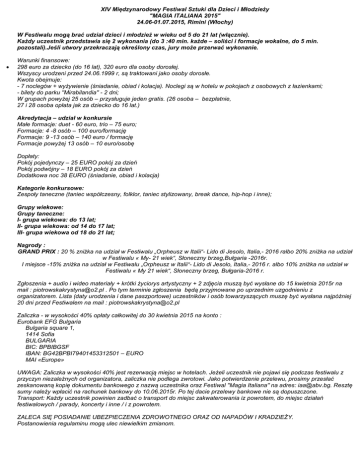 XIV Międzynarodowy Festiwal Sztuki dla Dzieci i Młodzieży "MAGIA ITALIANA 2015" 24.06-01.07.2015, Rimini (Włochy) W Festiwalu mogą brać udział dzieci i młodzież w wieku od 5 do 21 lat (włącznie). Każdy uczestnik przedstawia się 2 wykonania (do 3 :40 min. każde – soliści i formacje wokalne, do 5 min. pozostali).Jeśli utwory przekraczają określony czas, jury może przerwać wykonanie. Warunki finansowe: 298 euro za dziecko (do 16 lat), 320 euro dla osoby dorosłej. Wszyscy urodzeni przed 24.06.1999 r, są traktowani jako osoby dorosłe. Kwota obejmuje: - 7 noclegów + wyżywienie (śniadanie, obiad i kolacja). Noclegi są w hotelu w pokojach z osobowych z łazienkami; - bilety do parku "Mirabilandia" - 2 dni; W grupach powyżej 25 osób – przysługuje jeden gratis. (26 osoba – bezpłatnie, 27 i 28 osoba opłata jak za dziecko do 16 lat.) Akredytacja – udział w konkursie Małe formacje: duet - 60 euro, trio – 75 euro; Formacje: 4 -8 osób – 100 euro/formację Formacje: 9 -13 osób – 140 euro / formację Formacje powyżej 13 osób – 10 euro/osobę Dopłaty: Pokój pojedynczy – 25 EURO pokój za dzień Pokój podwójny – 18 EURO pokój za dzień Dodatkowa noc 38 EURO (śniadanie, obiad i kolacja) Kategorie konkursowe: Zespoły taneczne (taniec współczesny, folklor, taniec stylizowany, break dance, hip-hop i inne); Grupy wiekowe: Grupy taneczne: I- grupa wiekowa: do 13 lat; II- grupa wiekowa: od 14 do 17 lat; III- grupa wiekowa od 18 do 21 lat; Nagrody : GRAND PRIX : 20 % zniżka na udział w Festiwalu „Orpheusz w Italii“- Lido di Jesolo, Italia,- 2016 ralbo 20% zniżka na udział w Festiwalu « My- 21 wiek“, Słoneczny brzeg,Bułgaria -2016r. I miejsce -15% zniżka na udział w Festiwalu „Orpheusz w Italii“- Lido di Jesolo, Italia,- 2016 r. albo 10% zniżka na udział w Festiwalu « My 21 wiek“, Słoneczny brzeg, Bułgaria-2016 r. Zgłoszenia + audio i wideo materiały + krótki życiorys artystyczny + 2 zdjęcia muszą być wysłane do 15 kwietnia 2015r na mail : [email protected] . Po tym terminie zgłoszenia będą przyjmowane po uprzednim uzgodnieniu z organizatorem. Lista (daty urodzenia i dane paszportowe) uczestników i osób towarzyszących muszę być wysłana najpóźniej 20 dni przed Festiwalem na mail : [email protected] Zaliczka - w wysokości 40% opłaty całkowitej do 30 kwietnia 2015 na konto : Eurobank EFG Bulgaria Bulgaria square 1, 1414 Sofia BULGARIA BIC: BPBIBGSF IBAN: BG42BPBI79401453312501 – EURO MAI «Europe» UWAGA: Zaliczka w wysokości 40% jest rezerwacją miejsc w hotelach. Jeżeli uczestnik nie pojawi się podczas festiwalu z przyczyn niezależnych od organizatora, zaliczka nie podlega zwrotowi. Jako potwierdzenie przelewu, prosimy przesłać zeskanowaną kopię dokumentu bankowego z nazwą uczestnika oraz Festiwal "Magia Italiana" na adres: [email protected]. Resztę sumy należy wpłacić na rachunek bankowy do 10.06.2015r. Po tej dacie przelewy bankowe nie są dopuszczone. Transport: Każdy uczestnik powinien zadbać o transport do miejsc zakwaterowania iz powrotem, do miejsc działań festiwalowych / parady, koncerty i inne / i z powrotem. ZALECA SIĘ POSIADANIE UBEZPIECZENIA ZDROWOTNEGO ORAZ OD NAPADÓW I KRADZIEŻY. Postanowienia regulaminu mogą ulec niewielkim zmianom.