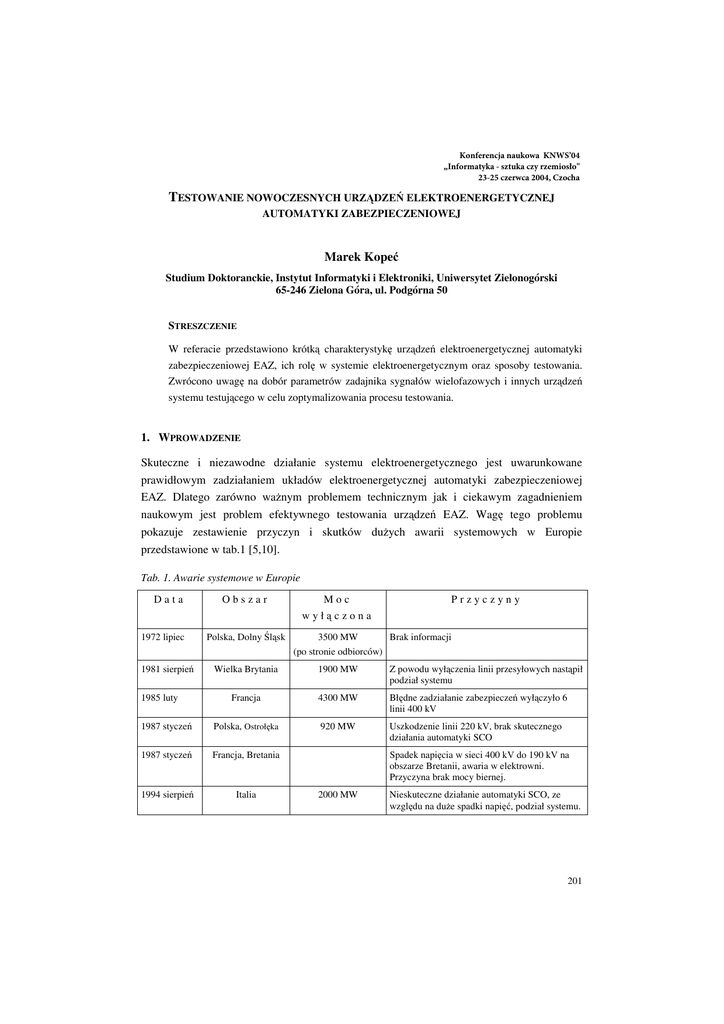 ,POGFSFODKBOBVLPXB,/84 v*OGPSNBUZLBT[UVLBD[ZS[FNJPTP D[FSXDB$[PDIB TESTOWANIE NOWOCZESNYCH URZĄDZEē ELEKTROENERGETYCZNEJ AUTOMATYKI ZABEZPIECZENIOWEJ Marek Kopeü Studium Doktoranckie, Instytut Informatyki i Elektroniki, Uniwersytet Zielonogórski 65-246 Zielona Góra, ul. Podgórna 50 STRESZCZENIE W referacie przedstawiono krótką charakterystykĊ urządzeĔ elektroenergetycznej automatyki zabezpieczeniowej EAZ, ich rolĊ w systemie elektroenergetycznym oraz sposoby testowania. Zwrócono uwagĊ na dobór parametrów zadajnika sygnałów wielofazowych i innych urządzeĔ systemu testującego w celu zoptymalizowania procesu testowania. 1. WPROWADZENIE Skuteczne i niezawodne działanie systemu elektroenergetycznego jest uwarunkowane prawidłowym zadziałaniem układów elektroenergetycznej automatyki zabezpieczeniowej EAZ. Dlatego zarówno waĪnym problemem technicznym jak i ciekawym zagadnieniem naukowym jest problem efektywnego testowania urządzeĔ EAZ. WagĊ tego problemu pokazuje zestawienie przyczyn i skutków duĪych awarii systemowych w Europie przedstawione w tab.1 [5,10]. Tab. 1. Awarie systemowe w Europie Data 1972 lipiec 1981 sierpieĔ Obszar Polska, Dolny ĝląsk Moc wyłączona Przyczyny 3500 MW Brak informacji (po stronie odbiorców) Wielka Brytania 1900 MW Z powodu wyłączenia linii przesyłowych nastąpił podział systemu Francja 4300 MW BłĊdne zadziałanie zabezpieczeĔ wyłączyło 6 linii 400 kV 1987 styczeĔ Polska, OstrołĊka 920 MW Uszkodzenie linii 220 kV, brak skutecznego działania automatyki SCO 1987 styczeĔ Francja, Bretania 1994 sierpieĔ Italia 1985 luty Spadek napiĊcia w sieci 400 kV do 190 kV na obszarze Bretanii, awaria w elektrowni. Przyczyna brak mocy biernej. 2000 MW Nieskuteczne działanie automatyki SCO, ze wzglĊdu na duĪe spadki napiĊü, podział systemu. 201 Analizując powyĪszą tabelĊ moĪna dojĞü do wniosku, Īe do wielu z tych katastrof energetycznych nie doszłoby, gdyby nie nieprawidłowa praca urządzeĔ automatyki zabezpieczeniowej. WciąĪ duĪym problemem jest liczba wypadków (Ğmiertelnych i ciĊĪkich) spowodowanych poraĪeniem prądem. Ogromne są równieĪ straty materialne, spowodowane przez awarie urządzeĔ wywołane zwarciami. Wadliwa praca EAZ, oprócz błĊdów projektowych i wykonawczych, jest jedną z przyczyn powstawania powaĪnych awarii systemów energetycznych. Biorąc pod uwagĊ wprowadzanie do pracy w systemach elektroenergetycznych nowoczesnych zabezpieczeĔ cyfrowych [2,11] i tendencje rozwoju w dziedzinie aparatów elektrycznych [3], wydajne testowanie urządzeĔ EAZ okazuje siĊ zagadnieniem aktualnym i o duĪej wadze. 2. URZĄDZENIA CYFROWE EAZ Coraz nowoczeĞniejsze zabezpieczenia energetyczne wymagają coraz bardziej skomplikowanych i zaawansowanych systemów testujących. Współczesne systemy energetyczne coraz czĊĞciej są wyposaĪone w zabezpieczenia cyfrowe. Na podstawie prowadzonych statystyk [2], urządzenia mikroprocesorowe charakteryzują siĊ wiĊkszą niezawodnoĞcią i pewnoĞcią działania w porównaniu ze starszymi urządzeniami analogowymi i elektromechanicznymi. DziĊki wbudowanym rejestratorom zdarzeĔ i zakłóceĔ moĪna dokładnie przeanalizowaü działanie urządzenia i przyczynĊ zadziałania automatyki. Obsługa ma stały dostĊp do aktualnych nastaw np. progów zadziałania przekaĨników. Nowoczesne cyfrowe terminale zabezpieczeniowe mają w sobie wiele zabezpieczeĔ i pozwalają na wykonywanie wielu czynnoĞci łączeniowych. Oprócz typowych funkcji zabezpieczenia nadprądowego, podnapiĊciowego, ziemnozwarciowego, oferują takĪe zabezpieczenie od niesymetrii obciąĪenia i zasilania (np. do zabezpieczenia silników). Mają równieĪ wbudowane funkcje automatyki SPZ (samoczynne ponowne załączenie) i SCO (samoczynne czĊstotliwoĞciowe odłączenie). Są to urządzenia uniwersalne. Jedno cyfrowe zabezpieczenie, w zaleĪnoĞci od konfiguracji, moĪe słuĪyü jako zabezpieczenie linii, silnika, generatora lub transformatora [1,6,8]. Liczba nowoczesnych zabezpieczeĔ, zarówno w energetyce zawodowej, jak i w instalacjach indywidualnych (po stronie zakładu energetycznego i odbiorców) bĊdzie wzrastaü. Nowoczesne zabezpieczenia stopniowo eliminują zawodną aparaturĊ, pracującą od wielu lat w stacjach i rozdzielniach wszystkich zakresów napiĊü. Mimo wysokiego zaawansowania technologicznego, w zabezpieczeniach cyfrowych równieĪ zdarzają siĊ usterki. Stąd koniecznoĞü prac nad zaawansowanymi systemami do testowania zabezpieczeĔ, które prócz testowania prostych zabezpieczeĔ, jak wszelkiego rodzaju wyłączniki, odłączniki itp., bĊdą w stanie dokonaü oceny stanu i skutecznoĞci nowoczesnych, cyfrowych urządzeĔ EAZ. System taki powinien byü moĪliwie 202 uniwersalny i prosty, aby umoĪliwiü testowanie jak najwiĊkszej liczby urządzeĔ EAZ, pracujących w systemie elektroenergetycznym. 3. SPOSOBY TESTOWANIA URZĄDZEē EAZ Sposób testowania zaleĪy od rodzaju testowanego urządzenia i od dokładnoĞci i zakresu testowania. RóĪne są równieĪ okresy testowania, dla zabezpieczeĔ, wymagane obowiązującymi normami i zaleceniami producenta (nie rozumiem). Okres pomiĊdzy kontrolami zaleĪy w duĪej mierze od zmian parametrów urządzenia w czasie eksploatacji, np. ograniczniki przepiĊü i moĪe byü skrócony ze wzglĊdu na warunki, w jakich dane zabezpieczenie pracuje – przy duĪej wilgotnoĞci, zapyleniu i wysokich temperaturach pracy okres kontroli powinien byü krótszy. Proste urządzenia zabezpieczeniowe, np. ograniczniki przepiĊü testuje siĊ metodą techniczną w układzie przedstawionym na rys. 1 [9]. Generator napiĊcia stałego wytwarza napiĊcie pomiarowe o stromoĞci 500 V/s, a amperomierz A mierzy prąd przewodzenia. Gdy prąd osiągnie wartoĞü progową 1 mA, generator przerywa pracĊ, a odczytane z woltomierza napiĊcie przebicia porównuje siĊ z napiĊciem znamionowym urządzenia [9]. A badany ogranicznik + V przyrząd pomia