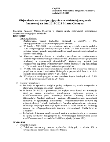 Część II załącznika Wieloletniej Prognozy Finansowej na lata 2013-2025 Objaśnienia wartości przyjętych w wieloletniej prognozie finansowej na lata 2013-2025 Miasta Cieszyna. Prognozę finansów Miasta Cieszyna w okresie spłaty zobowiązań sporządzono w oparciu o następujące założenia: DOCHODY 1. Dochody bieżące: Zaplanowano wzrost dochodów bieżących o ok.2,5% - 3%, z uwzględnieniem skutków następujących założeń: a) W latach - 2013-2014 – przewidziano wpływy z tytułu zwrotu podatku VAT zwiększającego dochody bieżące o około 2-4 mln zł rocznie. Zwrot podatku dotyczy przede wszystkim realizowanych zadań inwestycyjnych w zakresie kanalizacji. b) Założono wzrost wpływów w związku z pożytkami ze zrealizowanego zadania współfinansowanego ze środków UE „Uporządkowanie gospodarki ściekowej w aglomeracji cieszyńskiej”. Wytworzony majątek jest sukcesywnie odpłatnie wydzierżawiany spółce zajmującej się kanalizacją (1,5% rocznie wartości wydzierżawionego majątku). c) W 2013 roku zaplanowano refundacje ze środków UE w zakresie realizacji projektów w ramach wydatków bieżących w poprzednich latach, a także zaliczki na realizację projektów w 2013 roku. d) W kolejnych latach przyjęto wzrost podatków i opłat lokalnych o ok. 2,5% - 3% od kwoty zaplanowanej na 2013 rok. 2. Dochody majątkowe: a) Dochody ze sprzedaży majątku gminy związane są przede wszystkim z planowaną sprzedażą mieszkań i gruntów. b) W latach 2013-2015 - planowany jest wpływ kwot dotacji na inwestycje i jest on przede wszystkim konsekwencją podpisania umowy o współfinansowaniu przez Narodowy Fundusz Ochrony Środowiska i Gospodarki Wodnej realizacji zadania „Uporządkowanie gospodarki ściekowej w aglomeracji cieszyńskiej”. Współfinansowanie odbywa się w formie dotacji (zaliczki i refundacje). Ponadto wpłyną dalsze, opóźnione refundacje dotyczące realizacji Sport-Parku, a także środki na realizację zadania pn. „Zagospodarowanie terenów rekreacyjnych Cieślarówki w Cieszynie” c) Refundacje dotyczące zrealizowanych zadań inwestycyjnych przeznaczono na spłaty kredytów zaciągniętych na wyprzedzające finansowanie zadań współfinansowanych ze środków Unii Europejskiej (wiersz 13b). WYDATKI 3. Wydatki bieżące: a) Założono nieznaczny wzrost wydatków bieżących, o około 1% uwzględniając możliwości finansowe Miasta. b) W 2013 roku nie zaplanowano podwyżek wynagrodzeń. c) Wydatki na wynagrodzenia obejmują także przewidywane odprawy emerytalne i nagrody jubileuszowe. d) Wydatki na obsługę długu zaplanowano w oparciu o harmonogramy spłat zaciągniętych i planowanych do zaciągnięcia kwot kredytów i pożyczek. e) Zaprezentowano w odrębnym wierszu - 7b - wydatki bieżące na spłatę odsetek oraz razem wydatki bieżące i inwestycyjne – wiersz 7cprzeznaczone na spłatę odsetek od zadłużenia. f) Wykazane w wierszu 7c odsetki łączne, płacone zarówno w ciężar wydatków bieżących, jak i inwestycyjnych, uwzględniane są przy obliczaniu relacji z art. 243 ust.1ufp oraz relacji z art.169 sufp. g) W latach 2013-2014 do wydatków bieżących zaliczona została tylko część kosztów obsługi długu. Pozostała kwota odsetek stanowi koszt inwestycji, na których realizację zaciągane są kredyty i pożyczki. h) Od połowy 2014 roku w związku z zakończeniem inwestycji kanalizacyjnej odsetki od kredytów i pożyczek stanowią w całości wydatek bieżący budżetu. i) Od 2015 roku nie są wliczane do wydatków bieżących nakłady przeznaczone na funkcjonowanie Jednostki Realizującej Projekt- referat powołany na 5 lat w celu zrealizowania inwestycji kanalizacyjnej w aglomeracji cieszyńskiej. 4. Wydatki majątkowe a) Założono wydatki majątkowe w wysokości proporcjonalnej do możliwości finansowych Miasta. Oznacza to, że w okresie realizowania inwestycji kanalizacyjnej planowane są wysokie nakłady inwestycyjne. Natomiast po zakończeniu tej inwestycji, w związku z koniecznością przeznaczania większości zgromadzonych środków na spłatę zadłużenia, wydatki majątkowe są planowane w niewielkim zakresie. b) Wydatki majątkowe zaplanowano na przedsięwzięcia przewidziane w Części III załącznika do uchwały w sprawie wieloletniej prognozy finansowej. W pozostałym zakresie przewiduje się realizację inwestycji jednorocznych. c) Zaplanowane przedsięwzięcia będą realizowane tylko w przypadku otrzymania dofinansowania np. z Unii Europejskiej. Brak dofinansowania spowoduje wykreślenie zadania z wykazu przedsięwzięć przeznaczonych do realizacji. PRZYCHODY 5. W roku 2013 planowane są do zaciągnięcia kredyty i pożyczki, co związane jest przede wszystkim z koniecznością terminowego zrealizowania zadania „Uporządkowanie gospodarki ściekowej w aglomeracji cieszyńskiej” oraz przewidywanego rozpoczęcia realizacji zadania „Ogród dwóch brzegów 20132015 - Rewitalizacja przestrzeni i obiektów Cieszyńskiej Wenecji”. 6. W związku z zaplanowanym pozyskaniem dofinansowania ze środków europejskich założono zaciągnięcie kredytu 3 800 000 zł z przeznaczeniem na wyprzedzające finansowanie realizacji powyższych zadań. 7. Planowane zadłużenie Miasta w 2014 roku osiąga poziom 50,1%, a w latach następnych stopniowo maleje. Całkowita spłata zadłużenia przewidywana jest jednak dopiero w 2025 roku. 8. W kolejnych latach, począwszy od 2013 roku, spełniona jest relacja, o której mowa w art.243 ust.1 ustawy o finansach publicznych. 9. W latach 2014 i 2015 relacja, o której mowa w art.243 ust.1 ustawy o finansach publicznych jest spełniona, ale tylko pod warunkiem uwzględnienia spłat kredytów i pożyczek związanych z prefinansowaniem (tzw. wyłączeń). Możliwości zaciągania i dokonywania spłat kolejnych kredytów i pożyczek stają się bardzo ograniczone i mogą wyłącznie zostać przeznaczone na realizację zadań współfinansowanych ze środków euro