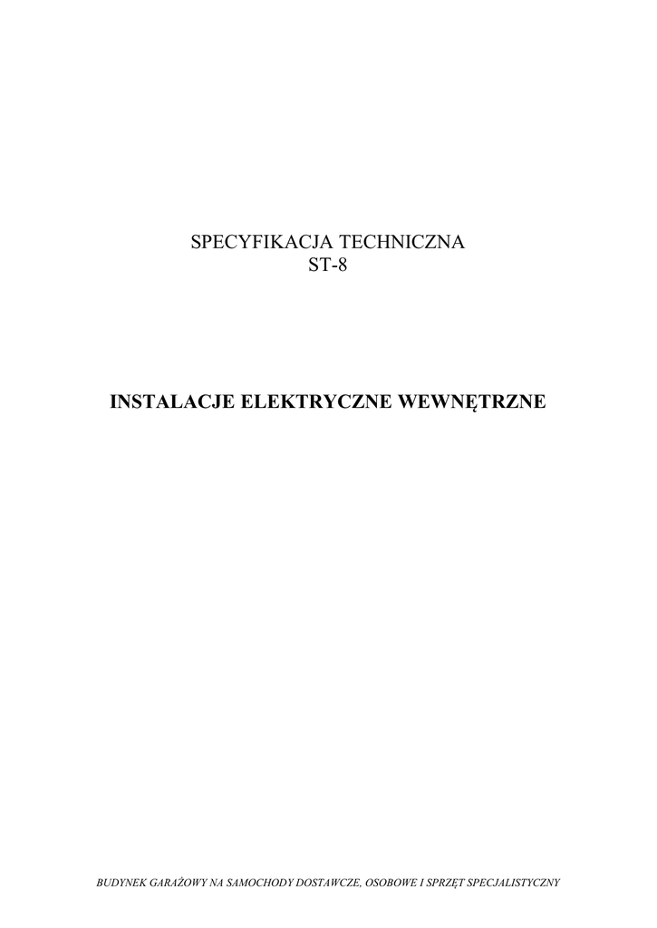 SPECYFIKACJA TECHNICZNA ST-8 INSTALACJE ELEKTRYCZNE WEWNĘTRZNE BUDYNEK GARAŻOWY NA SAMOCHODY DOSTAWCZE, OSOBOWE I SPRZĘT SPECJALISTYCZNY 1. WSTĘP 1.1. Przedmiot S.T. Przedmiotem niniejszej Specyfikacji Technicznej są wymagania dotyczące wykonania i odbioru robót elektrycznych w budynku garażowym na samochody dostawcze, osobowe i sprzęt specjalistyczny przy ulicy Iglastej w Starachowicach. Przedmiotem wykonania są roboty związane z wykonaniem zasilania i instalacji siłowej, instalacji oświetleniowej i odbiorów, instalacji odgromowej. 1.2. Zakres stosowania S.T. Specyfikacja Techniczna jest stosowana jako dokument przetargowy i kontraktowy przy zlecaniu i realizacji robót wymienionych w punkcie 1.1. 1.3. Zakres robót objętych S.T. Ustalenia zawarte w niniejszej Specyfikacji Technicznej dotyczą prowadzenia robót związanych z wykonaniem instalacji elektrycznych zgodnie z dokumentacja projektową, opisami technicznymi, rysunkami i obejmują kompleksowe wykonanie wszelkich niezbędnych robót elektrycznych . 1.4. Określenia podstawowe Określenia podstawowe podane w niniejszej Specyfikacji Technicznej są zgodne z obowiązującymi odpowiednimi normami i ST :. „Wymagania ogólne”. 1.5. Ogólne wymagania dotyczące robót Wykonawca robót jest odpowiedzialny za jakość ich wykonania oraz za zgodność robót z Dokumentacją Projektową, Specyfikacją Techniczną i obowiązującymi normami. Ponadto Wykonawca wykona roboty zgodnie z poleceniami Inżyniera. Ogólne wymagania dotyczące robót podano w ST :. „Wymagania ogólne”. 2. MATERIAŁY Materiałami stosowanymi przy wykonaniu robót według zasad niniejszej specyfikacji ST są materiały wg -zał. wykaz materiałów elektrycznych Materiały do wykonania w/w robót elektrycznych stosować zgodnie z Dokumentacją Projektową, opisami technicznymi i rysunkami. Dostawa materiałów przeznaczonych do robót elektrycznych powinna nastąpić dopiero po odpowiednim przygotowaniu pomieszczeń magazynowych i składowisk na placu budowy. Jeśli jest to konieczne ze względu na rodzaj materiałów, pomieszczenia magazynowe powinny być zamykane, powinny także zabezpieczać materiały od zewnętrznych wpływów atmosferycznych, a w razie potrzeby umożliwiać utrzymanie wewnątrz odpowiedniej temperatury i wilgotności. Place i magazyny zamknięte do składowania materiałów, urządzeń i maszyn (sprzętu zmechanizowanego) stosowanych do robót elektrycznych powinny być wyznaczone na terenie odwodnionym, wyrównanym, o nawierzchni dostosowanej do przeznaczenia i usytuowane w sposób ułatwiający rozładunek, załadunek i ewentualnie montaż wymienionych przedmiotów. BUDYNEK GARAŻOWY NA SAMOCHODY DOSTAWCZE, OSOBOWE I SPRZĘT SPECJALISTYCZNY W czasie transportu i składowania końce wszystkich rodzajów kabli powinny być zabezpieczone przed zawilgoceniem i innymi wpływami środowiska. Materiały, wyroby i urządzenia, dla których wymaga się świadectw jakości, np. aparaty, kable, urządzenia prefabrykowane itp., należy dostarczać wraz ze świadectwami jakości, kartami gwarancyjnymi lub protokołami odbioru technicznego. Przy odbiorze materiałów należy zwrócić uwagę na zgodność stanu faktycznego z dowodami dostawy. 3. SPRZĘT Sprzęt budowlany powinien odpowiadać pod względem typów i ilości wymaganiom zawartym w projekcie organizacji robót, zaakceptowanym przez Inżyniera. Roboty elektroenergetyczne mogą być wykonywane ręcznie lub przy użyciu sprzętu mechanicznego zaakceptowanego przez Inżyniera. Przy mechanicznym wykonywaniu robót Wykonawca powinien dysponować sprzętem sprawnym technicznie, przewidzianym w KNR do wykonania tego typu robót. Roboty ziemne wykonywane w pobliżu istniejących urządzeń podziemnych winny być wykonywane ręcznie. Roboty elektryczne prowadzone będą przy użyciu następującego sprzętu mechanicznego: - podnośnik montażowy PHM samochodowy - żuraw samochodowy do 4t - spawarka elektryczna transformatorowa - elektronarzędzia - rusztowania 4. TRANSPORT Materiały przewidziane do wykonania robót mogą być przewożone dowolnymi środkami transportu z zachowaniem zasad kodeksu drogowego. Dla materiałów długich należy stosować przyczepy dłużycowe, a materiały wysokie należy zabezpieczyć w czasie transportu przed przewróceniem oraz przesuwaniem. Bębny z kablami należy przetaczać zgodnie z kierunkiem strzałki na tabliczce bębna. Unikać transportu kabli w temperaturze niższej od -15°C. W czasie transportu i przechowywania materiałów elektroenergetycznych należy zachować wymagania wynikające ze specjalnych właściwości tych urządzeń, zastrzeżonych przez producenta. W czasie transportu, załadunku i wyładunku oraz składowania aparatury elektrycznej i urządzeń rozdzielczych należy przestrzegać zaleceń wytwórców, a w szczególności: transportowane urządzenia zabezpieczyć przed nadmiernymi drganiami i wstrząsami oraz przesuwaniem się, aparaturę i urządzenia ostrożnie załadowywać i zdejmować, nie narażając ich na uderzenia, ubytki lub uszkodzenia powłok. W czasie transportu końce wszystkich rodzajów kabli powinny być zabezpieczone przed zawilgoceniem i innymi wpływami środowiska. Środki transportu przewidziane do stosowania: - Ciągnik kołowy o mocy 50-63kW, - Samochód dostawczy do 0,9 tony, - Samochód skrzyniowy do 5 ton, - Przyczepa skrzyniowa 3,5 tony, - Przyczepa do przewożenia kabli do 4 ton. BUDYNEK GARAŻOWY NA SAMOCHODY DOSTAWCZE, OSOBOWE I SPRZĘT SPECJALISTYCZNY 5. WYKONANIE ROBÓT 5.1. Wymagania ogólne Ogólne wymagania dotyczące wykonania robót podano w ST WO. „Wymagania ogólne”. 5.1.1. Połączenia elektryczne przewodów - Powierzchnie stykających się elementów torów prądowych oraz przekładek i podkładek metalowych, przewodzących prąd, powinny być dokładnie oczyszczone i wygładzone. - Zanieczyszczone styki (zaciski aparatów, przewody i pokryte powłoką metalową ogniową lub gal