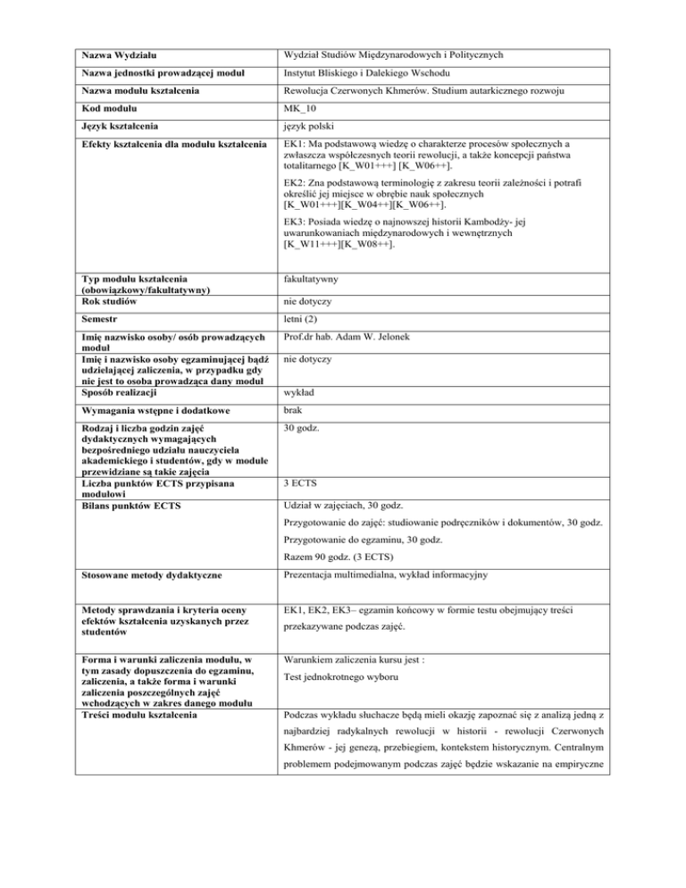 Nazwa Wydziału Wydział Studiów Międzynarodowych i Politycznych Nazwa jednostki prowadzącej moduł Instytut Bliskiego i Dalekiego Wschodu Nazwa modułu kształcenia Rewolucja Czerwonych Khmerów. Studium autarkicznego rozwoju Kod modułu MK_10 Język kształcenia język polski Efekty kształcenia dla modułu kształcenia EK1: Ma podstawową wiedzę o charakterze procesów społecznych a zwłaszcza współczesnych teorii rewolucji, a także koncepcji państwa totalitarnego [K_W01+++] [K_W06++]. EK2: Zna podstawową terminologię z zakresu teorii zależności i potrafi określić jej miejsce w obrębie nauk społecznych [K_W01+++][K_W04++][K_W06++]. EK3: Posiada wiedzę o najnowszej historii Kambodży- jej uwarunkowaniach międzynarodowych i wewnętrznych [K_W11+++][K_W08++]. Typ modułu kształcenia (obowiązkowy/fakultatywny) Rok studiów fakultatywny Semestr letni (2) Imię nazwisko osoby/ osób prowadzących moduł Imię i nazwisko osoby egzaminującej bądź udzielającej zaliczenia, w przypadku gdy nie jest to osoba prowadząca dany moduł Sposób realizacji Prof.dr hab. Adam W. Jelonek Wymagania wstępne i dodatkowe brak Rodzaj i liczba godzin zajęć dydaktycznych wymagających bezpośredniego udziału nauczyciela akademickiego i studentów, gdy w module przewidziane są takie zajęcia Liczba punktów ECTS przypisana modułowi Bilans punktów ECTS 30 godz. nie dotyczy nie dotyczy wykład 3 ECTS Udział w zajęciach, 30 godz. Przygotowanie do zajęć: studiowanie podręczników i dokumentów, 30 godz. Przygotowanie do egzaminu, 30 godz. Razem 90 godz. (3 ECTS) Stosowane metody dydaktyczne Prezentacja multimedialna, wykład informacyjny Metody sprawdzania i kryteria oceny efektów kształcenia uzyskanych przez studentów EK1, EK2, EK3– egzamin końcowy w formie testu obejmujący treści Forma i warunki zaliczenia modułu, w tym zasady dopuszczenia do egzaminu, zaliczenia, a także forma i warunki zaliczenia poszczególnych zajęć wchodzących w zakres danego modułu Treści modułu kształcenia Warunkiem zaliczenia kursu jest : przekazywane podczas zajęć. Test jednokrotnego wyboru Podczas wykładu słuchacze będą mieli okazję zapoznać się z analizą jedną z najbardziej radykalnych rewolucji w historii - rewolucji Czerwonych Khmerów - jej genezą, przebiegiem, kontekstem historycznym. Centralnym problemem podejmowanym podczas zajęć będzie wskazanie na empiryczne przejawy autarkicznego rozwoju; rozważenie, jakie koncepcje postrzegania zmiany społecznej z nim korespondują i w jakich sytuacjach staje się szczególnie atrakcyjny politycznie, jakie są jego zewnętrzne uwarunkowania i co stanowi o jego politycznych niepowodzeniach. Wykaz literatury podstawowej i uzupełniającej, obowiązującej do zaliczenia danego modułu Literatura podstawowa: A.W. Jelonek, Rewolucja Czerwonych Khmerów 1975-1978, Wyd. Scholar, Warszawa 1999 A. W. Jelonek, Kambodża, Wyd. Trio, Warszawa 2008, Literatura uzupełniająca: Wymiar, zasady i forma odbywania praktyk, w przypadku gdy program kształcenia przewiduje praktyki brak Chomsky, N., E. S. Herman. After the Cataclysm: Postwar Indochina and the Reconstruction of Imperial Ideology. Boston 1979., K. Coates Cambodia Now, Life in the Wake of War, New York 2005, B. Kiernan The Pol Pot Regime, Cambridge 2002, D. Chandler A History of Cambodia, New York 2002 Haing S. Ngor, A Cambodian Odyssey (Kambodżańska odyseja), polskie wydanie Wydawnictwo Pomost 1989