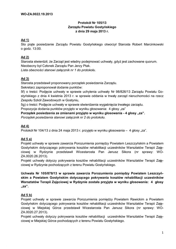 1 WO-ZA.0022.19.2013 Protokół Nr 105/13 Zarządu Powiatu