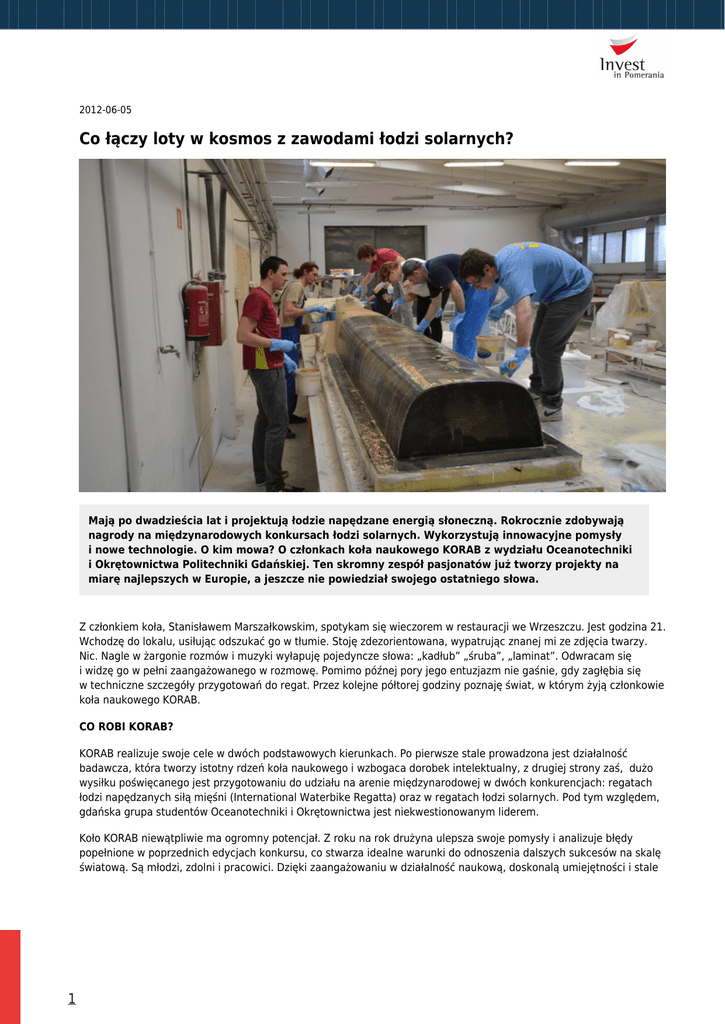 2012-06-05 Co łączy loty w kosmos z zawodami łodzi solarnych? Mają po dwadzieścia lat i projektują łodzie napędzane energią słoneczną. Rokrocznie zdobywają nagrody na międzynarodowych konkursach łodzi solarnych. Wykorzystują innowacyjne pomysły i nowe technologie. O kim mowa? O członkach koła naukowego KORAB z wydziału Oceanotechniki i Okrętownictwa Politechniki Gdańskiej. Ten skromny zespół pasjonatów już tworzy projekty na miarę najlepszych w Europie, a jeszcze nie powiedział swojego ostatniego słowa. Z członkiem koła, Stanisławem Marszałkowskim, spotykam się wieczorem w restauracji we Wrzeszczu. Jest godzina 21. Wchodzę do lokalu, usiłując odszukać go w tłumie. Stoję zdezorientowana, wypatrując znanej mi ze zdjęcia twarzy. Nic. Nagle w żargonie rozmów i muzyki wyłapuję pojedyncze słowa: „kadłub” „śruba”, „laminat”. Odwracam się i widzę go w pełni zaangażowanego w rozmowę. Pomimo późnej pory jego entuzjazm nie gaśnie, gdy zagłębia się w techniczne szczegóły przygotowań do regat. Przez kolejne półtorej godziny poznaję świat, w którym żyją członkowie koła naukowego KORAB. CO ROBI KORAB? KORAB realizuje swoje cele w dwóch podstawowych kierunkach. Po pierwsze stale prowadzona jest działalność badawcza, która tworzy istotny rdzeń koła naukowego i wzbogaca dorobek intelektualny, z drugiej strony zaś, dużo wysiłku poświęcanego jest przygotowaniu do udziału na arenie międzynarodowej w dwóch konkurencjach: regatach łodzi napędzanych siłą mięśni (International Waterbike Regatta) oraz w regatach łodzi solarnych. Pod tym względem, gdańska grupa studentów Oceanotechniki i Okrętownictwa jest niekwestionowanym liderem. Koło KORAB niewątpliwie ma ogromny potencjał. Z roku na rok drużyna ulepsza swoje pomysły i analizuje błędy popełnione w poprzednich edycjach konkursu, co stwarza idealne warunki do odnoszenia dalszych sukcesów na skalę światową. Są młodzi, zdolni i pracowici. Dzięki zaangażowaniu w działalność naukową, doskonalą umiejętności i stale 1 poszerzają wiedzę, co czyni ich najlepszymi specjalistami w wybranej dziedzinie okrętownictwa i, co równie istotne, pozwala na uzyskanie świetnych wyników na międzynarodowych zawodach. ŁODZIE ZA 1 000 000 EURO? Każdorazowe uczestnictwo w regatach wiąże się z długimi przygotowaniami związanymi z projektowaniem i budową szybkich jednostek napędzanych energią słoneczną. Wyróżnia się trzy klasy łodzi: popularna klasa A i B oraz nietypowe i niezwykle kosztowne łodzie klasy Top. Łodzie klasy A mieszczą tylko jedną osobę na pokładzie oraz pięć paneli solarnych, dwuosobowe łodzie klasy B zaopatrzone są w sześć paneli, z kolei cechą charakterystyczną klasy Top jest ograniczenie dotyczące maksymalnej powierzchni zajmowanej prze panele, 8m². - Klasa top musi sama sobie zapewnić panele. Nie może w tym aspekcie liczyć na pomoc organizatorów. W rezultacie zwykle korzysta się z tych, które nie zakwalifikowały się do lotu w kosmos - podkreśla Staszek. Warto również zaznaczyć, że budżet drużyny przeznaczony na łodzie klas A i B wynosi około 20.000 euro, podczas gdy załogi łodzi Top liczą się z kosztami w wysokości do 1 000 000 euro. Dzięki zaradności studentów, udało się przekonać sponsorów, że warto zainwestować. - Nasza grupa wspierana jest przez takie firmy, jak: Energa, Det Norske Veritas, stocznia ModelArt. Co roku KORAB odnosi sukcesy na zawodach, w których startuje. International Waterbike Regatte, Dutch Open Solar Challenge czy Frisian Solar Challenge – to najważniejsze imprezy branżowe. Przy okazji dowiaduję się, że część członków koła wróciła w maju z zawodów International Waterbike Regatta organizowanych w Duisburgu, ponownie przywożąc ze sobą puchar. KORAB zajął drugie miejsce, do zwycięstwa zabrakło im zaledwie dwóch punktów. Trójmiejska drużyna konkurowała m.in. z zespołami z Holandii, Niemiec, Austrii, Turcji i Chorwacji. RECEPTA NA SUKCES Do licznych sukcesów niewątpliwie przyczyniło się wiele czynników. - Jesteśmy dobrzy, dlatego że poświęcamy dużo swojego czasu, a dodatkowo możemy liczyć na wsparcie Politechniki i sponsorów - stwierdza Staszek. Opracowanie tego typu projektu wymaga dużej znajomości złożonych zagadnień związanych z okrętownictwem, których zgłębianie jest czasochłonne. Dlatego właśnie w zespole liczą się umiejętności poszczególnych studentów, którzy są w stanie poświęcić swój czas dla realizacji tego typu projektów. Osoby, które w danej dziedzinie się specjalizują, odpowiedzialne są za wykonanie części projektu z nią związanej. I tak właśnie jeden ze studentów zajmuje się zaprojektowaniem śruby, podczas gdy drugi pracuje przy wykonaniu kadłuba. Takie podejście do procesu, jako całości złożonej z wielu mniejszych zadań, pozwala na osiągnięcie maksymalnej efektywności. SUKCESY 2008 2010 2011 2012 • I miejsce - International Waterbike Regatta w Zagrzebiu • I miejsce – Mistrzostwa Europy Pojazdów Napędzanych Siłą Mięśni Ludzkich • I miejsce – Frisian Solar Challenge • I miejsce – International Waterbike Regatta w Szczecinie • I miejsce – Dutch Open Solar Challenge • II miejsce – International Waterbike Regatta w Hamburgu • II miejsce – International Waterbike Regatta w Duisburgu Magdalena Piechota: Jak organizujecie pracę? Czy wszystko robicie sami? Stanisław Marszałkowski: O wiele łatwiej byłoby opowiedzieć o tym czego nie robimy: nie budujemy sami elektroniki tylko składamy ją w system z gotowych podzespołów dostarczonych od producentów, którzy zapewniają wyższą jakość niż jesteśmy sami w stanie sobie zapewnić. Decydujemy się na wykonywanie samodzielnie tylko tego 2 co jesteśmy w stanie zrobić lepiej i taniej. MP: Ile trwają przygotowania do zawodów? SM: Rozpoczynamy praktycznie od razu po zakoń