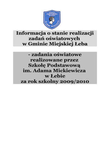 Informacja o stanie realizacji zadań oświatowych w Gminie Miejskiej Łeba - zadania oświatowe realizowane przez Szkołę Podstawową im. Adama Mickiewicza w Łebie za rok szkolny 2009/2010 Informacja o stanie realizacji zadań oświatowych w Gminie Miejskiej Łeba za rok szkolny 2009/2010 – realizacja zadań oświatowych w Szkole Podstawowej, zawiera dane pochodzące z wielu szczegółowych analiz, raportów i sprawozdań i analiz dotyczących działalności Szkoły. Informacja ma na celu pełną informację o realizacji zadań oświatowych określonych w art. 5a ustawy z dnia 7 września 1991 r. o systemie oświaty (t.j. Dz. U. z 2004, Nr 256, poz. 2572 z późn. zm.), tj. kształcenia, wychowania i opieki, w tym profilaktyki społecznej. Zgodnie z przepisami w/w ustawy środki niezbędne na realizację zadań oświatowych, w tym na wynagrodzenia nauczycieli oraz utrzymanie szkół zagwarantowane są w dochodach gminy. Dane zawarte w niniejszej informacji przedstawiają liczbowo i analitycznie zagadnienia wynikające z ustawowych zadań oświatowych określonych w art. 5a ustawy o systemie oświaty. ODDZIAŁ PRZEDSZKOLNY Wychowanie przedszkolne może być realizowane w przedszkolach, oddziałach przedszkolnych w szkołach podstawowych oraz – w przypadku dzieci 3-5 letnich – także w innych formach wychowania przedszkolnego. Wychowanie przedszkolne obejmuje dzieci w wieku 3-6 lat. W uzasadnionych przypadkach do przedszkola może zostać przyjęte dziecko, które ukończyło 2,5 roku. Decyzje o przyjęciu podejmuje Kierownik OP oceniając wcześniej stopień osiągnięcia przez dziecko gotowości przedszkolnej. Każdy taki przypadek rozpatrywany jest indywidualnie. W przypadku dzieci posiadających orzeczenie o potrzebie kształcenia specjalnego wychowaniem przedszkolnym można objąć dziecko w wieku powyżej 6 lat, nie dłużej jednak niż do końca roku szkolnego w tym roku kalendarzowym, w którym dziecko kończy 10 lat. Przedszkola publiczne (samorządowe i prowadzone przez inne podmioty) oraz oddziały przedszkolne przy szkołach publicznych (samorządowych i prowadzonych przez inne podmioty) zapewniają bezpłatne nauczanie i wychowanie w zakresie podstawy programowej wychowania przedszkolnego prowadzone przez nauczycieli posiadających odpowiednie kwalifikacje, a także przeprowadzają rekrutację dzieci zgodnie z zasadą powszechnej dostępności. 2 W OP działają trzy grupy, liczba dzieci w poszczególnych grupach w roku szkolnym 2009/2010 przedstawiała się następująco: Wykres 1: Liczba dzieci w Oddziale Przedszkolnym w poszczególnych grupach w roku szkolnym 2009/2010 6 latki; 19 3-4 latki; 25 4-5 latki; 18 3-4 latki 4-5 latki 6 latki Opracowanie własne na podstawie danych własnych. Z 62 liczby dzieci w Oddziale Przedszkolnym dzieci w przedziale wiekowym 3-4 lat stanowią 40,32 % ogólnej liczby. Liczba dzieci podlegająca obowiązkowi rocznego przygotowania przedszkolnego wyniosła w roku szk. 2009/2010 – 39 dzieci, z tego 1 dziecko realizowało już obowiązek szkolny. Oddziały Przedszkolne pracują w godzinach 7.00 do 15.30. Jako placówka nieferyjna funkcjonują także w okresie wakacji letnich. Praca wychowawczo-dydaktyczna i opiekuńcza prowadzona była na podstawie programów wychowania przedszkolnego zgodnych z nowa podstawą programową: Realizacja zadań następuje poprzez: − kształtowanie i rozwijanie otwartości dziecka wobec siebie, innych ludzi, świata i wobec życia, − wspomaganie i ukierunkowywanie rozwoju dziecka z wykorzystaniem jego wrodzonego potencjału i możliwości rozwojowych, − dostosowanie treści, psychofizycznych metod dzieci, a i organizacji także nauczania umożliwianie do korzystania możliwości z opieki psychologicznej i specjalnych form pracy dydaktycznej, 3 − doprowadzenie dziecka do takiego stopnia rozwoju psychofizycznego jaki jest niezbędny do podjęcia nauki w szkole, − udzielanie pomocy rodzinie w opiece i wychowaniu dziecka. W grypie II (grupa 4-5 - latków) i III (grupa 6-latków) prowadzona była diagnoza szkolna celem analizy gotowości dziecka do podjęcia nauki w szkole. Wszystkie dzieci z grupy III podjęły naukę w szkole podstawowej w roku szkolnym 2010/2011. W roku szkolnym 2009/2010 pracą wyrównawczą objętych było 3 dzieci w grupie III. Liczba dzieci objętych opieką logopedyczną wynosiła w grupach: III – 13 osób, II – 5 osób, natomiast w grupie I -3. Dzieci ze wszystkich grup uczestniczyły w : − koncertach muzycznych, spotkaniach z magikiem zorganizowanych na terenie oddziałów, − teatrzykach zorganizowanych na terenie szkoły, − wycieczce autokarowej z okazji Dnia Dziecka w miejscowości Mausz, gdzie uczestniczyły w programie „Kubuś Puchatek i Przyjaciel” przygotowanym przez agencję „Przygoda” − były w łebskim kinie, na filmie dla dzieci − zajęciach z zakresu pierwszej pomocy − spotkaniu z policjantem dotyczącym bezpieczeństwa wśród dzieci Przedszkolaki przygotowały i brały udział w różnego rodzaju uroczystościach, w tym m.in. Uroczystości z okazji Dnia Seniora w Łebie, Spotkaniu Opłatkowym z rodzicami, Uroczystości Dnia Dziadka i Babci oraz Balu Karnawałowy, Topienie Marzanny – przywitanie wiosny, Uroczystości z okazji Dnia Matki i Ojca, Uroczystości „ Pożegnania starszaków”. Oddziały nawiązały współpracę z Klubem Seniora „ Niezapominajka” w Łebie, co obfituje w szczególności: co miesięcznymi spotkaniami seniorów z przedszkolakami na wzór akcji „Cała Polska czyta dzieciom”, wspólnym topieniem Marzanny w pierwszym dniu wiosny, a także występami przed dziećmi z literaturą dziecięcą z okazji Dnia Dziecka. Dzieci z OP w roku szkolnym 2009/2010 brały udział w konkursach: − plastycznym” Moja mała ojczyzna. Rodzina i ja zorganizowanym przez MOPS w Łebie i GOPS w Wicku (dzieci wszystkich grup) oraz w konkursie pod tytułem „ Wiatr, wypadek, ogień, woda” (starszaki) –otrzymały tu miejsca na