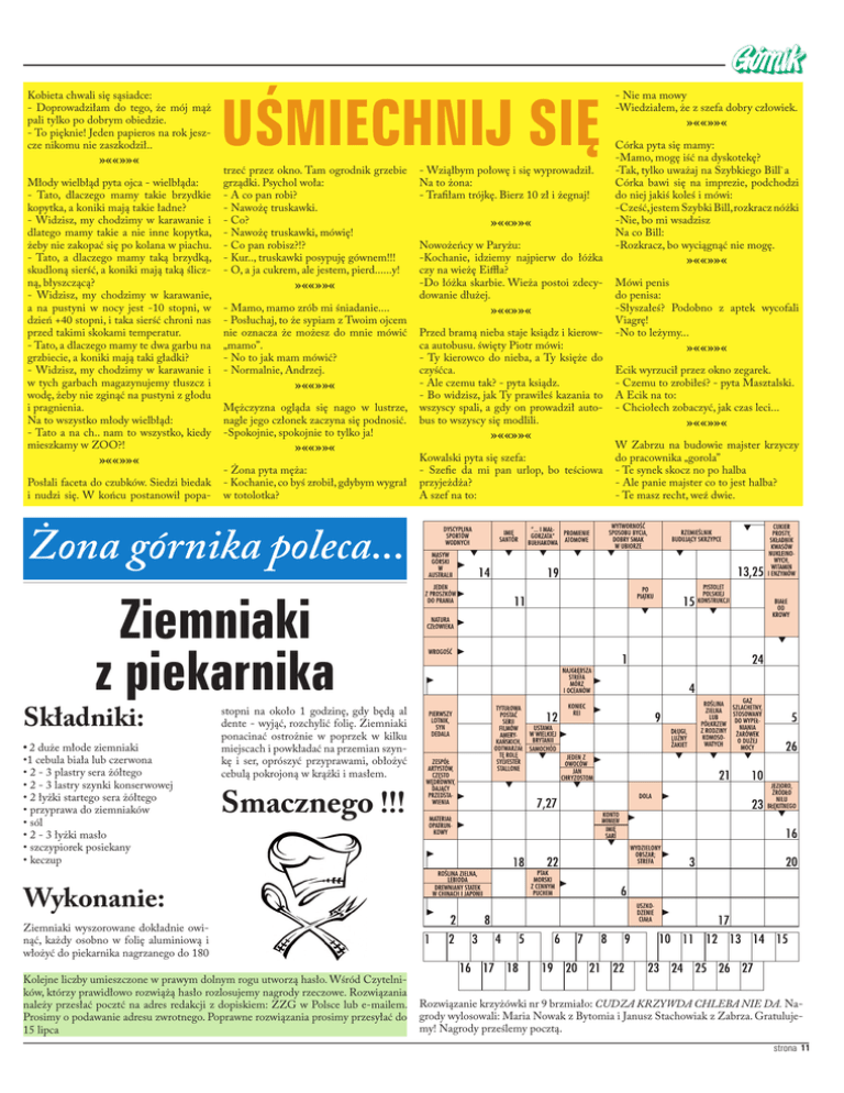 Kobieta chwali się sąsiadce: - Doprowadziłam do tego, że mój mąż pali tylko po dobrym obiedzie. - To pięknie! Jeden papieros na rok jeszcze nikomu nie zaszkodził.. »««»»« Młody wielbłąd pyta ojca - wielbłąda: - Tato, dlaczego mamy takie brzydkie kopytka, a koniki mają takie ładne? - Widzisz, my chodzimy w karawanie i dlatego mamy takie a nie inne kopytka, żeby nie zakopać się po kolana w piachu. - Tato, a dlaczego mamy taką brzydką, skudloną sierść, a koniki mają taką śliczną, błyszczącą? - Widzisz, my chodzimy w karawanie, a na pustyni w nocy jest -10 stopni, w dzień +40 stopni, i taka sierść chroni nas przed takimi skokami temperatur. - Tato, a dlaczego mamy te dwa garbu na grzbiecie, a koniki mają taki gładki? - Widzisz, my chodzimy w karawanie i w tych garbach magazynujemy tłuszcz i wodę, żeby nie zginąć na pustyni z głodu i pragnienia. Na to wszystko młody wielbłąd: - Tato a na ch.. nam to wszystko, kiedy mieszkamy w ZOO?! »««»»« Posłali faceta do czubków. Siedzi biedak i nudzi się. W końcu postanowił popa- UŚMIECHNIJ SIĘ trzeć przez okno. Tam ogrodnik grzebie grządki. Psychol woła: - A co pan robi? - Nawożę truskawki. - Co? - Nawożę truskawki, mówię! - Co pan robisz?!? - Kur.., truskawki posypuję gównem!!! - O, a ja cukrem, ale jestem, pierd......y! »««»»« - Mamo, mamo zrób mi śniadanie.... - Posłuchaj, to że sypiam z Twoim ojcem nie oznacza że możesz do mnie mówić „mamo”. - No to jak mam mówić? - Normalnie, Andrzej. »««»»« Mężczyzna ogląda się nago w lustrze, nagle jego członek zaczyna się podnosić. -Spokojnie, spokojnie to tylko ja! »««»»« - Żona pyta męża: - Kochanie, co byś zrobił, gdybym wygrał w totolotka? - Wziąłbym połowę i się wyprowadził. Na to żona: - Trafiłam trójkę. Bierz 10 zł i żegnaj! »««»»« Nowożeńcy w Paryżu: -Kochanie, idziemy najpierw do łóżka czy na wieżę Eiffla? -Do łóżka skarbie. Wieża postoi zdecydowanie dłużej. »««»»« Przed bramą nieba staje ksiądz i kierowca autobusu. święty Piotr mówi: - Ty kierowco do nieba, a Ty księże do czyśćca. - Ale czemu tak? - pyta ksiądz. - Bo widzisz, jak Ty prawiłeś kazania to wszyscy spali, a gdy on prowadził autobus to wszyscy się modlili. »««»»« Kowalski pyta się szefa: - Szefie da mi pan urlop, bo teściowa przyjeżdża? A szef na to: - Nie ma mowy -Wiedziałem, że z szefa dobry człowiek. »««»»« Córka pyta się mamy: -Mamo, mogę iść na dyskotekę? -Tak, tylko uważaj na Szybkiego Bill`a Córka bawi się na imprezie, podchodzi do niej jakiś koleś i mówi: -Cześć, jestem Szybki Bill, rozkracz nóżki -Nie, bo mi wsadzisz Na co Bill: -Rozkracz, bo wyciągnąć nie mogę. »««»»« Mówi penis do penisa: -Słyszałeś? Podobno z aptek wycofali Viagrę! -No to leżymy... »««»»« Ecik wyrzucił przez okno zegarek. - Czemu to zrobiłeś? - pyta Masztalski. A Ecik na to: - Chciołech zobaczyć, jak czas leci... »««»»« W Zabrzu na budowie majster krzyczy do pracownika „gorola” - Te synek skocz no po halba - Ale panie majster co to jest halba? - Te masz recht, weź dwie. Żona górnika poleca... Ziemniaki z piekarnika Składniki: • 2 duże młode ziemniaki •1 cebula biała lub czerwona • 2 - 3 plastry sera żółtego • 2 - 3 lastry szynki konserwowej • 2 łyżki startego sera żółtego • przyprawa do ziemniaków • sól • 2 - 3 łyżki masło • szczypiorek posiekany • keczup stopni na około 1 godzinę, gdy będą al dente - wyjąć, rozchylić folię. Ziemniaki ponacinać ostrożnie w poprzek w kilku miejscach i powkładać na przemian szynkę i ser, oprószyć przyprawami, obłożyć cebulą pokrojoną w krążki i masłem. Smacznego !!! Wykonanie: Ziemniaki wyszorowane dokładnie owinąć, każdy osobno w folię aluminiową i włożyć do piekarnika nagrzanego do 180 Kolejne liczby umieszczone w prawym dolnym rogu utworzą hasło. Wśród Czytelników, którzy prawidłowo rozwiążą hasło rozlosujemy nagrody rzeczowe. Rozwiązania należy przesłać pocztć na adres redakcji z dopiskiem: ZZG w Polsce lub e-mailem. Prosimy o podawanie adresu zwrotnego. Poprawne rozwiązania prosimy przesyłać do 15 lipca Rozwiązanie krzyżówki nr 9 brzmiało: CUDZA KRZYWDA CHLEBA NIE DA. Nagrody wylosowali: Maria Nowak z Bytomia i Janusz Stachowiak z Zabrza. Gratulujemy! Nagrody prześlemy pocztą. strona 11