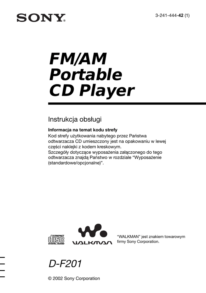 3-241-444-42 (1) FM/AM Portable CD Player Instrukcja obsługi Informacja na temat kodu strefy Kod strefy użytkowania nabytego przez Państwa odtwarzacza CD umieszczony jest na opakowaniu w lewej części naklejki z kodem kreskowym. Szczegóły dotyczące wyposażenia załączonego do tego odtwarzacza znajdą Państwo w rozdziale “Wyposażenie (standardowe/opcjonalne)”. “WALKMAN” jest znakiem towarowym firmy Sony Corporation. D-F201 © 2002 Sony Corporation OSTRZEŻENIE Aby zapobiec niebezpieczeństwu pożaru lub porażenia prądem elektrycznym, nie należy narażać tego urządzenia na działanie deszczu lub wilgoci. Nie instaluj urządzenia w przestrzeni zabudowanej, jak szafka na książki czy wbudowana półka. Aby zabezpieczyć się przed pożarem nie zasłaniaj otworów wentylacyjnych urządzenia gazetami, serwetami, zasłonami itp. Nie ustawiaj na urządzeniu zapalonych świec. Aby zabezpieczyć się przed pożarem lub porażeniem prądem elektrycznym nie umieszczaj na urządzeniu obiektów wypełnionych cieczami, fakich jak wazony. Niektóre państwa mogą określać zasady użytkowania baterii używanych do zasilania tego wyrobu. Prosimy o stosowanie się do lokalnych przepisów obowiązujących w Państwa kraju. PRZESTROGA • OTWARTE URZĄDZENIE EMITUJE NIEWIDZIALNE PROMIENIOWANIE LASEROWE • NIE NALEŻY WPATRYWAĆ SIĘ W WIĄZKĘ LASEROWĄ ANI PATRZEĆ BEZPOŚREDNIO NA PRZYRZĄDY OPTYCZNE Znak CE ma zastosowanie tylko do produktów sprzedawanych w Unii Europejskiej. 2 Spis treści Wiadomości wstępne Rozmieszczenie elementów sterujących ........................................ 4 Odtwarzanie płyt CD 1. Podłączanie odtwarzacza CD. .......... 6 2. Wkładanie płyty CD. .......................... 6 3. Odtwarzanie płyty CD. ...................... 6 Podłączanie odtwarzacza CD Podłączanie do zestawu stereofonicznego ............................. 17 Podłączanie źródła zasilania Korzystanie z baterii suchych ............. 18 Uwagi dotyczące źródła zasilania ....... 19 Informacje dodatkowe Opcje odtwarzania .................. 9 Korzystanie z radia Słuchanie audycji radiowych .............. 10 Programowanie stacji radiowych ........ 12 Słuchanie zaprogramowanych stacji radiowych ........................................ 13 Środki ostrożności .............................. 20 Konserwacja ....................................... 20 Rozwiązywanie problemów ................ 21 Dane techniczne ................................. 23 Wyposażenie (standardowe/ opcjonalne) .................... Tylna okładka Dostępne funkcje Optymalne zabezpieczenie przed przeskakiwaniem dźwięku (funkcja ESP MAX) .......................... 14 Uwydatnianie basów (funkcja SOUND) ............................. 14 Ochrona słuchu (funkcja AVLS) ........... 15 Blokowanie przycisków (funkcja HOLD) ................................ 15 Wyłączanie sygnału akustycznego ..... 16 3 Wiadomości wstępne Rozmieszczenie elementów sterujących Szczegółowe informacje można znaleźć na stronach podanych w nawiasach. Odtwarzacz CD (przód) 1 Gniazdo i (słuchawkowe) (strona 6) 2 Przycisk OPEN (strona 6) 3 Przycisk SOUND/ PRESET – (strony 12 - 14) 4 Regulator VOLUME* (strona 6) 5 Przycisk MENU/ PRESET + (strony 9, 12, 13) 8 Przycisk u** (Odtwarzanie/Pauza) (strony 6, 7) 9 Przycisk x (Zatrzymanie)•RADIO OFF (strony 7, 10, 12, 16) 0 Otwory na pasek qa Gniazdo DC IN 4.5 V (wejście zasilania zewnętrznego) (strona 6) qs Przyciski ./> (AMS/ wyszukiwanie)•TUNE –/+ (strony 7, 9, 10, 12) 6 Przycisk RADIO ON•BAND/MEMORY (strony 10 - 13) 7 Wyświetlacz (strony 9 - 15) qd Przełącznik HOLD (strona 15) * Obok regulatora VOLUME znajduje się wypukły punkt wskazujący kierunek zwiększania głośności. ** Na przycisku znajduje się wypukły punkt. 4 Odtwarzacz CD (wnętrze) Odtwarzacz CD (z tyłu) qh Przełącznik MONO/ST (stereo) (strona 11) Wiadomości wstępne qf Przełącznik ESP (strona 14) qg Przełącznik AVLS (strona 15) qj Komora baterii (strona 18) 5 Odtwarzanie płyt CD Jako źródła zasilania można także używać baterii suchych. 1. Podłączanie odtwarzacza CD. do gniazda prądu zmiennego 1 Podłączyć zasilacz prądu zmiennego. 2 Podłączyć słuchawki/ minisłuchawki. do gniazda DC IN 4.5 V Zasilacz prądu zmiennego do i (słuchawek) Słuchawki lub minisłuchawki 2. Przycisk u Wkładanie płyty CD. 1 Naciśnij przycisk OPEN i otwórz pokrywę urządzenia. Przycisk OPEN 2 Umieścić płytę CD na talerzu i zamknąć osłonę. Stroną z nadrukiem skierowaną ku górze 6 3. Odtwarzanie płyty CD. Nacisnąć przycisk u. Ustaw poziom głośności. Aby Rozpocząć odtwarzanie (od miejsca, w którym zostało zatrzymane) Rozpocząć odtwarzanie (od pierwszego utworu) Nacisnąć u Odtwarzanie płyt CD Wstrzymać odtwarzanie Zatrzymać odtwarzanie Znaleźć początek aktualnie odtwarzanego utworu (AMS*1) Znaleźć początki poprzednich utworów (AMS) Znaleźć początek następnego utworu (AMS) u przez co najmniej 2 sekundy u x*2 .jednokrotnie szybko*2 .wielokrotnie*2, *3 > jednokrotnie szybko*2, *3 Znaleźć początki kolejnych utworów (AMS) Przewinąć wstecz Przewinąć do przodu > wielokrotnie*2, *3 Przytrzymać .*2 Przytrzymać >*2 *1 Funkcja Automatic Music Sensor (Automatyczny sensor muzyki) *2 Czynności tych można dokonywać podczas odtwarzania płyty oraz podczas pauzy w odtwarzaniu. *3 Po zakończeniu odtwarzania ostatniego utworu można powrócić na początek pierwszego utworu, naciskając przycisk >. Podobnie podczas odtwarzania pierwszego utworu można znaleźć ostatni utwór, naciskając przycisk .. Wyświetlanie • Jeśli po zmianie płyty CD lub po wyłączeniu i ponownym włączeniu odtwarzacza naciśnięty zostanie przycisk u na około 2 sekundy, pojawia się całkowita liczba utworów znajdujących się na płycie CD. • Podczas odtwarzania pojawia się numer utworu i czas, który upłynął od początku bieżącego utworu. • Podczas pauzy w odtwarzan