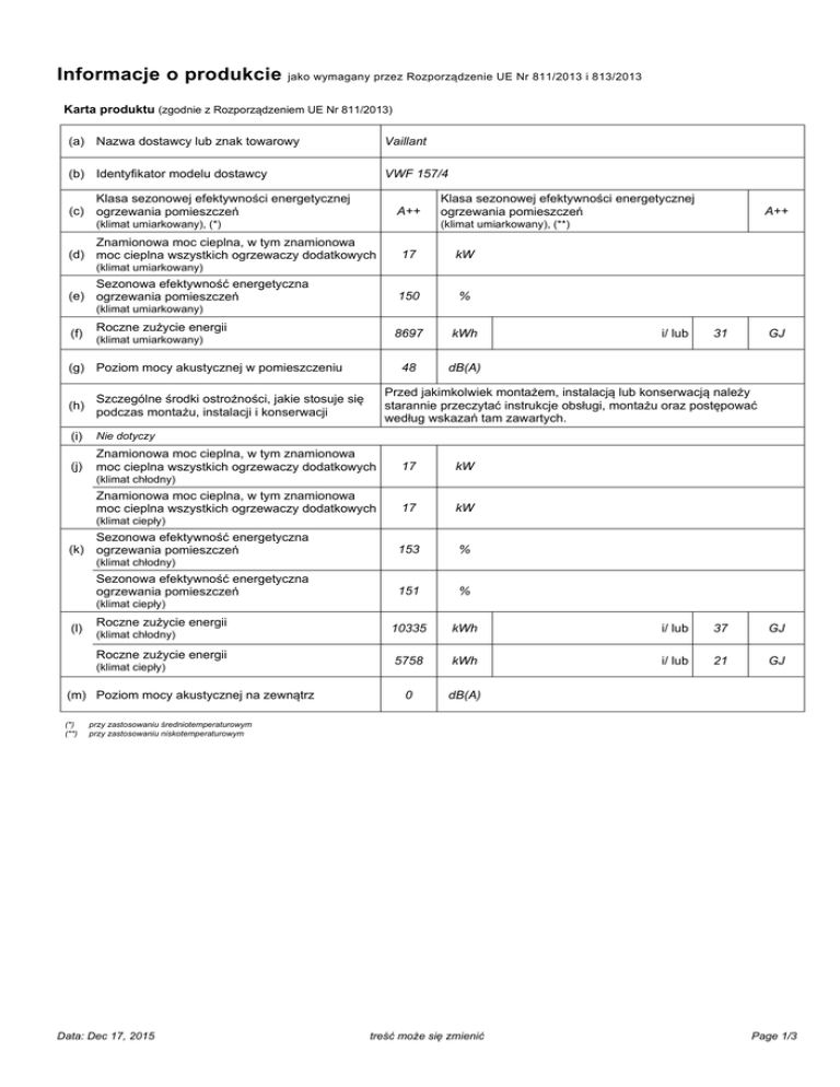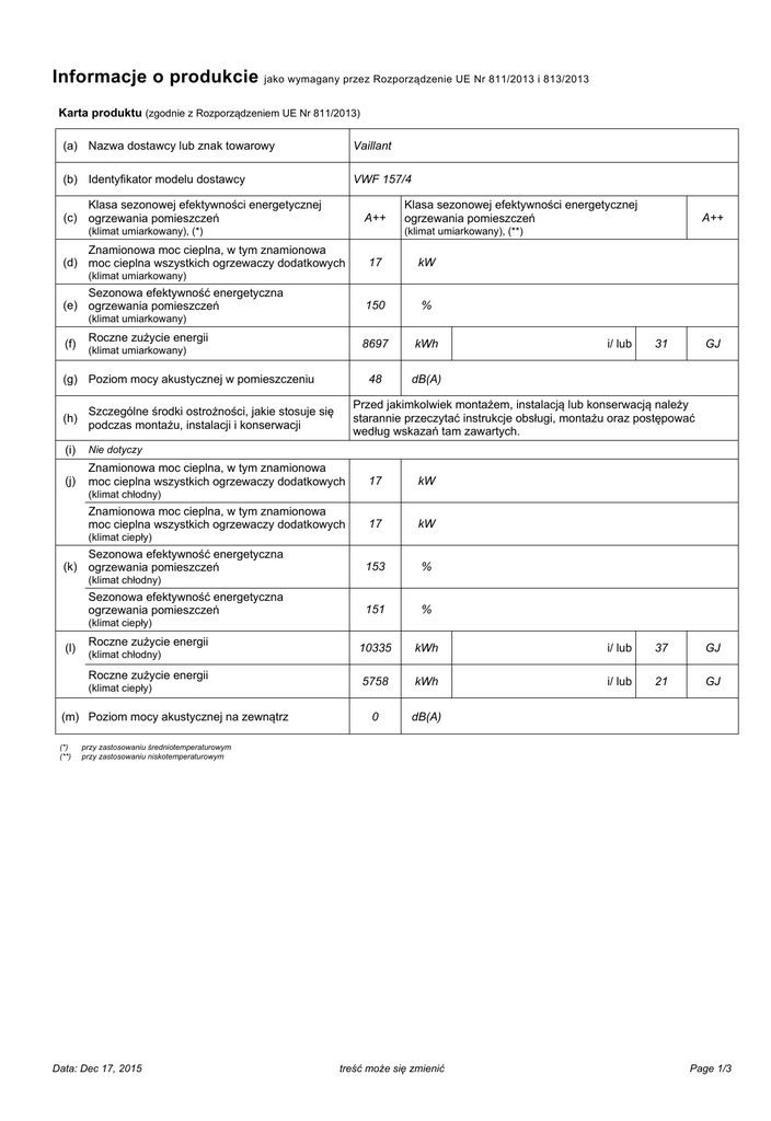 Informacje o produkcie jako wymagany przez Rozporządzenie UE Nr 811/2013 i 813/2013 Karta produktu (zgodnie z Rozporządzeniem UE Nr 811/2013) (a) Nazwa dostawcy lub znak towarowy Vaillant (b) Identyfikator modelu dostawcy VWF 157/4 Klasa sezonowej efektywności energetycznej (c) ogrzewania pomieszczeń A++ (klimat umiarkowany), (*) Klasa sezonowej efektywności energetycznej ogrzewania pomieszczeń A++ (klimat umiarkowany), (**) Znamionowa moc cieplna, w tym znamionowa (d) moc cieplna wszystkich ogrzewaczy dodatkowych 17 kW 150 % 8697 kWh 48 dB(A) (klimat umiarkowany) Sezonowa efektywność energetyczna (e) ogrzewania pomieszczeń (klimat umiarkowany) (f) Roczne zużycie energii (klimat umiarkowany) (g) Poziom mocy akustycznej w pomieszczeniu i/ lub 31 GJ Przed jakimkolwiek montażem, instalacją lub konserwacją należy starannie przeczytać instrukcje obsługi, montażu oraz postępować według wskazań tam zawartych. (h) Szczególne środki ostrożności, jakie stosuje się podczas montażu, instalacji i konserwacji (i) Nie dotyczy (j) Znamionowa moc cieplna, w tym znamionowa moc cieplna wszystkich ogrzewaczy dodatkowych 17 kW 17 kW 153 % 151 % 10335 kWh i/ lub 37 GJ 5758 kWh i/ lub 21 GJ 0 dB(A) (klimat chłodny) Znamionowa moc cieplna, w tym znamionowa moc cieplna wszystkich ogrzewaczy dodatkowych (klimat ciepły) Sezonowa efektywność energetyczna (k) ogrzewania pomieszczeń (klimat chłodny) Sezonowa efektywność energetyczna ogrzewania pomieszczeń (klimat ciepły) (l) Roczne zużycie energii (klimat chłodny) Roczne zużycie energii (klimat ciepły) (m) Poziom mocy akustycznej na zewnątrz (*) (**) przy zastosowaniu średniotemperaturowym przy zastosowaniu niskotemperaturowym Data: Dec 17, 2015 treść może się zmienić Page 1/3 Wymagania informacji o produkcie (zgodnie z Rozporządzeniem UE Nr 813/2013) Model VWF 157/4 Pompa ciepła typu powietrze/ woda nie Niskotemperaturowa pompa ciepła Pompa ciepła woda/ woda nie Wyposażony w ogrzewacz dodatkowy tak Pompa ciepła solanka/ woda tak Ogrzewacz wielofunkcyjny z pompa ciepła nie Parametr Znamionowa moc cieplna (*) Symbol Wartość Prated 17 Jednostka kW Deklarowana wydajność grzewcza przy częściowym obciążeniu w temperaturze pomieszczenia 20 °C i temperaturze zewnętrznej Tj Parametr nie Symbol Sezonowa efektywność energetyczna ogrzewania pomieszczeń ɳs Wartość Jednostka 150 % Deklarowany wskaźnik efektywności lub wskaźnik zużycia energii pierwotnej przy częściowym obciążeniu w temperaturze pomieszczenia 20 °C i temperaturze zewnętrznej Tj Tj = -7 °C Pdh 14,7 kW Tj = -7 °C COPd 3,4 - Tj = +2 °C Pdh 14,6 kW Tj = +2 °C COPd 3,9 - Tj = +7 °C Pdh 14,6 kW Tj = +7 °C COPd 4,3 - Tj = +12 °C Pdh 14,5 kW Tj = +12 °C COPd 4,8 - Tj = temperatura dwuwartościowa Pdh 14,7 kW Tj = temperatura dwuwartościowa COPd 3,4 - Tj = graniczna temperatura robocza Pdh 14,7 kW Tj = graniczna temperatura robocza COPd 3,3 - Dla pomp ciepła powietrze/ woda: Tj = -15 °C (jeżeli TOL < -20 °C) Pdh 14,8 kW Dla pomp ciepła powietrze/ woda: Tj = -15 °C (jeżeli TOL < -20 °C) COPd 3,0 - temperatura dwuwartościowa Tbiv -7 °C Dla pomp ciepła powietrze/ woda: Graniczna temperatura robocza TOL 0,0 °C Wydajność w okresie cyklu w interwale dla ogrzewania Pcych 0,0 kW Efektywność energetyczna cyklu COPcyc 0 - Współczynnik strat (**) Cdh 0,0 - Graniczna temperatura robocza dla podgrzewania wody WTOL 65 °C Psup 1,9 kW Pobór mocy w trybach innych niż aktywny Dodatkowy ogrzewacz Tryb wyłączenia POFF 0,007 kW Znamionowa moc cieplna (*) Tryb wyłączonego termostatu PTO 0,007 kW Rodzaj pobieranej energii Pobór mocy w stanie czuwania PSB 0,007 kW W trybie wyłączonej grzałki karteru PCK 0,000 kW elektryczność Pozostałe parametry mieszany Regulacja wydajności Poziom mocy akustycznej w pomieszczeniu/ na zewnątrz LWA 48/ 0 dB Emisja tlenków azotu NOx 0 mg/ kWh Regulacja wydajności - 2 m³/h Dla pomp ciepła solanka/ woda Znamionowe natężenie przepływu solanki lub wody, zewnętrzny wymiennik ciepła - 2 m³/h Vaillant, Vaillant GmbHBerghauser Str. 4042859 RemscheidGermany Szczególne środki ostrożności, jakie stosuje się podczas montażu, instalacji lub konserwacji ogrzewacza; istotne informacje dotyczące demontażu, recyklingu i/ lub usuwania pod koniec przydatności do użycia (*) Dla pomp ciepła powietrze/ woda: Znamionowy przepływ powietrza, na zewnątrz Przed jakimkolwiek montażem, instalacją lub konserwacją należy starannie przeczytać instrukcje obsługi, montażu oraz postępować według wskazań tam zawartych. Przed demontażem, recyklingiem i/ lub usuwaniem pod koniec przydatności do użycia należy starannie przeczytać instrukcje obsługi, montażu oraz postępować według wskazań tam zawartych. W przypadku ogrzewaczy pomieszczeń z pompą ciepła i wielofunkcyjnych ogrzewaczy z pompą ciepła znamionowa moc cieplna Prated jest równa obciążeniu obliczeniowemu dla trybu ogrzewania Pdesignh, a znamionowa moc cieplna ogrzewacza dodatkowego Psup jest równa dodatkowej wydajności grzewczej dla trybu ogrzewania sup(Tj). Data: Dec 17, 2015 treść może się zmienić Page 2/3 (**) Jeżeli współczynnik Cdh nie został wyznaczony przez pomiar, współczynnik strat przyjmuje wartość domyślną Cdh=0,9. Parametry podaje się dla zastosowań w średnich temperaturach, z wyjątkiem pomp niskotemperaturowych. W przypadku niskotemperaturowych pomp ciepła parametry podaje się dla zastosowań w niskich temperaturach. Wszystkie parametry podaje się dla warunków klimatu umiarkowanego. Data: Dec 17, 2015 treść może się zmienić Page 3/3