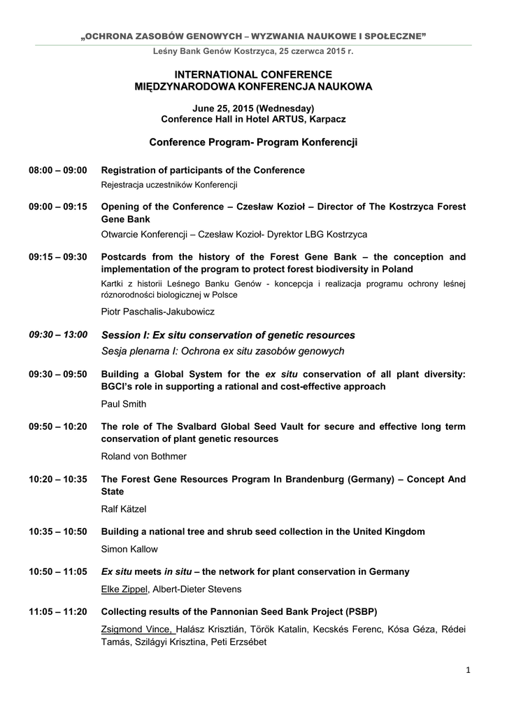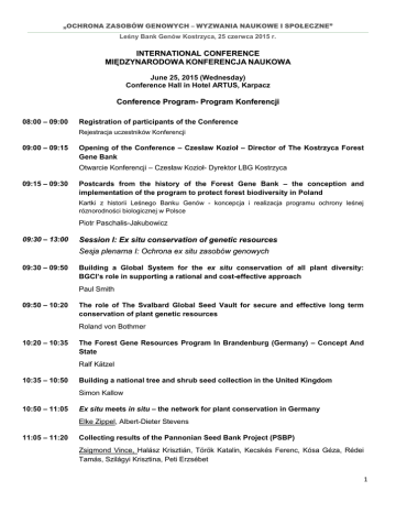 „OCHRONA ZASOBÓW GENOWYCH – WYZWANIA NAUKOWE I SPOŁECZNE” Leśny Bank Genów Kostrzyca, 25 czerwca 2015 r. INTERNATIONAL CONFERENCE MIĘDZYNARODOWA KONFERENCJA NAUKOWA June 25, 2015 (Wednesday) Conference Hall in Hotel ARTUS, Karpacz Conference Program- Program Konferencji 08:00 – 09:00 Registration of participants of the Conference Rejestracja uczestników Konferencji 09:00 – 09:15 Opening of the Conference – Czesław Kozioł – Director of The Kostrzyca Forest Gene Bank Otwarcie Konferencji – Czesław Kozioł- Dyrektor LBG Kostrzyca 09:15 – 09:30 Postcards from the history of the Forest Gene Bank – the conception and implementation of the program to protect forest biodiversity in Poland Kartki z historii Leśnego Banku Genów - koncepcja i realizacja programu ochrony leśnej róznorodności biologicznej w Polsce Piotr Paschalis-Jakubowicz 09:30 – 13:00 Session I: Ex situ conservation of genetic resources Sesja plenarna I: Ochrona ex situ zasobów genowych 09:30 – 09:50 Building a Global System for the ex situ conservation of all plant diversity: BGCI’s role in supporting a rational and cost-effective approach Paul Smith 09:50 – 10:20 The role of The Svalbard Global Seed Vault for secure and effective long term conservation of plant genetic resources Roland von Bothmer 10:20 – 10:35 The Forest Gene Resources Program In Brandenburg (Germany) – Concept And State Ralf Kätzel 10:35 – 10:50 Building a national tree and shrub seed collection in the United Kingdom Simon Kallow 10:50 – 11:05 Ex situ meets in situ – the network for plant conservation in Germany Elke Zippel, Albert-Dieter Stevens 11:05 – 11:20 Collecting results of the Pannonian Seed Bank Project (PSBP) Zsigmond Vince, Halász Krisztián, Török Katalin, Kecskés Ferenc, Kósa Géza, Rédei Tamás, Szilágyi Krisztina, Peti Erzsébet 1 „OCHRONA ZASOBÓW GENOWYCH – WYZWANIA NAUKOWE I SPOŁECZNE” Leśny Bank Genów Kostrzyca, 25 czerwca 2015 r. 11:20 – 11:45 Coffee break -Przerwa kawowa 11:45 – 12:00 Cryopreservation of genetic resources in The Kostrzyca Forest Gene Bank (Poland) Kriogeniczne przechowywanie zasobów genowych w Leśnym Banku Genów Kostrzyca Paweł Chmielarz, Marcin Michalak, Małgorzata Pałucka, Paulina Hrydziuszko, Urszula Wasileńczyk 12:00 – 12:15 Gene pool conserved at common-garden experimental sites of the Institute of Dendrology, Polish Academy of Scientists in Kórnik, Poland Zachowanie zasobów genowych na powierzchniach doświadczalnych Instytutu Dendrologii PAN w Kórniku Daniel Chmura, Roman Rożkowski, Marzena Guzicka, Władysław Chałupka 12:15 – 12:30 Gene resources of native species of the genus Linum L. in ex situ collections in Poland Zasoby genowe rodzimych gatunków z rodzaju Linum L w kolekcjach ex situ w Polsce Magdalena Kluza-Wieloch, Justyna Wiland-Szymańska, Alicja Kolasińska 12:30 – 12:45 The use of in vitro culture and liquid nitrogen for conservation of fern genetic resources Wykorzystanie kultur in vitro i ciekłego azotu do zabezpieczenia zasobów genowych paproci Karolina Tomiczak, Damian Makowski, Jan J. Rybczyński, Anna Mikuła 12:45 – 13:00 Activity of the Silesian Seed Bank Działalność Śląskiego Banku Nasion Katarzyna Galej, Paweł Kojs 13:00 – 14:00 Lunch - Obiad 14:00 – 16:15 Session II: Application of molecular biology in ex situ genetic diversity conservation Sesja plenarna II: Wykorzystanie biologii molekularnej w ochronie ex situ różnorodności biologicznej 14:00 – 14:30 Population genetics perspective for ex-situ conservation of genetic diversity Ochrona zmienności genetycznej metodami ex-situ z perspektywy genetyki populacyjnej Jarosław Burczyk 14:30 – 14:45 Distribution of chloroplast DNA haplotypes of native oaks in Poland based on chloroplast microsatellite markers Rozmieszczenie haplotypów rodzimych dębów na terenie Polski w oparciu o chloroplastowe markery mikrosatelitarne Michał Chmielewski, Jarosław Burczyk 2 „OCHRONA ZASOBÓW GENOWYCH – WYZWANIA NAUKOWE I SPOŁECZNE” Leśny Bank Genów Kostrzyca, 25 czerwca 2015 r. 14:45 – 15:00 The level of contamination of Polish spruce populations caused by the Alpine spruce. Do we know what we protect? Poziom zanieczyszczenia polskich populacji świerkiem alpejskim. Czy wiemy co chronimy? Andrzej Lewandowski, Monika Litkowiec 15:00 – 15:15 Postglacial history of silver fir and its genetic variation in Poland – as a result of migration from different refugia Polodowcowa historia jodły pospolitej i jej zmienność genetyczna w Polsce – efekt migracji z różnych ostoi plejstoceńskich Monika Litkowiec, Andrzej Lewandowski 15:15 – 15:30 Application of reduced genome representation sequencing methods for new SNP marker discovery in English oak (Quercus robur L.) and common beech (Fagus sylvatica L.) Wykorzystanie metod sekwencjonowania zredukowanej reprezentacji genomu do identyfikacji i genotypowania polimorfizmów SNP u dębu szypułkowego (Quercus robur L.) i buka zwyczajnego (Fagus sylvatica L. Bartosz Ulaszewski, Jarosław Burczyk 15:30 – 15:45 The use of DNA polymorphisms in population history and adaptive variation studies in pines Wykorzystanie polimorfizmu DNA w badaniach historii populacji i zmienności adaptacyjnej sosen Witold Wachowiak, Stephen Cavers, Weronika B. Żukowska, Błażej Wójkiewicz 15:45 – 16:00 Discussion - Dyskusja 16:00 – 16:15 Coffe break - Przerwa kawowa 16:15 – 17:45 Session III: Restitution of species and forest ecosystems restoration Sesja plenarna III: Restytucja gatunków i odtwarzanie ekosystemów leśnych 16:30 – 16:50 Genetic consideration in forest restoration: the role of forest gene banks and seed centres Michele Bozzano 16:50 – 17:05 Status of the "Restitution of silver fir in Sudety Mountains" program Stan realizacji programu restytucji jodły pospolitej w Sudetach Władysław Barzdajn, Wojciech Kowalkowski 17:05 – 17:20 Regional program of conservation and restitution o