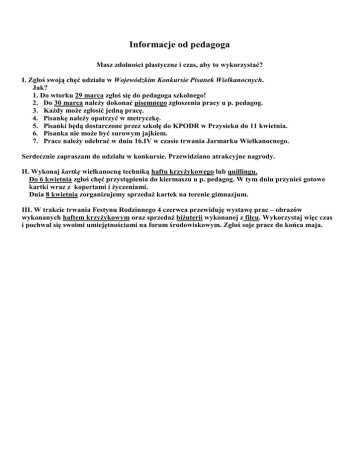 Informacje od pedagoga Masz zdolności plastyczne i czas, aby to wykorzystać? I. Zgłoś swoją chęć udziału w Wojewódzkim Konkursie Pisanek Wielkanocnych. Jak? 1. Do wtorku 29 marca zgłoś się do pedagoga szkolnego! 2. Do 30 marca naleŜy dokonać pisemnego zgłoszenia pracy u p. pedagog. 3. KaŜdy moŜe zgłosić jedną pracę. 4. Pisankę naleŜy opatrzyć w metryczkę. 5. Pisanki będą dostarczone przez szkołę do KPODR w Przysieku do 11 kwietnia. 6. Pisanka nie moŜe być surowym jajkiem. 7. Prace naleŜy odebrać w dniu 16.IV w czasie trwania Jarmarku Wielkanocnego. Serdecznie zapraszam do udziału w konkursie. Przewidziano atrakcyjne nagrody. II. Wykonaj kartkę wielkanocną techniką haftu krzyŜykowego lub quillingu. Do 6 kwietnia zgłoś chęć przystąpienia do kiermaszu u p. pedagog. W tym dniu przynieś gotowe kartki wraz z kopertami i Ŝyczeniami. Dnia 8 kwietnia zorganizujemy sprzedaŜ kartek na terenie gimnazjum. III. W trakcie trwania Festynu Rodzinnego 4 czerwca przewiduję wystawę prac – obrazów wykonanych haftem krzyŜykowym oraz sprzedaŜ biŜuterii wykonanej z filcu. Wykorzystaj więc czas i pochwal się swoimi umiejętnościami na forum środowiskowym. Zgłoś soje prace do końca maja.