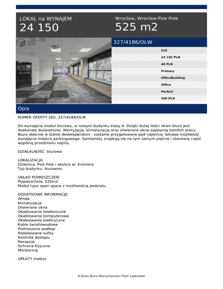 Wrocław, Wrocław-Psie Pole LOKAL na WYNAJEM 525 m2 24 150 327/4186/OLW 525 24 150 PLN 46 PLN Primary OfficeBuilding Office Perfect 200 PLN Opis NUMER OFERTY (ID): 327/4186/OLW Do wynajęcia moduł biurowy, w nowym budynku klasy A. Dzięki dużej ilości okien biuro jest doskonale doświetlone. Wentylacja, klimatyzacja oraz otwierane okna zapewnią komfort pracy. Biuro obecnie w stanie deweloperskim - zostanie przygotowane pod najemcę. Istnieje możliwość wynajęcia miejsca parkingowego. Sanitariaty znajdują się na tym samym piętrze i stanowią część wspólną przedmiotu najmu. DZIAŁALNOŚĆ: biurowa LOKALIZACJA: Dzielnica: Psie Pole / okolice al. Kromera Typ budynku: biurowiec UKŁAD POMIESZCZEŃ: Powierzchnia: 525m2 Moduł typu open space z możliwością podziału. DODATKOWE INFORMACJE: Winda Klimatyzacja Otwierane okna Okablowanie telefoniczne Okablowanie komputerowe Okablowanie elektryczne Kable światłowodowe Podnoszone podłogi Podwieszane sufity Kontrola dostępu Recepcja Ochrona fizyczna Monitoring OPŁATY (netto): 6-Ścian Biuro Nieruchomości Piotr Laskowski Czynsz najmu: 46zł/m2 + 14zł/m2 service chargé (cena podlega negocjacji) Dodatkowo: media wg. zużycia Kaucja Miejsce parkingowe 200zł/m-c Zapraszam na prezentację. Więcej ofert na www.6-scian.pl … 6-ścian Biuro Nieruchomości Tomasz Mioduszewski [email protected] tel: 789-384-494 Niniejsza oferta nie stanowi oferty w rozumieniu przepisów Kodeksu Cywilnego, a dane w niej zawarte mają jedynie charakter informacyjny i mogą ulec zmianie. … Tomasz Mioduszewski tel. 789384494 email: [email protected] 6-Ścian Biuro Nieruchomości Piotr Laskowski Powered by TCPDF (www.tcpdf.org)