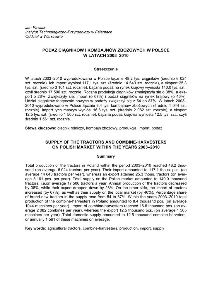 Jan Pawlak Instytut Technologiczno-Przyrodniczy w Falentach Oddział w Warszawie PODAŻ CIĄGNIKÓW I KOMBAJNÓW ZBOŻOWYCH W POLSCE W LATACH 2003−2010 Streszczenie W latach 2003−2010 wyprodukowano w Polsce łącznie 48,2 tys. ciągników (średnio 6 024 szt. rocznie). Ich import wyniósł 117,1 tys. szt. (średnio 14 643 szt. rocznie), a eksport 25,3 tys. szt. (średnio 3 161 szt. rocznie). Łączna podaż na rynek krajowy wyniosła 140,0 tys. szt., czyli średnio 17 506 szt. rocznie. Roczna produkcja ciągników zmniejszyła się o 38%, a eksport o 28%. Zwiększyły się: import (o 67%) i podaż ciągników na rynek krajowy (o 46%). Udział ciągników fabrycznie nowych w podaży zwiększył się z 54 do 87%. W latach 2003– 2010 wyprodukowano w Polsce łącznie 8,4 tys. kombajnów zbożowych (średnio 1 044 szt. rocznie). Import tych maszyn wyniósł 16,6 tys. szt. (średnio 2 082 szt. rocznie), a eksport 12,5 tys. szt. (średnio 1 565 szt. rocznie). Łączna podaż krajowa wyniosła 12,5 tys. szt., czyli średnio 1 561 szt. rocznie. Słowa kluczowe: ciągnik rolniczy, kombajn zbożowy, produkcja, import, podaż SUPPLY OF THE TRACTORS AND COMBINE-HARVESTERS ON POLISH MARKET WITHIN THE YEARS 2003–2010 Summary Total production of the tractors in Poland within the period 2003–2010 reached 48.2 thousand (on average 6 024 tractors per year). Their import amounted to 117.1 thous. pcs. (on average 14 643 tractors per year), whereas an export attained 25.3 thous. tractors (on average 3 161 pcs. per year). Total supply on the Polish market amounted to 140.0 thousand tractors, i.e.on average 17 506 tractors a year. Annual production of the tractors decreased by 38%, while their export dropped down by 28%. On the other side, the import of tractors increased (by 67%), as well as their supply on the local market (by 46%). Percentage share of brand-new tractors in the supply rose from 54 to 87%. Within the years 2003–2010 total production of the combine-harvesters in Poland amounted to 8.4 thousand pcs. (on average 1044 machines per year). Import of combine-harvesters reached 16.6 thousand pcs. (on average 2 082 combines per year), whereas the export 12.5 thousand pcs. (on average 1 565 machines per year). Total domestic supply amounted to 12.5 thousand combine-harveters, or annually 1 561 of these machines on average. Key words: agricultural tractors, combine-harvesters, production, import, supply