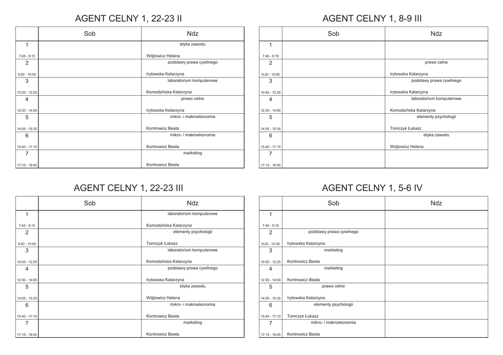AGENT CELNY 1, 22-23 II AGENT CELNY 1, 8-9 III Sob Ndz etyka zawodu 1 Wójtowicz Helena 7:45 - 9:15 Irytowska Katarzyna 9:20 - 10:50 Komodzi ska Katarzyna 10:55 - 12:25 prawo celne 4 Irytowska Katarzyna 12:30 - 14:00 Kontrowicz Beata 14:05 - 15:35 Kontrowicz Beata 15:40 - 17:10 podstawy prawa cywilnego Irytowska Katarzyna 10:55 - 12:25 laboratorium komputerowe 4 Komodzi ska Katarzyna elementy psychologii 5 Tomczyk Łukasz etyka zawodu 6 Wójtowicz Helena 15:40 - 17:10 marketing 7 Kontrowicz Beata 17:15 - 18:45 Irytowska Katarzyna 3 14:05 - 15:35 mikro- i makroekonomia 6 prawo celne 2 12:30 - 14:00 mikro- i makroekonomia 5 1 9:20 - 10:50 laboratorium komputerowe 3 7 17:15 - 18:45 AGENT CELNY 1, 22-23 III AGENT CELNY 1, 5-6 IV Sob 1 7:45 - 9:15 2 9:20 - 10:50 3 10:55 - 12:25 4 12:30 - 14:00 Ndz laboratorium komputerowe Komodzi ska Katarzyna elementy psychologii Tomczyk Łukasz 14:05 - 15:35 6 15:40 - 17:10 Komodzi ska Katarzyna podstawy prawa cywilnego Irytowska Katarzyna etyka zawodu Wójtowicz Helena 17:15 - 18:45 Kontrowicz Beata 7:45 - 9:15 2 podstawy prawa cywilnego Irytowska Katarzyna marketing 3 10:55 - 12:25 Kontrowicz Beata marketing 4 12:30 - 14:00 Kontrowicz Beata prawo celne 5 6 15:40 - 17:10 marketing Kontrowicz Beata 1 14:05 - 15:35 mikro- i makroekonomia 7 Sob 9:20 - 10:50 laboratorium komputerowe 5 Ndz 7:45 - 9:15 podstawy prawa cywilnego 2 Sob 7 17:15 - 18:45 Irytowska Katarzyna elementy psychologii Tomczyk Łukasz mikro- i makroekonomia Kontrowicz Beata Ndz AGENT CELNY 1, 26-27 IV Sob AGENT CELNY 1, 17-18 V Ndz Sob 1 1 7:45 - 9:15 7:45 - 9:15 2 2 9:20 - 10:50 9:20 - 10:50 3 3 10:55 - 12:25 10:55 - 12:25 laboratorium komputerowe 4 Komodzi ska Katarzyna 12:30 - 14:00 laboratorium komputerowe 5 Komodzi ska Katarzyna 14:05 - 15:35 etyka zawodu 6 Wójtowicz Helena 15:40 - 17:10 6 15:40 - 17:10 Sob 1 7:45 - 9:15 marketing Kontrowicz Beata Kontrowicz Beata 3 10:55 - 12:25 laboratorium komputerowe Komodzi ska Katarzyna laboratorium komputerowe Komodzi ska Katarzyna elementy psychologii Tomczyk Łukasz 4 12:30 - 14:00 mikro- i makroekonomia Kontrowicz Beata mikro- i makroekonomia Kontrowicz Beata marketing 5 14:05 - 15:35 6 15:40 - 17:10 marketing Kontrowicz Beata 2 9:20 - 10:50 mikro- i makroekonomia 7 17:15 - 18:45 Irytowska Katarzyna Ndz 2 14:05 - 15:35 prawo celne AGENT CELNY 1, 14-15 VI 7:45 - 9:15 5 Irytowska Katarzyna 15:40 - 17:10 1 12:30 - 14:00 Wójtowicz Helena podstawy prawa cywilnego 6 AGENT CELNY 1, 31V- 1VI 4 Tomczyk Łukasz etyka zawodu 14:05 - 15:35 17:15 - 18:45 10:55 - 12:25 Kontrowicz Beata elementy psychologii 5 17:15 - 18:45 3 Kontrowicz Beata mikro- i makroekonomia 12:30 - 14:00 7 9:20 - 10:50 marketing 4 7 Sob Ndz 7 17:15 - 18:45 Kontrowicz Beata Ndz