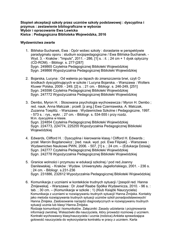 Stopień akceptacji szkoły przez uczniów szkoły podstawowej : dyscyplina i przymus : zestawienie bibliograficzne w wyborze Wybór i opracowanie Ewa Lewicka Kielce : Pedagogiczna Biblioteka Wojewódzka, 2016 Wydawnictwa zwarte 1. Bilińska-Suchanek, Ewa : Opór wobec szkoły : dorastanie w perspektywie paradygmatu oporu : studium socjopedagogiczne / Ewa Bilińska-Suchanek. Wyd. 3. - Kraków : "Impuls", 2011. - 286, [1] s. : il. ; 24 cm + 1 dysk optyczny (CD-ROM). - Bibliogr. s. 277-[287] Sygn. 249865 Czytelnia Pedagogicznej Biblioteki Wojewódzkiej Sygn. 249866 Wypożyczalnia Pedagogicznej Biblioteki Wojewódzkiej 2. Bojarska, Lucyna : Od walenia po łapach do zmarszczenia brwi, czyli O środkach dyscyplinujących w szkole / Lucyna Bojarska. - Warszawa : Wolters Kluwer Polska, 2009. - 249, [2] s. ; 21 cm. - Bibliogr. s. 246-249, [251] Sygn. 245596 Czytelnia Pedagogicznej Biblioteki Wojewódzkiej Sygn. 247772 Wypożyczalnia Pedagogicznej Biblioteki Wojewódzkiej 3. Dembo, Myron H. : Stosowana psychologia wychowawcza / Myron H. Dembo ; red. nauk. Anna Matczak ; przetł. [z ang.] Ewa Czerniawska, A. Matczak, Zuzanna Toeplitz. - Warszawa : Wydawnictwa Szkolne i Pedagogiczne, 1997. - 573 s. : rys., wykr. ; 27 cm. - Bibliogr. s. 534-555 i przy rozdz. M.in. dyscyplina w klasie. Sygn. 224854 Czytelnia Pedagogicznej Biblioteki Wojewódzkiej Sygn. 224773, 224774, 225255 Wypożyczalnia Pedagogicznej Biblioteki Wojewódzkiej 4. Edwards, Clifford H. : Dyscyplina i kierowanie klasą / Clifford H. Edwards ; przeł. Marcin Bogdanowicz ; [red. nauk. wyd. pol. Ewa Filipiak]. - Warszawa : Wydawnictwo Naukowe PWN, 2006. - 507, [1] s. ; 24 cm. – (Edukacja Dzisiaj) Sygn. 242777 Czytelnia Pedagogicznej Biblioteki Wojewódzkiej Sygn. 242778 Wypożyczalnia Pedagogicznej Biblioteki Wojewódzkiej 5. Granice wolności i przymusu w edukacji szkolnej / pod red.Joanny Danilewskiej. - Kraków : Wydaw. Uniwersytetu Jagiellońskiego, 2001. - 236 s. ; 24 cm. - Bibliogr. s.231-236 Sygn. 231886, 232612 Wypożyczalnia Pedagogicznej Biblioteki Wojewódzkiej 6. Komunikacja z uczniami w kontekście trudnych sytuacji / [zespół red. Hanna Żmijewska]. - Warszawa : Dr Josef Raabe Spółka Wydawnicza, 2010. - 96 s. : tab. ; 30 cm. – (Komunikacja w szkole ; 1) (Klub Książki Nauczyciela) Komunikacja z uczniami w rozwiązywaniu trudnych sytuacji/ Hanna Żmijska. Kontakty jako metoda rozwiązywania trudnych sytuacji uczniów szkół ponadpodstawowych/ Hanna Żmijska. Zastosowanie narzędzi diagnostycznych w rozwiązywaniu trudnych sytuacji ucznia lub klasy/ Hanna Żmijska. Rodzaje komunikacji i komunikatów. Załączniki: Zasady udzielania i przyjmowania informacji zwrotnej. Wskazówki dla nauczyciela, który prowadzi rozmowę z uczniem. Kontrakt wychowawcy klasy/nauczyciela i ucznia (rodzica).Ankieta sprawdzająca gotowość nauczyciela do wykorzystania kontraktu w pracy z uczniem. Karta zachowań ucznia na zajęciach lekcyjnych. Zbiorcza karta obserwacji dla wychowawcy klasy. Karta funkcjonowania ucznia w relacji z innymi. Karta indywidualnego planu pracy wychowawczej. Diagnoza klasy - scenariusz zajęć warsztatowych. Diagnoza grup wewnątrzklasowych - pytania do analizy. Karta obserwacji klasy podczas zajęć lekcyjnych. Arkusze diagnozujące kompetencje ucznia w zakresie współpracy. Jak współpracuję w grupie (dla ucznia). Sygn. 248696 Czytelnia Pedagogicznej Biblioteki Wojewódzkiej 7. Lemańska-Lewandowska, Ewa : Nauczyciele a dyscyplina w klasie szkolnej : przekonania, strategie, kierunki zmian / Ewa Lemańska-Lewandowska. Bydgoszcz : Wydawnictwo Uniwersytetu Kazimierza Wielkiego, 2013. - 187, [5] s. : il. ; 24 cm. - Bibliogr. s. 179-188 Biblioteka Uniwersytetu Jana Kochanowskiego – Czytelnia Pedagogiczna 8. Mieszalski, Stefan : O przymusie i dyscyplinie w klasie szkolnej. - Warszawa : Wydawnictwa Szkolne i Pedagogiczne, 1997. - 123, [1] s. : rys. ; 24 cm. – (Literatura Pedagogiczna). - Bibliogr. s. 121-123 Sygn. 225258 Czytelnia Pedagogicznej Biblioteki Wojewódzkiej Sygn. 225259, 225260 Wypożyczalnia Pedagogicznej Biblioteki Wojewódzkiej 9. Między wolnością a przymusem... : Prawa człowieka i współczesna edukacja / pod. red. Anny Wileczek. - Kielce : Wydaw. Uniwersytetu HumanistycznoPrzyrodniczego Jana Kochanowskiego, 2009. - 180 s. ; 24 cm Sygn. 249574 Czytelnia Pedagogicznej Biblioteki Wojewódzkiej 10. Muszyńska, Ewa : Swoboda, przymus i przemoc w relacjach dziecko - dorosły / Ewa Muszyńska. - [Wyd. 2]. - Poznań : Wydaw. Naukowe UAM, 1998. - 177 s. : wykr. ; 24 cm. – (Psychologia i Pedagogika / Uniwersytet im. Adama Mickiewicza w Poznaniu, 0083-4254 ; nr 107). - Bibliogr. s. 169-175 Sygn. 225440 Wypożyczalnia Pedagogicznej Biblioteki Wojewódzkiej Sygn. 222490 - wyd. z 1997 r. Czytelnia Pedagogicznej Biblioteki Wojewódzkiej 11. Nakamura, Raymond M. : Zdrowe kierowanie klasą : motywacja, komunikacja, dyscyplina / Raymond M. Nakamura ; z wprow. Andrzeja Janowskiego ; tł. Zofia Janowska. - Warszawa : Wolters Kluwer Polska, 2011. - 538 s. ; 21 cm. – (Inspiracje Edukacyjne). - Bibliogr. s. 507-529 Sygn. 250669 Czytelnia Pedagogicznej Biblioteki Wojewódzkiej Sygn. 250670, 250671 Wypożyczalnia Pedagogicznej Biblioteki Wojewódzkiej 12. Nauczyciel-uczeń : między przemocą a dialogiem : obszary napięć i typy interakcji / pod red. Marii Dudzikowej. - Kraków : "Impuls" , 1996. - 219, [6] s. : tab. ; 23 cm. - Bibliogr. przy rozdz. Sygn. 224386 Wypożyczalnia Pedagogicznej Biblioteki Wojewódzkiej Sygn. 227300 Czytelnia Pedagogicznej Biblioteki Wojewódzkiej 13. Pyżalski, Jacek Łukasz : Nauczyciele - uczniowie : dwa spojrzenia na dyscyplinę w klasie / Jacek Pyżalski. - Kraków : "Impuls", 2007. - 96 s. : il. ; 24 cm. - Bibliogr. s. 93-96 Sygn. 243116 Czytelnia Pedagogicznej Biblioteki Wojewódzkiej 14. Robertson, John : Jak zapewnić dyscyplinę, ład i uwagę w klasie / John Robertson ; tł. Krzysztof Kruszewski. - Warszawa : Wydawnictwa Szkolne i Pedagogiczne, 1998. - 215 s. : rys. ; 24