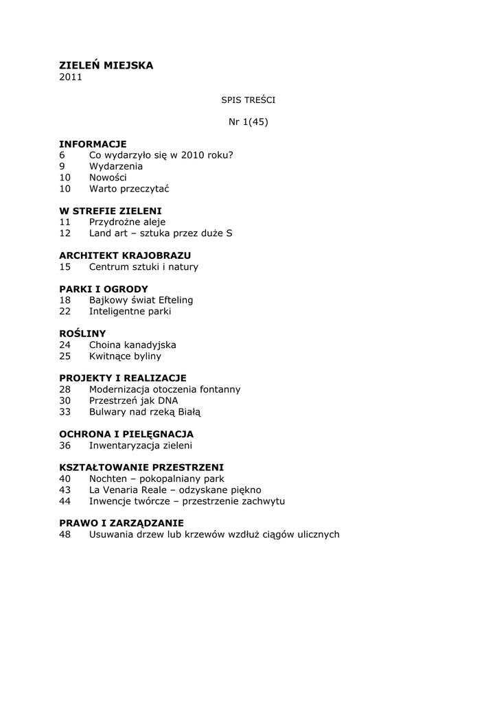 ZIELEŃ MIEJSKA 2011 SPIS TREŚCI Nr 1(45) INFORMACJE 6 Co wydarzyło się w 2010 roku? 9 Wydarzenia 10 Nowości 10 Warto przeczytać W STREFIE ZIELENI 11 Przydrożne aleje 12 Land art – sztuka przez duże S ARCHITEKT KRAJOBRAZU 15 Centrum sztuki i natury PARKI I OGRODY 18 Bajkowy świat Efteling 22 Inteligentne parki ROŚLINY 24 Choina kanadyjska 25 Kwitnące byliny PROJEKTY I REALIZACJE 28 Modernizacja otoczenia fontanny 30 Przestrzeń jak DNA 33 Bulwary nad rzeką Białą OCHRONA I PIELĘGNACJA 36 Inwentaryzacja zieleni KSZTAŁTOWANIE PRZESTRZENI 40 Nochten – pokopalniany park 43 La Venaria Reale – odzyskane piękno 44 Inwencje twórcze – przestrzenie zachwytu PRAWO I ZARZĄDZANIE 48 Usuwania drzew lub krzewów wzdłuż ciągów ulicznych Nr 2(46) INFORMACJE 6 Aktualności 10 Wydarzenia 12 Nowości ARCHITEKT KRAJOBRAZU 14 Architektura krajobrazu w Gruzji PARKI I OGRODY 18 Gra w mieście 21 Park rozrywki Playmobil ROŚLINY 24 Drzewa w miastach Szwajcarii 26 Obficie kwitnące drzewa i krzewy miejskie 29 Jodła olbrzymia PROJEKTY I REALIZACJE 30 Ogród zoobotaniczny w Toruniu 32 Zieleń miejska w Singapurze i Chinach, cz. 1 OCHRONA I PIELĘGNACJA 36 Wirusowe choroby roślin 40 Grzyby a środowisko KSZTAŁTOWANIE PRZESTRZENI 44 Spacer w koronach drzew PRAWO I ZARZĄDZANIE 47 Usuwanie drzew i krzewów a rozwój telekomunikacji Nr 3(47) INFORMACJE 6 Aktualności 10 Wydarzenia 12 Nowości 12 Warto przeczytać PARKI I OGRODIJ 14 Aktywny wypoczynek ARCHITEKT KRAJOBRAZU 16 Artysta tropikalnego krajobrazu ROŚLINY 18 Parocja perska 20 Jakość roślin w zieleni miejskiej PROJEKTY I REALIZACJE 22 Plac polskiej pisarki 24 Zieleń miejska w Singapurze i Chinach, cz. 2 MIEJSKA SZTUKA OGRODOWA 28 Zielona przestrzeń rekreacyjno-sportowa Poznania 30 Zieleń na terenach rekreacyjnych i sportowych 34 Krzewy kwitnące od wiosny do jesieni 38 Parki przygód - rozrywka w kontakcie z naturą 40 Plac zabaw dla „małych dorosłych" czy „dużych dzieci"? 42 Kreatywnie, z pomysłem i dla dzieci 44 Otoczenie stadionów - przestrzeń publiczna o szczególnych cechach 48 Zielone dachy na terenach sportowych i rekreacyjnych 50 Wykorzystanie terenów poprzemysłowych do celów rekreacyjnych 52 Elementy małej architektury w miejscach wypoczynku 56 Oświetlenie terenów rekreacyjnych Nr 4(48) INFORMACJE 6 Aktualności 10 Wydarzenia 12 Nowości 12 Warto przeczytać W STREFIE ZIELENI 14 Targi pełne zieleni 16 Trendy i nowoczesny design 17 PLANTEXPO w Łodzi 18 Moje miasto nocą 20 Fotografika inspirowana naturą ARCHITEKT KRAJOBRAZU 24 Artysta Krajobrazu Zen PARKI I OGRODY 26 Ogród malowany słońcem 28 Madryt Rio 32 Islamska sztuka ogrodowa w Hiszpanii, cz. 1 ROŚLINY 36 Jarząb brekinia 38 Krzewy iglaste w zieleni miejskiej 42 Magnolie na terenach zieleni, cz. 1 PROJEKTY I REALIZACJE 45 Mała architektura we współczesnej architekturze krajobrazu 48 Mały ogród miejski KSZTAŁTOWANIE PRZESTRZENI 50 Berlińskie place zabaw PRAWO I ZARZĄDZANIE 52 O prawnych aspektach pielęgnacji drzew raz jeszcze 55 Ochrona drzew w praktyce Nr 5(50) INFORMACJE 6 Aktualności 10 Wydarzenia 12 Nowości 12 Warto przeczytać W STREFIE ZIELENI 14 Magister inżynier ARCHITEKTury krajobrazu... i co dalej? PARKI I OGRODY 16 Podwórka i ogrody osiedlowe 18 Islamska sztuka ogrodowa w Hiszpanii, cz. 2 ARCHITEKT KRAJOBRAZU 21 Fernando Caruncho i geometria ROŚLINY 24 Stewarcja kameliowata 26 Krzewy wrzosowate 30 Magnolie na terenach zieleni, cz. 2 PROJEKTY I REALIZACJE 34 Park pełen czasu i wolności KSZTAŁTOWANIE PRZESTRZENI 36 Najmłodszy park Paryża 40 Place miejskie - nawierzchnie i nasadzenia 44 Kwietnikowe fantazje w Gdyni OCHRONA I PIELĘGNACJA 48 Pielęgnacja trawnika TECHNIKA 52 Wpływ mikroiniekcji na drzewa 56 Potrzeby wodne terenów zieleni miejskiej PRAWO I ZARZĄDZANIE 60 Usuwanie drzew przez użytkowników urządzeń przesyłowych po nowelizacji ustawy 64 Ile zieleni w polskich metropoliach? Nr 6(50) INFORMACJE 6 Aktualności 10 Wydarzenia 12 Nowości 12 Warto przeczytać W STREFIE ZIELENI 13 Wrocławskie założenia zieleni 16 Targi roślin i architektury krajobrazu 16 Usuwanie drzew w świetle prawa 17 Interclean - targi czystości 17 EDEN w Lublinie ARCHITEKT KRAJOBRAZU 18 Artystka krajobrazu skandynawskiego PARKI I OGRODY 20 Woda na placach zabaw 22 Madera - pocałunek Boga ROŚLINY 26 Barcelona - parki przemysłowe 28 Krzewy liściaste 31 Kasztanowiec żółty PROJEKTY I REALIZACJE 32 Ogród zamiast wyrzutni rakiet 36 Projektowanie a zrównoważony rozwój 40 Powrót Warszawy nad Wisłę KSZTAŁTOWANIE PRZESTRZENI 45 Rzeźby z kwiatów 48 Przeobrażenie ogrodów zoologicznych 50 Panta rhei... czyli o nowoczesnych pompach ulicznych PRAWIO I ZARZĄDZANIE 54 Odszkodowania za drzewa lub krzewy Nr 7/8(51/52) INFORMACJE 6 Aktualności 10 Wydarzenia 12 Nowości W STREFIE ZIELENI 13 Młodzi projektowali zieleń 14 Dyskusje wokół zieleni 14 Fosy w otoczeniu róż 15 Podkowa Leśna otworzyła ogrody 15 Ogrodowe wzorce PARKI I OGRODY 16 Ogród dla wszystkich dzieci 18 Z myślą o artystach... 20 Ogród polski ROŚLINY 26 Lipa amerykanka 28 Pnącza w mieście ARCHITEKT KRAJOBRAZU 32 Artysta pustynnego krajobrazu PROJEKTY I REALIZACJE 36 Kaskada wodna w przestrzeni osiedlowej 38 Pola golfowe KSZTAŁTOWANIE PRZESTRZENI 42 Projektowanie ekspozycji w ogrodach zoologicznych, cz. 1 TECHNIKA 46 Wpływ zieleni na energooszczędność budynku INSPIRACJE 52 Londyńska wystawa wrażeń PRAWO I ZARZĄDZANIE 58 Zieleń pod nadzorem 60 Dachy zielone - zagadnienia formalno-prawne, cz. 1 64 Pielęgnacja drzew lub krzewów na terenie zabytkowych nieruchomości Nr 9(53) INFORMACJE 6 Aktualności 10 Wydarzenia 12 Nowości 13 Warto przeczytać PARKI I OGRODY 14 Festiwal Ogrodów Tymczasowych 16 Czeski sen, cz. 1 20 Spektakl wodą malowany ARCHITEKT KRAJOBRAZU 22 Artysta konceptualnego krajobrazu ROŚLINY 26 Żółtnica pomarańczowa 28 Róże w mieście 32 Potrzeba wyznaczania drzew-weteranów PROJEKTY I REALIZACJE 35 Rekreacyjnie i spo
