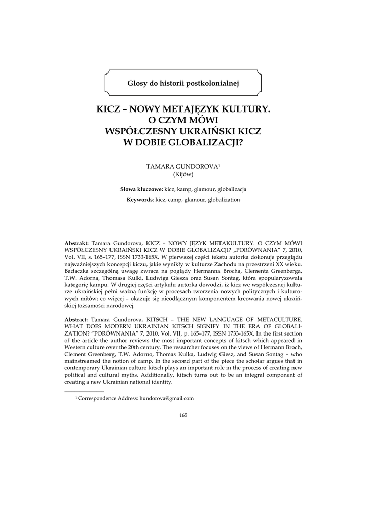 Glosy do historii postkolonialnej KICZ – NOWY METAJĘZYK KULTURY. O CZYM MÓWI WSPÓŁCZESNY UKRAIŃSKI KICZ W DOBIE GLOBALIZACJI? TAMARA GUNDOROVA1 (Kijów) Słowa kluczowe: kicz, kamp, glamour, globalizacja Keywords: kicz, camp, glamour, globalization Abstrakt: Tamara Gundorova, KICZ – NOWY JĘZYK METAKULTURY. O CZYM MÓWI WSPÓŁCZESNY UKRAIŃSKI KICZ W DOBIE GLOBALIZACJI? „PORÓWNANIA” 7, 2010, Vol. VII, s. 165–177, ISSN 1733-165X. W pierwszej części tekstu autorka dokonuje przeglądu najważniejszych koncepcji kiczu, jakie wynikły w kulturze Zachodu na przestrzeni XX wieku. Badaczka szczególną uwagę zwraca na poglądy Hermanna Brocha, Clementa Greenberga, T.W. Adorna, Thomasa Kulki, Ludwiga Giesza oraz Susan Sontag, która spopularyzowała kategorię kampu. W drugiej części artykułu autorka dowodzi, iż kicz we współczesnej kulturze ukraińskiej pełni ważną funkcję w procesach tworzenia nowych politycznych i kulturowych mitów; co więcej – okazuje się nieodłącznym komponentem kreowania nowej ukraińskiej tożsamości narodowej. Abstract: Tamara Gundorova, KITSCH – THE NEW LANGUAGE OF METACULTURE. WHAT DOES MODERN UKRAINIAN KITSCH SIGNIFY IN THE ERA OF GLOBALIZATION? “PORÓWNANIA” 7, 2010, Vol. VII, p. 165–177, ISSN 1733-165X. In the first section of the article the author reviews the most important concepts of kitsch which appeared in Western culture over the 20th century. The researcher focuses on the views of Hermann Broch, Clement Greenberg, T.W. Adorno, Thomas Kulka, Ludwig Giesz, and Susan Sontag – who mainstreamed the notion of camp. In the second part of the piece the scholar argues that in contemporary Ukrainian culture kitsch plays an important role in the process of creating new political and cultural myths. Additionally, kitsch turns out to be an integral component of creating a new Ukrainian national identity. ________________ 1 Correspondence Address: [email protected] 165 PORÓWNANIA 7, 2010 W labiryntach definicji: znajomy nieznajomy Od momentu pojawienia się słowa „kicz” minęło już niemalże półtora stulecia. W tym czasie był on obiektem zainteresowań wielu badaczy, lecz mimo to próba jego jednoznacznego określenia wciąż nastręcza poważne trudności2. Hermann Broch już na wstępie swego głośnego wykładu o kiczu wyraźnie zastrzegł, aby nie oczekiwać od niego precyzyjnego zdefiniowania kiczu, bowiem ten odnosi się do tylu zagadnień, iż do ich wyjaśnienia należałoby napisać trzytomową pracę naukową. Z kolei Matei Calinescu w książce o pięciu obliczach modernizmu, gdzie jednym z nich był kicz, zauważył, iż jest on jednym z najbardziej płynnych pojęć estetyki modernizmu, pojęć, które trudno skonkretyzować nawet przez ich negatywne oznaczenie. Natomiast Thomas Kulka w swej znanej monografii poświęconej relacjom kiczu i sztuki skonstatował, iż znacznie łatwiej jest opisać kicz przez pojęcia bliskoznaczne, niż podać dokładne wytłumaczenie, na czym rzeczywiście polega jego istota. Wydaje się, że jedyną kwestią, wobec której są zgodni wszyscy badacze, jest fakt, iż we współczesnym świecie kicz jest wszechobecny. Niewątpliwie trudno dziś znaleźć taką sferę, która byłaby pozbawiona wpływów masowej kultury oraz jej nieodłącznego towarzysza – kiczu. Jeszcze w 1939 roku znany amerykański krytyk Clement Greenberg wieloaspektowo opisał fenomen kulturowy, jakiemu Niemcy nadali miano kiczu. Do owej kategorii Greenberg zakwalifikował przeznaczoną dla mas sztukę komercyjną i literaturę, z charakterystycznym dla nich kolorytem, okładki czasopism, ilustracje, a także reklamę, komiksy, muzykę popularną, tańce do melodii odtwarzanych z gramofonów, hollywoodzkie filmy itp.3 W ten sposób badacz odniósł do kiczu niemal cała kulturę popularną. Swój uogólniający osąd krytyk wysunął na podstawie przeciwstawienia kiczu innym pozytywnie nacechowanym kategoriom takim, jak „dobry gust”, „sztuka wysoka”, „artystyczna awangarda”. Tą krytyką kiczu jako sztuki mechanicznej, sformalizowanej, ucieleśniającej nieautentyczne emocje oraz fałsz nowoczesnego życia, sztuki, która jedynie odtwórczo wykorzystuje zasoby wysoko rozwiniętej tradycji kulturowej i która w dodatku z taką łatwością daje się przeobrazić w sztukę totalitarną, Greenberg na długi czas zaprogramował negatywny stosunek do kiczu. W rzeczywistości autor Awangardy i kicz ustworzył podstawy do ideologicznego traktowania kiczu. Zdaniem Davida Rieffa, „Greenberg dał ________________ Szerzej na ten temat zob.: Т. Гундорова, Кітч і література. Травестії. Київ 2008. Zob.: К. Гринберг, Авангард и китч, пер. с анг. А. Калинина, «Художественный журнал» 2005, № 60 – http://xz.gif.ru/numbers/60/avangard-i-kitch/ (wersja pol.: C. Greenberg, Awangarda i kicz, [w:] Kultura masowa. Wybór, przekład, przedmowa Cz. Miłosz. Komentarz J. Szacki. Kraków 2002). 2 3 166 Tamara Gundorova, Kicz – nowy metajęzyk kultury wyraz politycznego zaangażowania awangardy i kultury wysokiej, rozpatrując kicz (a właściwie kulturę masową) w kategoriach wroga”. Natomiast Theodor W. Adorno wiązał kicz z kategoriami estetycznymi w kontekście krytyki kultury masowej jako przemysłu kulturalnego. Dla Adorna kicz to pozorowanie nieistniejących uczuć, tym samym ich neutralizacja, niwelowanie, a także symulacja fenomenu estetycznego4. Jednak w przekonaniu filozofa nie jest to wystarczająca definicja, wymaga ona szeregu uzupełnień i wyjaśnień, które mogłyby dotyczyć na przykład faktu, czyje uczucia symuluje kicz (autora czy odbiorcy), na ile kicz związany jest z faktywnością, w jaki sposób można wyznaczyć autentyczną wartość dzieła sztuki itp. itd. Adorno dochodzi jednak do wniosku, że są to pytania w zasadzie kazuistyczne. Stąd badacz nie oddziela kiczu od sztuki,