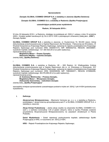 Sprawozdanie Zarządu GLOBAL COSMED GROUP S.A. z siedzibą w Jaworze (Spółka Dzielona) oraz Zarządu GLOBAL COSMED S.A. z siedzibą w Radomiu (Spółka Przejmująca) uzasadniające podział przez wydzielenie Radom, 30 listopada 2016 r. W dniu 30 listopada 2016 r. w Radomiu, działając na podstawie art. 536 § 1 ustawy z dnia 15 września 2000 r. Kodeks spółek handlowych (tj: Dz.U.2013.1030 z późniejszymi zmianami) (dalej jako: „KSH”), Zarządy Spółek: GLOBAL COSMED GROUP S.A z siedzibą w Jaworze, ul. Kuziennicza 15, 59-400 Jawor, której dokumentacja przechowywana jest w Sądzie Rejonowym dla Wrocławia - Fabrycznej we Wrocławiu, IX Wydział Gospodarczy Krajowego Rejestru Sądowego, wpisanej do rejestru przedsiębiorców Krajowego Rejestru Sądowego pod numerem KRS: 0000041414, NIP: 6950002732, REGON: 390339667, wysokość kapitału zakładowego: 121 300 923,00 zł (w pełni wpłacony), reprezentowanej przez: Magdalenę Mazur – Prezes Zarządu; Sławomira Miętkę – Członka Zarządu; zwanej dalej „Spółką Dzieloną”, i GLOBAL COSMED S.A. z siedzibą w Radomiu, 26 – 600 Radom, Ul. Wielkopolska 3,której dokumentacja przechowywana jest w Sądzie Rejonowym dla m. st. Warszawy w Warszawie, XIV Wydział Gospodarczy Krajowego Rejestru Sądowego, wpisanej do rejestru przedsiębiorców Krajowego Rejestru Sądowego pod numerem: KRS: 0000049539, NIP: 7960069371, REGON: 670990050, wysokość kapitału zakładowego: 86.076,085,00 zł (w pełni wpłacony), reprezentowanej przez: dr Andreasa Mielimonkę – Prezesa Zarządu, Magdalenę Mazur – Wiceprezes Zarządu, Aleksandrę Gawrońską – Członkiem Zarządu zwanej dalej „Spółką Przejmującą”. sporządziły niniejsze sprawozdanie uzasadniające podział w trybie art. 529 § 1 pkt 4 KSH (podział przez wydzielenie). I. Definicje. Akcjonariusz Mniejszościowy – Blackwire Ventures sp. z o. o. z siedzibą w Radomiu, posiadająca 1 akcję imienną uprzywilejowaną serii F w GLOBAL COSMED GROUP S.A. z siedzibą w Jaworze; Akcja Emisji Podziałowej – Jedna akcja zwykła na okaziciela GLOBAL COSMED S.A. serii L o wartości nominalnej 1,00 zł (jeden złotych), która w wyniku Podziału zostanie przydzielona Akcjonariuszowi Mniejszościowemu na zasadach określonych w Planie Podziału; Dzień Wydzielenia – Dzień rejestracji podwyższenia kapitału zakładowego Spółki Przejmującej w KRS, w rozumieniu art. 530 § 2 KSH; KRS – Rejestr Przedsiębiorców Krajowego Rejestru Sądowego; 1 KSH – Ustawa z dnia 15 września 2000 r. Kodeks spółek handlowych (tj: Dz.U.2013.1030 z późniejszymi zmianami); GLOBAL COSMED GROUP S.A. lub Spółka Dzielona – GLOBAL COSMED GROUP S.A. z siedzibą w Jaworze; GLOBAL COSMED S.A. lub Spółka Przejmująca – GLOBAL COSMED S.A. z siedzibą w Radomiu; Plan Podziału – Niniejszy plan podziału przez wydzielenie; Podział – Podział Spółki Dzielonej przez wydzielenie (art. 529 § 1 pkt 4 KSH), w ramach którego ZCP zostanie przeniesiona do Spółki Przejmującej; Działalność Produkcyjna – Wszelka działalność związana z produkcją produktów kosmetycznych i toaletowych oraz produkcją mydła i detergentów, środków myjących i czyszczących, realizowana w Zakładach Produkcyjnych w Jaworze i Świętochłowicach Zakład Produkcyjny w Jaworze – zorganizowany zespół Składników Majątku, prowadzący Działalność Produkcyjną w Jaworze przy ul. Kuzienniczej 15, na terenie działek nr 141/3, 141/4, 141/6 objętych księgą wieczystą o numerze LE1J/00009138/3. Zakład Produkcyjny w Świętochłowicach – zorganizowany zespół Składników Majątku, prowadzący Działalność Produkcyjną w Świętochłowicach przy ul. Łagiewnickiej 1c, na terenie działek nr 802/187, 2930, 2931, 2932, 2933, objętych księgami wieczystymi o numerach KA1C/00004079/6, KA1C/00005080/3, KA1C/00018465/0. Składniki Majątku – Materialne i niematerialne składniki majątku (aktywa i pasywa), zezwolenia, koncesje i ulgi, a także wszelkie inne prawa i obowiązki, które mogą podlegać sukcesji generalnej na zasadach określonych w art. 531 KSH; Spółki – Spółka Dzielona i Spółka Przejmująca łącznie; UoCIT – Ustawa z dnia 15 lutego 1992 r. o podatku dochodowym od osób prawnych (Dz.U.2014.851 z późniejszymi zmianami); UoVAT – Ustawa z dnia 11 marca 2004 r. o podatku od towarów i usług (Dz.U.2016.710 z późniejszymi zmianami); ZCP – Zakłady Produkcyjne w Jaworze i Świętochłowicach – zorganizowana część przedsiębiorstwa Spółki Dzielonej, która zostanie przeniesiona do Spółki Przejmującej w drodze Podziału; ADM – Administracja, Dystrybucja i Marketing – zorganizowana część przedsiębiorstwa Spółki Dzielonej, która po przeprowadzeniu podziału pozostanie w Spółce Dzielonej. II. Sposób podziału i jego podstawy prawne. 1. Sposób podziału Podział nastąpi w trybie określonym w art. 529 § 1 pkt 4 KSH, tj. poprzez wydzielenie części majątku Spółki Dzielonej w postaci ZCP na Spółkę Przejmującą w zamian za 1 Akcję Emisji Podziałowej, która zostanie wydana Akcjonariuszowi Mniejszościowemu. Majątek, który w następstwie Podziału zostanie przeniesiony na Spółkę Przejmującą – tj. ZCP – stanowi organizacyjnie, finansowo i personalnie wyodrębniony w ramach Spółki Dzielonej zespół składników niematerialnych i materialnych, jak również praw i zobowiązań, przeznaczonych do prowadzenia działalności gospodarczej w zakresie Działalności 2 Produkcyjnej, będący zorganizowaną częścią przedsiębiorstwa w rozumieniu art. 4a pkt 4 UoCIT oraz art. 6 pkt 1 w zw. z art. 2 pkt 27e UoVAT. Jednocześnie majątek, który w następstwie Podziału pozostanie w Spółce Dzielonej – tj. ADM - stanowi organizacyjnie, finansowo i personalnie wyodrębniony w ramach Spółki Dzielonej zespół składników niematerialnych i materialnych, jak również praw i zobowiązań związanych z działalnością GLOBAL COSMED GRO