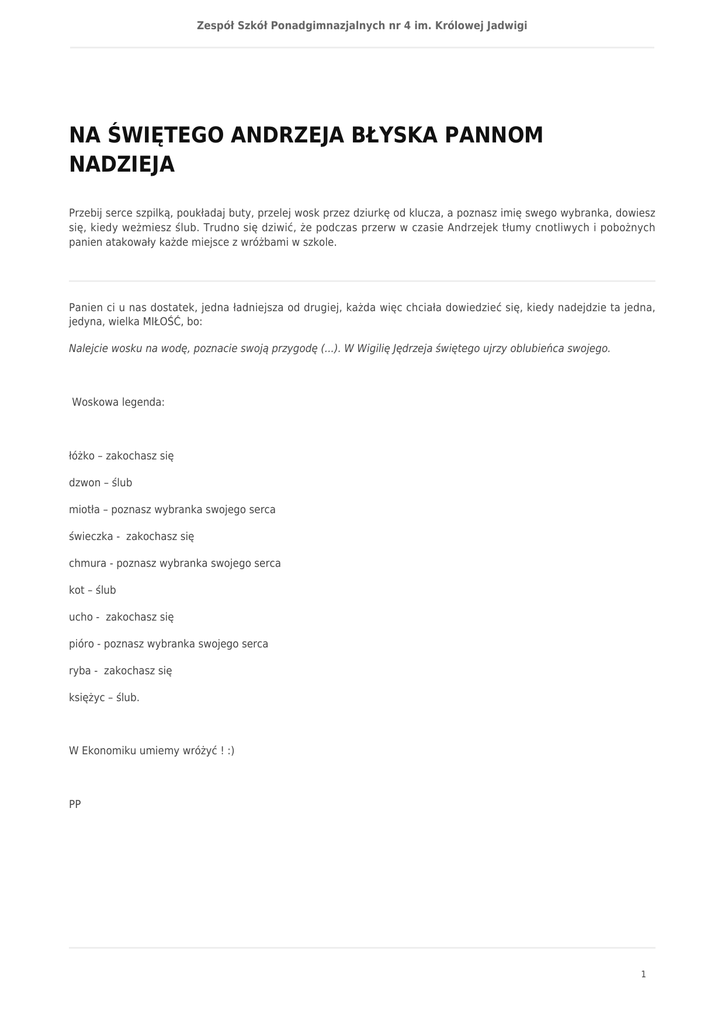 Zespół Szkół Ponadgimnazjalnych nr 4 im. Królowej Jadwigi NA ŚWIĘTEGO ANDRZEJA BŁYSKA PANNOM NADZIEJA Przebij serce szpilką, poukładaj buty, przelej wosk przez dziurkę od klucza, a poznasz imię swego wybranka, dowiesz się, kiedy weżmiesz ślub. Trudno się dziwić, że podczas przerw w czasie Andrzejek tłumy cnotliwych i pobożnych panien atakowały każde miejsce z wróżbami w szkole. Panien ci u nas dostatek, jedna ładniejsza od drugiej, każda więc chciała dowiedzieć się, kiedy nadejdzie ta jedna, jedyna, wielka MIŁOŚĆ, bo: Nalejcie wosku na wodę, poznacie swoją przygodę (...). W Wigilię Jędrzeja świętego ujrzy oblubieńca swojego. Woskowa legenda: łóżko – zakochasz się dzwon – ślub miotła – poznasz wybranka swojego serca świeczka - zakochasz się chmura - poznasz wybranka swojego serca kot – ślub ucho - zakochasz się pióro - poznasz wybranka swojego serca ryba - zakochasz się księżyc – ślub. W Ekonomiku umiemy wróżyć ! :) PP 1