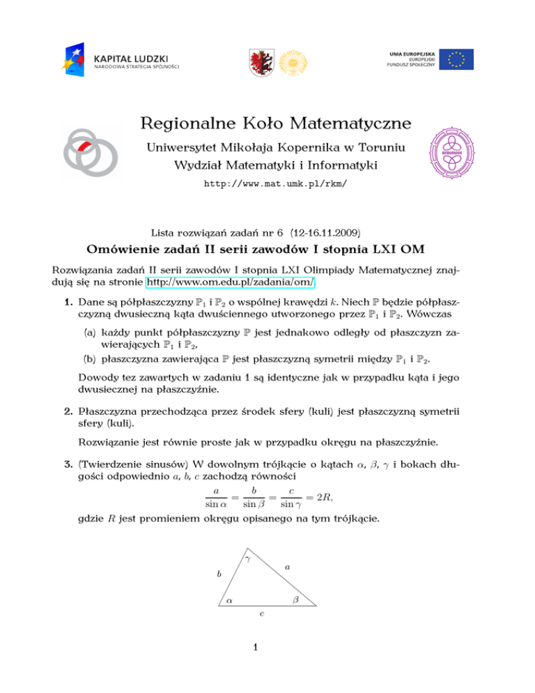 Regionalne Koło Matematyczne Uniwersytet Mikołaja Kopernika w Toruniu Wydział Matematyki i Informatyki http://www.mat.umk.pl/rkm/ Lista rozwiązań zadań nr 6 (12-16.11.2009) Omówienie zadań II serii zawodów I stopnia LXI OM Rozwiązania zadań II serii zawodów I stopnia LXI Olimpiady Matematycznej znajdują się na stronie http://www.om.edu.pl/zadania/om/. 1. Dane są półpłaszczyzny P1 i P2 o wspólnej krawędzi k. Niech P będzie półpłaszczyzną dwusieczną kąta dwuściennego utworzonego przez P1 i P2 . Wówczas (a) każdy punkt półpłaszczyzny P jest jednakowo odległy od płaszczyzn zawierających P1 i P2 , (b) płaszczyzna zawierająca P jest płaszczyzną symetrii między P1 i P2 . Dowody tez zawartych w zadaniu 1 są identyczne jak w przypadku kąta i jego dwusiecznej na płaszczyźnie. 2. Płaszczyzna przechodząca przez środek sfery (kuli) jest płaszczyzną symetrii sfery (kuli). Rozwiązanie jest równie proste jak w przypadku okręgu na płaszczyźnie. 3. (Twierdzenie sinusów) W dowolnym trójkącie o kątach α, β, γ i bokach długości odpowiednio a, b, c zachodzą równości a b c = = = 2R, sin α sin β sin γ gdzie R jest promieniem okręgu opisanego na tym trójkącie. γ a b β α c 1 Zadanie to jest klasycznym szkolnym zadaniem, więc pomijamy jego rozwiązanie. Podobnie jest z kolejnym zadaniem. 4. W dowolnym trójkącie o bokach długości a, b, c pole tego trójkąta wyraża się wzorem 1 P△ = (a + b + c)r, 2 gdzie r jest promieniem okręgu wpisanego w ten trójkąt. 5. (Zad. 5. z II serii) Dany jest czworościan ABCD, którego ściany są trójkątami ostrokątnymi. Na prostej l leży środek sfery wpisanej oraz środek sfery opisanej na czworościanie. Udowodnić, że jeśli prosta l przecina odcinek AB, to |∠ACB| = |∠ADB|. Rozwiązanie. Na płaszczyźnie wyznaczonej przez prostą l i krawędź AB (oznaczmy ją przez P) leżą środek sfery opisanej na czworościanie ABCD oraz środek sfery wpisanej w czworościan. Zatem płaszczyzna P zawiera płaszczyznę dwusieczną kąta dwuściennego czworościanu o krawędzi AB. Zatem płaszczyzny ABC i ABD są symetryczne względem płaszczyzny P. Płaszczyzna P jest płaszczyzną symetrii sfery opisanej na czworościanie ABCD. Częścią wspólną płaszczyzny ABC i sfery opisanej na ABCD jest okrąg opisany na ścianie ABC. Zatem okręgi opisane na ścianach ABC i ABD są symetryczne względem płaszczyzny P, a więc mają równe promienie. Ponieważ okręgi te mają wspólną cięciwę AB, to kąty ACB i ADB, jako wpisane w te okręgi, oparte są na równych cięciwach i ostre są równe. Stwierdzenie to kończy rozwiązanie zadania. Czytelnik może znaleźć inne rozwiązanie na stronie internetowej Olimpiady Matematycznej. 6. Mówimy, że liczby całkowite a, b przystają modulo m, gdzie m jest liczbą naturalną, jeśli różnica a − b jest podzielna przez m, i piszemy a ≡ b (mod m). Relację ≡ nazywamy kongruencją. Relacja ≡ ma następujące własności: (a) a ≡ a (mod m), (b) a ≡ b (mod m) ⇒ b ≡ a (mod m), (c) (a ≡ b (mod m) ∧ b ≡ c (mod m)) ⇒ a ≡ c (mod m), (d) jeżeli a ≡ b (mod m) i c ≡ d (mod m), to a + c ≡ b + d (mod m) a − c ≡ b − d (mod m) a · c ≡ b · d (mod m) an ≡ bn (mod m), gdzie a, b, c, d są dowolnymi liczbami całkowitymi, n jest dowolną liczbą naturalną i m jest ustaloną liczbą naturalną. 2 Problemy opisane w powyższym zadaniu zostały rozwiązane na zajęciach RKM poświęconych kongruencjom. 7. (Zad. 6. z II serii) Dana jest liczba pierwsza p 6= 5 oraz takie liczby całkowite a, b, c, że p jest dzielnikiem obu liczb a + b + c i a5 + b5 + c5 . Wykazać, że co najmniej jedna z liczb a2 + b2 + c2 i a3 + b3 + c3 jest podzielna przez p. Rozwiązanie. Skoro p | a + b + c, to a + b + c ≡ 0 (mod p). Zatem c ≡ −(a + b) (mod p). Ponieważ p | a5 + b5 + c5 , to także a5 + b5 + c5 ≡ 0 (mod p). Czytelnik sprawdzi, że (∗) 2(a5 + b5 − (a + b)5 ) = −5ab(a + b)(a2 + b2 + (a + b)2 ). Skoro a5 + b5 + c5 ≡ 0 (mod p), to 2(a5 + b5 + (−(a + b))5 ) ≡ 0 (mod p). Zatem 2(a5 + b5 − (a + b)5 ) ≡ 0 (mod p). Z równości (∗) i ostatniej relacji otrzymujemy −5ab(a + b)(a2 + b2 + (a + b)2 ) ≡ 0 (mod p). Ponieważ a + b ≡ −c (mod p), więc mamy 5abc(a2 + b2 + c2 ) ≡ 0 (mod p). Jeżeli p dzieli a2 + b2 + c2 , to teza zadania jest spełniona, gdyby p nie dzieliło a2 + b2 + c2 , to p dzieli iloczyn 5abc. Liczba pierwsza p jest różna od 5, więc p dzieli iloczyn abc, zatem p dzieli jedną z tych liczb. Niech p dzieli liczbę c. Ponieważ p dzieli a + b + c i p dzieli c, to p dzieli sumę a + b. Wtedy c3 i a + b są podzielne przez p. Natomiast suma a3 + b3 + c3 = (a + b)(a2 − ab + b2 ) + c3 jest podzielna przez p jako suma dwóch liczb podzielnych przez p. Czytelnika zainteresowanego innym rozwiązaniem zadania 7 i rozwiązaniami pozostałych zadań drugiej serii odsyłamy do strony internetowej Olimpiady Matematycznej lub opracowania grupy zaawansowanej. 3