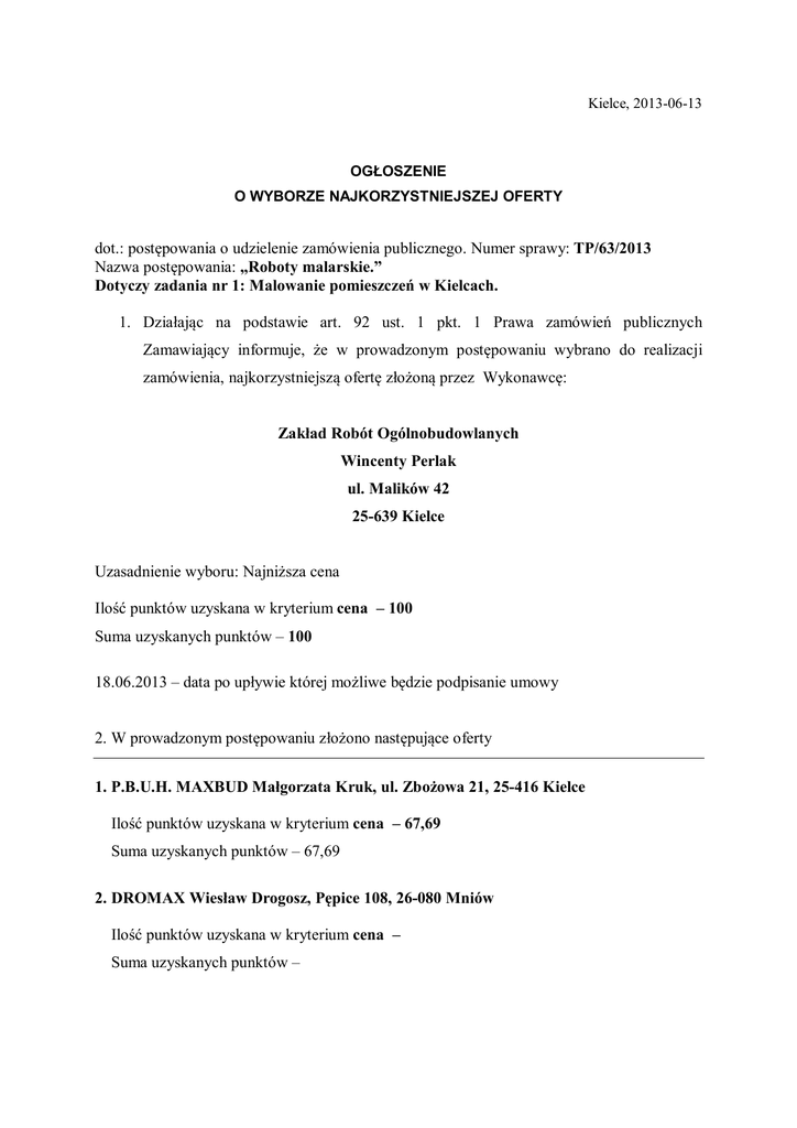 Kielce, 2013-06-13 OGŁOSZENIE O WYBORZE NAJKORZYSTNIEJSZEJ OFERTY dot.: postępowania o udzielenie zamówienia publicznego. Numer sprawy: TP/63/2013 Nazwa postępowania: „Roboty malarskie.” Dotyczy zadania nr 1: Malowanie pomieszczeń w Kielcach. 1. Działając na podstawie art. 92 ust. 1 pkt. 1 Prawa zamówień publicznych Zamawiający informuje, że w prowadzonym postępowaniu wybrano do realizacji zamówienia, najkorzystniejszą ofertę złożoną przez Wykonawcę: Zakład Robót Ogólnobudowlanych Wincenty Perlak ul. Malików 42 25-639 Kielce Uzasadnienie wyboru: Najniższa cena Ilość punktów uzyskana w kryterium cena – 100 Suma uzyskanych punktów – 100 18.06.2013 – data po upływie której możliwe będzie podpisanie umowy 2. W prowadzonym postępowaniu złożono następujące oferty 1. P.B.U.H. MAXBUD Małgorzata Kruk, ul. Zbożowa 21, 25-416 Kielce Ilość punktów uzyskana w kryterium cena – 67,69 Suma uzyskanych punktów – 67,69 2. DROMAX Wiesław Drogosz, Pępice 108, 26-080 Mniów Ilość punktów uzyskana w kryterium cena – Suma uzyskanych punktów – 3. Firma Ogólnobudowlana BudPrzem Przemysław Gaweł, ul. Kopernika 11, 28-100 Busko - Zdrój Ilość punktów uzyskana w kryterium cena – 85,60 Suma uzyskanych punktów – 85,60 4. Zakład Remontowo – Budowlany Jan Śliwiński, ul. Rajtarska 34, 25-133 Kielce. Ilość punktów uzyskana w kryterium cena – 94,11 Suma uzyskanych punktów – 94,11 5. P.B.U.H. ”MAGAD” Paweł Jarząb, ul. Warszawska 166/32, 25-414 Kielce. Ilość punktów uzyskana w kryterium cena – 66,64 Suma uzyskanych punktów – 66,64 6. Zakład Robót Ogólnobudowlanych Wincenty Perlak, ul. Malików 42, 25-639 Kielce Ilość punktów uzyskana w kryterium cena – 100 Suma uzyskanych punktów – 100 7. Firma Usługowa „LM” Możdżan Lidia, ul. Hoża 50a, 25,618 Kielce. Ilość punktów uzyskana w kryterium cena – 63,07 Suma uzyskanych punktów – 63,07 8. MG – BUDMAL Projekty, Wykończenia Wnętrz, Maciej Grosicki, ul. Meissnera 4/8, 25-634 Kielce. Ilość punktów uzyskana w kryterium cena – Suma uzyskanych punktów – 9. „RZEMIEŚLNIK” Sp. z.o.o., ul. Mielczarskiego 147, 25-611 Kielce. Ilość punktów uzyskana w kryterium cena – 85,66 Suma uzyskanych punktów – 85,66 10. Firma Projektowo – Budowlana Z&Z, Zbludowice, ul. Krakowska 23, 28-100 Busko – Zdrój. Ilość punktów uzyskana w kryterium cena – Suma uzyskanych punktów – 11. P.H.U. „BATREM” Tomasz Bańcyrowski, ul. Świętokrzyska 11, 26-110 Skarżysko – Kamienna. Ilość punktów uzyskana w kryterium cena – 73,76 Suma uzyskanych punktów – 73,76 12. Firma Remontowo – Budowlana „VERO” Szymon Głębicki, ul. Polna 9, 27-440 Ćmielów Ilość punktów uzyskana w kryterium cena – 85,71 Suma uzyskanych punktów – 85,71 13. Firma Remontowo – Budowlana „GROSS” Michał Grosicki, Os. Barwinek 13 m. 126, 25-150 Kielce Ilość punktów uzyskana w kryterium cena – Suma uzyskanych punktów – 3. Działając na podstawie art. 92 ust. 1 pkt. 2 Prawa zamówień publicznych Zamawiający informuje, że w prowadzonym postępowaniu zostali odrzuceni następujący wykonawcy. MG- BUDMAL Projekty Wykończenia Wnętrz Maciej Grosicki ul. Meissnera 4/8 25-634 Kielce Uzasadnienie prawne: Zamawiający odrzuca ofertę na podstawie art. 89 ust. 1 pkt. 2 ustawy pzp. Uzasadnienie faktyczne: Zamawiający odrzuca ofertę na podstawie art. 89 ust. 1 pkt 2 ustawy pzp, ponieważ jej treść nie odpowiada treści SIWZ z zastrzeżeniem art. 87 ust. 2 pkt 3, ponieważ Wykonawca tj. MG – BUDMAL Projekty, Wykończenia Wnętrz, Maciej Grosicki, ul. Meissnera 4/8, 25-634 Kielce, do swojej oferty dołączył kosztorys ofertowy niezgodny z załączonym przedmiarem i tzw. ślepym kosztorysem jak wymagano zgodnie z zapisami SIWZ pkt. 12 ppkt 3 lit.e. Pozycja dotycząca gruntowania podłoża była liczona jako jednokrotność a nie dwukrotność. Firma Projektowo – Budowlana Z&Z Zbludowice ul. Krakowska 23 28-100 Busko – Zdrój Uzasadnienie prawne: Zamawiający odrzuca ofertę na podstawie art. 89 ust. 1 pkt. 4 ustawy pzp. Uzasadnienie faktyczne: Zamawiający odrzuca ofertę na podstawie art. 89 ust. 1 pkt 4 ustawy pzp, ponieważ Wykonawca tj. Firma Projektowo – Budowlana Z&Z, Zbludowice, ul. Krakowska 23, 28-100 Busko – Zdrój, przedstawiła kwotę w ofercie poniżej 50 % wartości kosztorysu inwestorskiego. Po otrzymaniu wyjaśnień od w/w Wykonawcy komisja przetargowa nie zaakceptowała wyjaśnień otrzymanych od Wykonawcy na temat złożonych ofert dotyczących zadania 1 i zadania 2 i uznała ceny ofert za rażąco niskie. Firma Remontowo – Budowlana „GROSS” Michał Grosicki Os. Barwinek 13 m. 126 25-150 Kielce Uzasadnienie prawne: Zamawiający odrzuca ofertę na podstawie art. 89 ust. 1 pkt. 2 ustawy pzp. Uzasadnienie faktyczne: Zamawiający odrzuca ofertę na podstawie art. 89 ust. 1 pkt 2 ustawy pzp, ponieważ jej treść nie odpowiada treści SIWZ z zastrzeżeniem art. 87 ust. 2 pkt 3, ponieważ Wykonawca tj. Firma Remontowo – Budowlana „GROSS” Michał Grosicki, Os. Barwinek 13 m. 126, 25-150 Kielce, do swojej oferty nie dołączyło wymaganego zgodnie z zapisami w SIWZ w pkt. 9.2.1 ppkt. 3 tj. Aktualnej informacji z Krajowego Rejestru Karnego w zakresie określonym w art. 24 ust 1 pkt 4-11 ustawy pzp. wystawionej nie wcześniej niż 6 miesięcy przed upływem składania ofert o dopuszczenie do udziału w postępowaniu o udzielenie zamówienia i pomimo wezwania o uzupełnienie w/w dokumentu nie dostarczył go w wyznaczonym terminie. 4. Działając na podstawie art. 92 ust. 1 pkt. 3 Prawa zamówień publicznych Zamawiający informuje, że w prowadzonym postępowaniu został wykluczony następujący wykonawca. DROMAX Wiesław Drogosz Pępice 108 26-080 Mniów Uzasadnienie prawne: Zamawiający wyklucza ofertę na podstawie art. 24 ust. 2 pkt 2 ustawy pzp. Uzasadnienie faktyczne: Zamawiający wyklucza ofertę na podstawie art. 24 