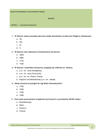 Egzamin dla kandydatów na przewodników miejskich Szczecin 7.09.2011 r. — część pisemna (wersja A) 1. W którym wieku powstała pierwsza osada słowiańska na obecnym Wzgórzu Zamkowym: a. VII, b. VIII, c. IX, d. X. 2. W którym roku dokonano chrystianizacji Szczecina: a. 1004, b. 1084, c. 1124, d. 1128. 3. W którym z kościołów Szczecina znajdują się relikwie św. Ottona: a. p.w. św. Jana Ewangelisty, b. p.w. św. Jana Chrzciciela, c. p.w. św. św. Piotra i Pawła, d. bazylice archikatedralnej p.w. św. Jakuba. 4. Kiedy Szczecin przystąpił do Ligi Miast Hanzeatyckich: a. 1150, b. 1250, c. 1278, d. 1298. 5. Pod czyim panowaniem znajdował się Szczecin na przełomie XII/XIII wieku: a. Brandenburgii, b. Danii, c. Szwecji, d. Francji. Oddział Międzyuczelniany PTTK w Warszawie http://szkolenia.om.pttk.pl Opracowano na podstawie materiałów udostępnionych przez urzędy wojewódzkie 1 7.09.2011 Egzamin dla kandydatów na przewodników miejskich — Szczecin 6. Kto był pierwszym fundatorem kościoła p.w. św. Jakuba Apostoła: a. Henryk Brunsberg, b. Beringer z Bambergu, c. biskup Zygfryd, d. księżna Anastazja. 7. W którym roku Traktat Westfalski potwierdził przynależność Szczecina do Szwecji? a. 1630, b. 1635, c. 1645, d. 1648. 8. W 1898 r. Cesarz Wilhelm II otworzył jedno z najważniejszych przedsiębiorstw Szczecina — jakie to było przedsiębiorstwo: a. papiernia, b. huta, c. cementownia, d. port wolnocłowy. 9. Kiedy nastąpiło ostateczne przejęcie Szczecina przez polskie władze po zakończeniu II wojny światowej: a. 30.04.1945, b. 15.05.1945, c. 05.07.1945, d. 15.07.1945. 10. Kto został pierwszym polskim prezydentem Szczecina po II wojnie światowej: a. Piotr Zaremba, b. Krzysztof Zaremba, c. Władysław Zaremba, d. Paweł Zaremba. 11. Z którymi państwami ma połączenia promowe terminal w Świnoujściu: a. Dania, Finlandia, b. Szwecja, Finlandia, c. Szwecja, Dania, d. Szwecja, Norwegia. 2 http://szkolenia.om.pttk.pl Oddział Międzyuczelniany PTTK w Warszawie Opracowano na podstawie materiałów udostępnionych przez urzędy wojewódzkie Egzamin dla kandydatów na przewodników miejskich — Szczecin 7.09.2011 12. Z którego wieku pochodzi piękny zegar mechaniczny na dużym dziedzińcu zamkowym: a. XVI, b. XVII, c. XVIII, d. XIX. 13. Które z wymienionych przedsiębiorstw jest największym polskim armatorem, mającym swoją siedzibę w Szczecinie: a. Polska Żegluga Morska, b. Żegluga Polska, c. Unity Line, d. Polska Żegluga Bałtycka. 14. Jak nazywa się flaga, która określa przynależność państwową statku: a. baner, b. proporzec, c. bandera, d. chorągiew. 15. Do którego z podanych przedsiębiorstw należy największy w Polsce terminal promowy w Świnoujściu: a. Zarząd Morskich Portów Szczecin i Świnoujście SA, b. Polska Żeglugi Bałtyckiej, c. Euroafrica Linie Żeglugowe, d. Unity Line. 16. W której z podanych szczecińskich uczelni studiuje największa liczba studentów: a. Zachodniopomorski Uniwersytet Technologiczny, b. Pomorski Uniwersytet Medyczny, c. Akademia Morska, d. Uniwersytet Szczeciński. 17. Jak nazywają się koncerty, odbywające się w każdą niedzielę w Zamku Książąt Pomorskich: a. Koncerty Południowe, b. Niedziela w Zamku, c. Niedzielne Koncert w Zamku, d. Spotkania Muzyczne. Oddział Międzyuczelniany PTTK w Warszawie http://szkolenia.om.pttk.pl.pl Opracowano na podstawie materiałów udostępnionych przez urzędy wojewódzkie 3 7.09.2011 Egzamin dla kandydatów na przewodników miejskich — Szczecin 18. W jakiej kategorii głosów odbywa się doroczny znany międzynarodowy konkurs śpiewaczy na Dużym Dziedzińcu — czy chodzi o: a. Konkurs Tenorów, b. Konkurs Basów, c. Konkurs Barytonów, d. Konkurs Bas–Barytonów. 19. Która ze znanych polskich piosenkarek pochodziła ze Szczecina: a. Urszula Sipińska, b. Helena Majdaniec, c. Halina Frąckowiak, d. Karin Stanek. 20. Jeden z pomników Szczecina przedstawia całą postać (nie popiersie) jednego z niżej podanych polskich przedstawicieli literatury — o kogo chodzi: a. A. Mickiewicz, b. S. Żeromski, c. J. Słowacki, d. K. I. Gałczyński. 21. Jak nazywa się światowej sławy polski astronom, związany ze Szczecinem: a. prof. Jan Lubiński, b. prof. Aleksander Wolszczan, c. prof. Krzysztof Marlicz, d. prof. Dariusz Zarzecki. 22. W którym roku Szczecin ponownie zorganizuje Finał Regat „The Tall Ships Races”: a. 2012, b. 2013, c. 2014, d. 2015. 23. Połączyć poprawnie w pary: 4 a. Plac Batorego 1. Popiersie J. Piłsudskiego b. Plac Lotników 2. Czerwony Ratusz c. Plac Szarych Szeregów 3. Pałac Grumbkowa d. Plac Orła Białego 4. Pomnik Colleoniego http://szkolenia.om.pttk.pl Oddział Międzyuczelniany PTTK w Warszawie Opracowano na podstawie materiałów udostępnionych przez urzędy wojewódzkie Egzamin dla kandydatów na przewodników miejskich — Szczecin 7.09.2011 24. Najnowocześniejszy w Polsce halowy tor kartingowy to część kompleksu hotelu: a. Radisson Blue, b. Neptun, c. Silver, d. Panorama. 25. W którym roku oddano do użytku linię kolejową Szczecin — Berlin: a. 1843, b. 1853, c. 1859, d. 1863. 26. Na pamiątkę chrystianizacji Szczecina zbudowano zbudowany został kościół: a. św. Jana Ewangelisty, b. św. Jakuba, c. św. św. Piotra i Pawła, d. św. Wojciecha. 27. Bramy: Portowa i Królewska zostały zbudowane w stylu: a. renesansowym, b. barokowym, c. neogotyckim, d. gotyckim. 28. Profesor Jan Lubiński, światowej sławy uczony, specjalizuje się w: a. genetyce, b. elektrotechnice, c. inżynierii lądowej, d. medycynie nuklearnej. 29. Jak nazywał się król Polski, który przebywał w Szczecinie na Zamku Książąt Pomorskich: a. Bolesław Chrobry, b. Władysław Łokietek, c. Jan III Sobieski, d. Stanisław Leszczyński. 30. O jakim zanurzeniu mogą wpływać statki do portu w Szczecinie: a. 9,15 m, b. 9,80 m, c. 10,15 m, d. 10,50 m. Oddział Międzyuczelniany PTTK w Warszawie http://szkolenia.om.pttk.pl.pl 