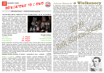 Biuletyn -20 informacyjny KONKURS RECYTATORSKI ZA NAMI. 14 marca w KulturBrauerei Russisches Theather odbył się pierwszy konkurs recytatorski “Posłuchaj mnie”, zorganizowany przez nasze Towarzystwo dla uczczenia 200. rocznicy urodzin i 160. rocznicy śmierci Juliusza Słowackiego. Według regulaminu każdy z uczestników proszony był o przygotowanie dwóch utworów, przy czym w grupie starszej obowiązkowo jeden utwór Słowackiego. Po eliminacjach klasowych, przyszedł czas na etap “teatralny”. Spośród 22 uczestników komisja w składzie: Agnieszka Redźko - przewod., Aleksandra Glodowski, Magdalena Lepianka - Nowak, Przemysław Walkowicz, Jakub Nowak wyłoniła zwycięzców w dwóch kategoriach wiekowych. W grupie starszej Filip Jarek Marek Wąsowski Damian Berdych W grupie młodszej I miejsce II miejsce III miejsce Julia Sowiński Weronika Kurzawska Santina Szczypior Komisja oceniała dobór i interpretację tekstów, emisję głosu, dykcję i wrażenie ogólne w skali od 1 do 5 punktów. Główną nagrodą dla zwycięzcy w grupie starszej będzie wycieczka na Ukrainę śladami Słowackiego (m.in. zwiedzanie Krzemieńca, miejsca urodzin poety), ufundowana przez PTS “Oświata”. Dzięki hojności sponsorów imprezy wszystkie dzieci zostały nagrodzone. Laureaci oprócz dyplomów i cennych książek ufundowanych przez Ambasadę RP i nasze Towarzystwo, otrzymali bony do sieci sklepów Saturn zasponsorowane przez Zbigniewa Glodowskiego. W grupie starszej za I miejsce - 50€, II miejsce - 40€, III miejsce - 30€. W grupie młodszej proporcjonalnie 40€, 30€, 20€. Wszyscy pozostali uczestnicy otrzymali bony o wartości 10€. A. Redźko Dziękujemy wszystkim uczestnikom, ich rodzicom i nauczycielom za pracę i życzliwość. A. Glodowski Refleksje po konkursie. Uzupełniając powyższą przyjaciół i nauczycieli występujących dzieci. O miłą, informację chciałabym podkreślić, że dzieci wspaniale uporały się z tremą i pięknie prezentowały wybrane przez nauczycieli utwory naszych sławnych poetów. To, że występowały na prawdziwej scenie teatralnej wcale ich nie przytłaczało, wręcz przeciwnie, u niektórych objawiły się prawdziwe talenty aktorskie!!! Na pewno cieszy to Przemka Walkowicza - aktora i reżysera teatru “Bez Paniki”, dzięki uprzejmości którego mogliśmy gościć w teatrze. Wiele emocji było nie tylko wśród uczestników, ale i wśród widzów - rodziców, atmosferę zadbali organizatorzy konkursu poprzez życzliwość i wyrozumiałość, przygotowanie nastrojowej dekoracji, serwowanie dzieciom łakoci, owoców i soków. Myślę, że prywatna inicjatywa Zbyszka Glodowskiego, by sfinansować zakup talonów dla wszystkich uczestników, nie pozostanie bez echa i będzie bodźcem dla rodziców i sympatyków naszej organizacji do wspierania kolejnych konkursów. Jestem bowiem przekonana, że ten pierwszy, zainicjowany z okazji Roku Juliusza Słowackiego, będzie w następnych latach kontynuowany! Anna Jas Juliusz Słowacki o Wielkanocy W wielkanocnych numerach poznańskiego “Tygodnika Literackiego”, które ukazały się 13 i 20 kwietnia 1840r., Antoni Woykowski zamieścił niepodpisaną opowieść pt. “Święcone u J.O. Księcia Radzwiłła Sierotki”, otrzymaną kilka miesięcy wcześniej z Paryża. Wkrótce okazało się, że jej autorem jest Juliusz Słowacki. Oto fragmenty: (...) kazawszy sobie podać jaje, obchodził wszystkich książę pan i każdemu podając jaje, składał życzenia pełne afektu - a nareszcie i piastunce swojej, która w kącie stojąc płakała z rozczulenia, podał talerz i pocałował w chude ręce staruszkę (...) Babko, rzekł J.O. Książę, na przyszłe święcone twój piastun będzie gdzieś na morzach, jak na huśtawce, a ty mi tu rób co roku święcone i czekaj i z kucją mnie czekaj co rok, aż zejdą gwiazdy. (...) W. Panowie (...) proszę się rozgościć. Obróciliśmy wtenczas oczy na święcone, a było na co popatrzeć, albowiem i tu pod prezydencją księcia kucharz wszystko tak urządził, że nie tylko apetytowi, ale i myśli było przyjemnym. W sali tej albowiem, śród mnóstwa drzew, z miodu lipowego była sadzawka z wyspą zielonym owsem pokrytą, na której się pasł święty baranek z chorągwią, mający oczy z dwóch karbunkułów ze skarbca J.O. Księcia wyjętych, które błyszczały niezmiernie. Na tego baranka godziło czterech dzików okropnej wielkości, upieczonych całkowicie, a dwanaście jeleni ze złoconymi rogami, w różnych pozyturach wyskakiwał z lasu, który był z drzew pomarańczowych, różnymi konfektami obrodzony. Gdy tu same mięsiwa, to w przyległej komnacie były ciasta i napoje nie mniej misternie ułożone. Nie lasy tam, ale baby podobne skałom nosiły na głowach z migdałowych murów grody i fortece, coś nawet podobnego Jerozolimie widać było, albowiem śród cukrowych domów ukryte ananasy koronami szarymi naśladowały palmowe drzewa, a w bramach zaś figurki cukrowe w szmalcowanych pancerzach i z krzyżami czerwonymi na piersiach, jako jerozolimscy rycerze za czasów Godfreda, stali na straży.” Słowacki w listach niejednokrotnie opisywał matce Wielkanoc na emigracji - pierwszy raz, z wielkim entuzjazmem, spędzoną u ks. Czartoryskich w 1832r. “Pierwszego dnia Wielkanocy odebrałem zaproszenie od księżnej C. na święcone w Pryżu!!! Bardzo mi to było miło znalazłem tam piękny świat, ale nasz - wszystko, co tylko jest znacznego, było zebrane koło stoła, na którym między potrawami francuskimi świeciły się - nasze kołduny - barszcz - nieznane to naleśniki z konfiturami. Ale nasze baby, o! Baby - tych już na całym świecie nie znajdę. Bab nie było - bo tutejszym biszkoptowym ciastom tego nazwiska dać nie mogę. I było to raczej polskie śniadanie, do czego jeszcze iluzji przydawały zawijane zrazy, od których zacząłem - zrazy zupełnie jak u Babuni. I powtarzam, niepodobne to było do święconego, a 