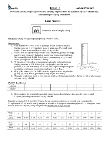 Klasa 6 Laboratorium Po wykonaniu każdego eksperymentu, spróbuj odpowiedzieć na pytania dotyczące obserwacji. Koniecznie przeczytaj komentarz! Czas reakcji Potrzebna pomoc drugiej osoby Przygotuj: linijkę o długości przynajmniej 30 cm ze skalą. Eksperyment: 1. Stań naprzeciw osoby, która ci pomaga. Niech osoba ta trzyma linijkę pionowo w wyciągniętej nieco w górę ręce. Początek skali (czyli „0”) musi się znajdować niżej niż jej koniec. 2. Ustaw dłoń na wysokości początku skali linijki tak, jakbyś chciał ją przytrzymać pomiędzy kciukiem a czterema pozostałymi palcami. Nie dotykaj jednak linijki. Jeżeli jesteś praworęczny, użyj prawej dłoni, jeżeli jesteś leworęczny – lewej. 3. W takiej pozycji czekaj aż pomagająca ci osoba puści znienacka linijkę pionowo w dół. Ważne jest, aby ją tylko puściła, a nie pchnęła ją w dół. Poruszając się w dół, linijka powinna przelatywać pomiędzy kciukiem a pozostałymi palcami twojej dłoni. 4. Gdy tylko zauważysz, że linijka została wypuszczona, natychmiast ją złap (tą samą dłonią, pomiędzy którą linijka przelatuje). 5. Odczytaj wartość ze skali w tym miejscu linijki, w którym ją złapałeś. Zapisz wynik w pierwszym wierszu twojej tabelki: TWOJA TABELKA Twój odczyt z linijki (cm) Twój odczyt czasu (s) 6. Korzystając z dwóch tabelek poniżej, znajdź czas odpowiadający twoim odczytom ze skali i zapisz go w drugim wierszu twojej tabelki. Zadanie w punktach 1-6 powtórz 10 razy. W ten sposób powinieneś wypełnić całą twoją tabelkę. Po wykonaniu 10 pomiarów dodaj wszystkie wartość z drugiego wiersza twojej tabelki, a następnie sumę podziel przez 10. Wynik, który otrzymasz to średni czas twojej reakcji. odczyt z linijki (cm) odczyt czasu (s) odczyt z linijki (cm) odczyt czasu (s) 6 7 8 9 10 11 12 13 14 15 16 17 0,111 0,119 0.128 0,135 0,143 0,150 0,156 0,163 0,169 0,175 0,181 0,186 18 19 20 21 22 23 24 25 26 27 28 29 0,191 0,197 0,202 0,207 0,212 0,216 0,221 0,226 0,230 0,234 0,239 0,243 Klasa 6 Laboratorium Komentarz: Człowiek reaguje na różne bodźce zewnętrzne (dotykowe, wzrokowe, słuchowe, węchowe, smakowe, cieplne) dzięki temu, że posiada układ nerwowy. Bodziec taki wywołuje ciąg zdarzeń w tym układzie. Informacja o bodźcu biegnie w układzie nerwowym człowieka w postaci sygnału od receptora, czyli miejsca, które jest zdolne odbierać bodziec (np. oko jest receptorem bodźców wzrokowych). Sygnał z receptora dociera do mózgu, a następnie wraca do odpowiedniej części ciała. Człowiek nigdy nie reaguje natychmiastowo, choć reakcje na bodźce są bardzo szybkie. Czas reakcji człowieka w doświadczeniu z linijką to około 0,1-0,2 s. W wielu sytuacjach życiowych jest bardzo ważne, aby był on jak najkrótszy. Wyobraź sobie na przykład, że jesteś kierowcą i jedziesz z prędkością 60 km/h, gdy znienacka przed twoje auto wyskakuje zwierzę. Wydaje się, że natychmiast instynktownie naciskasz na hamulec. Jednak Twoja reakcja tak naprawdę nie jest natychmiastowa. Jak długą drogę jeszcze przejedziesz, zanim naciśniesz hamulec? Jeżeli czas Twojej reakcji to 0,1 s – auto przejedzie ponad 1,6 m, jeżeli czas Twojej reakcji wynosi 0,2 s - auto przejedzie ponad 3 metry zanim zaczniesz w ogóle hamować. Nie zawsze czas reakcji tego samego człowieka jest identyczny. Sprinter skoncentrowany na zawodach ma na pewno krótszy czas reakcji na sygnał startera niż ten sam sprinter, przebywający na wakacjach, gdy wypada mu coś z ręki. Czasami wpływ na koncentrację, a tym samym na czas reakcji mają także warunki atmosferyczne. Słyszy się wówczas w telewizji zapowiedź podczas prognozy pogody „Uwaga kierowcy na drogach: warunki meteorologiczne mogą powodować opóźnienie czasu reakcji.”