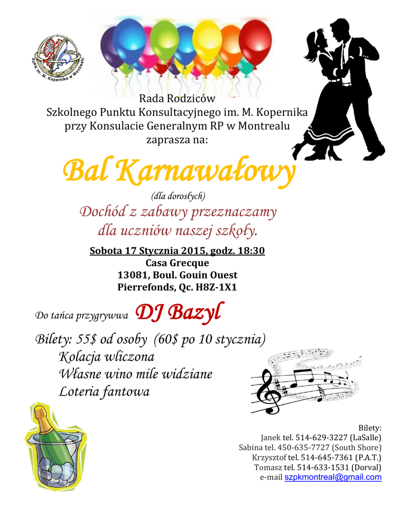 Rada Rodziców Szkolnego Punktu Konsultacyjnego im. M. Kopernika przy Konsulacie Generalnym RP w Montrealu zaprasza na: Bal Karnawałowy (dla dorosłych) Dochód z zabawy przeznaczamy dla uczniów naszej szkoły. Sobota 17 Stycznia 2015, godz. 18:30 Casa Grecque 13081, Boul. Gouin Ouest Pierrefonds, Qc. H8Z-1X1 Do tańca przygrywwa DJ Bazyl Bilety: 55$ od osoby (60$ po 10 stycznia) Kolacja wliczona Własne wino mile widziane Loteria fantowa Bilety: Janek tel. 514-629-3227 (LaSalle) Sabina tel. 450-635-7727 (South Shore) Krzysztof tel. 514-645-7361 (P.A.T.) Tomasz tel. 514-633-1531 (Dorval) e-mail [email protected]