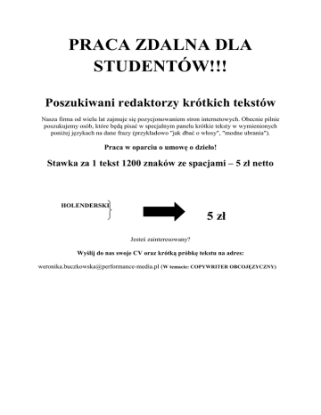 PRACA ZDALNA DLA STUDENTÓW!!! Poszukiwani redaktorzy krótkich tekstów Nasza firma od wielu lat zajmuje się pozycjonowaniem stron internetowych. Obecnie pilnie poszukujemy osób, które będą pisać w specjalnym panelu krótkie teksty w wymienionych poniżej językach na dane frazy (przykładowo "jak dbać o włosy", "modne ubrania"). Praca w oparciu o umowę o dzieło! Stawka za 1 tekst 1200 znaków ze spacjami – 5 zł netto HOLENDERSKI 5 zł Jesteś zainteresowany? Wyślij do nas swoje CV oraz krótką próbkę tekstu na adres: [email protected] (W temacie: COPYWRITER OBCOJĘZYCZNY)
