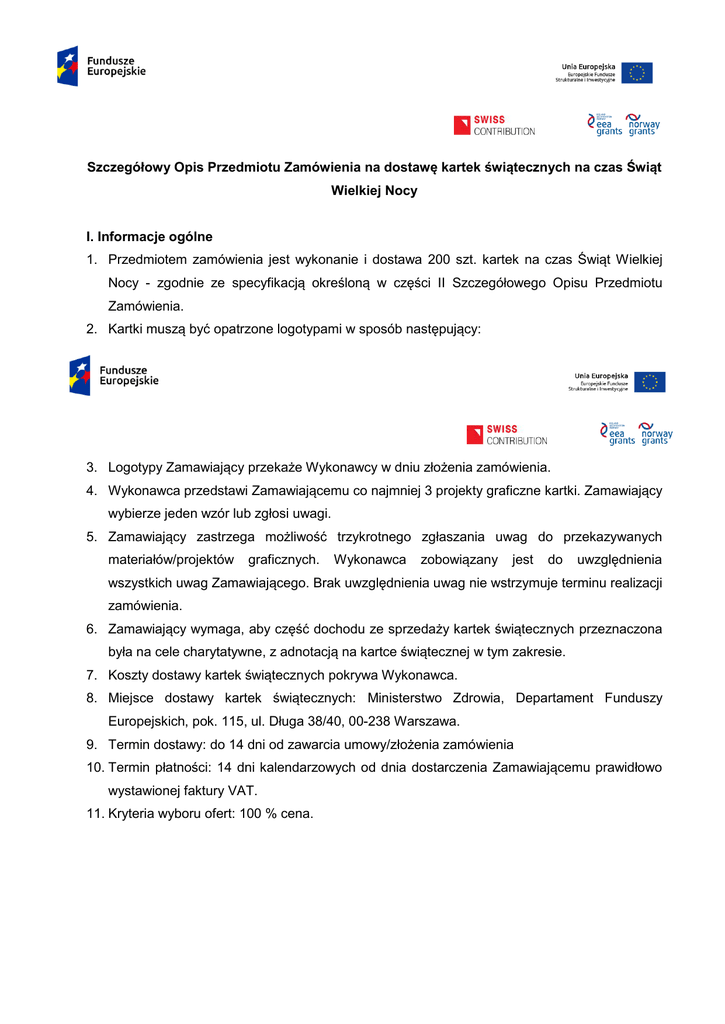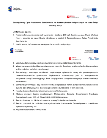 Szczegółowy Opis Przedmiotu Zamówienia na dostawę kartek świątecznych na czas Świąt Wielkiej Nocy I. Informacje ogólne 1. Przedmiotem zamówienia jest wykonanie i dostawa 200 szt. kartek na czas Świąt Wielkiej Nocy - zgodnie ze specyfikacją określoną w części II Szczegółowego Opisu Przedmiotu Zamówienia. 2. Kartki muszą być opatrzone logotypami w sposób następujący: 3. Logotypy Zamawiający przekaże Wykonawcy w dniu złożenia zamówienia. 4. Wykonawca przedstawi Zamawiającemu co najmniej 3 projekty graficzne kartki. Zamawiający wybierze jeden wzór lub zgłosi uwagi. 5. Zamawiający zastrzega możliwość trzykrotnego zgłaszania uwag do przekazywanych materiałów/projektów graficznych. Wykonawca zobowiązany jest do uwzględnienia wszystkich uwag Zamawiającego. Brak uwzględnienia uwag nie wstrzymuje terminu realizacji zamówienia. 6. Zamawiający wymaga, aby część dochodu ze sprzedaży kartek świątecznych przeznaczona była na cele charytatywne, z adnotacją na kartce świątecznej w tym zakresie. 7. Koszty dostawy kartek świątecznych pokrywa Wykonawca. 8. Miejsce dostawy kartek świątecznych: Ministerstwo Zdrowia, Departament Funduszy Europejskich, pok. 115, ul. Długa 38/40, 00-238 Warszawa. 9. Termin dostawy: do 14 dni od zawarcia umowy/złożenia zamówienia 10. Termin płatności: 14 dni kalendarzowych od dnia dostarczenia Zamawiającemu prawidłowo wystawionej faktury VAT. 11. Kryteria wyboru ofert: 100 % cena. II. Specyfikacja techniczna Specyfikacja techniczna: format: 150x150 mm (± 5 mm) papier: okładka biała lub kremowa z matowego papieru, gramatura: 350 g Nadruk okładki: 4+0 Życzenia i logotypy w środku: nadruk 4+0 koperta dostosowana do wielkości kartki treść życzeń: wersja polska i angielska Nadruk życzeń i logotypów, wg poniższego schematu: a) wersja polska (180 szt.) Niech nadchodzące Święta Wielkiej Nocy przyniosą same radosne i szczęśliwe dni oraz będą doskonałą okazją do spędzenia wspaniałych chwil w gronie najbliższych Dyrekcja oraz pracownicy Departamentu Funduszy Europejskich w Ministerstwie Zdrowia b) wersja angielska (20 szt.) The spirit of easter Is all about Hope, Love and joyful living Happy Easter! Director and staff of the Department of European Funds in Ministry of Health 2