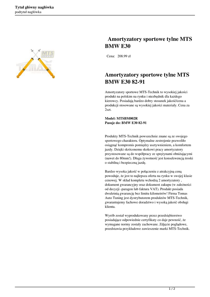 Tytuł główny nagłówka podtytuł nagłówka Amortyzatory sportowe tylne MTS BMW E30 Cena: 208.99 zł Amortyzatory sportowe tylne MTS BMW E30 82-91 Amortyzatory sportowe MTS-Technik to wysokiej jakości produkt na polskim na rynku i niezbędnik dla każdego kierowcy. Posiadają bardzo dobry stosunek jakość/cena a produkcji stosowane są wysokiej jakości materiały. Cena za 2szt. Model: MTSBM002R Pasuje do: BMW E30 82-91 Produkty MTS-Technik powszechnie znane są ze swojego sportowego charakteru. Optymalne zestrojenie pozwoliło osiągnąć kompromis pomiędzy usztywnieniem, a komfortem jazdy. Dzięki skróconemu skokowi pracy amortyzatory przystosowane są do współpracy ze sprężynami obniżającymi (nawet do 80mm!). Długa żywotność jest konsekwencją troski o stabilną i bezpieczną jazdę. Bardzo wysoka jakość w połączeniu z atrakcyjną ceną powoduje, że jest to najlepsza oferta na rynku w swojej klasie cenowej. W skład kompletu wchodzą 2 amortyzatory , dokument gwarancyjny oraz dokument zakupu (w zależności od decyzji -paragon lub faktura VAT). Produkt posiada dwuletnią gwarancję bez limitu kilometrów! Firma Tomas Auto Tuning jest dystrybutorem produktów MTS-Technik, gwarantujemy fachowe doradztwo i wysoką jakość obsługi klienta. Wyrób został wyprodukowany przez przedsiębiorstwo posiadające odpowiednie certyfikaty co daje pewność, że wymagane normy zostały zachowane. Zdjęcie poglądowe, przedstawia przykładowe zawieszenie marki MTS-Technik. 1/2 Tytuł główny nagłówka podtytuł nagłówka 2/2 Powered by TCPDF (www.tcpdf.org)