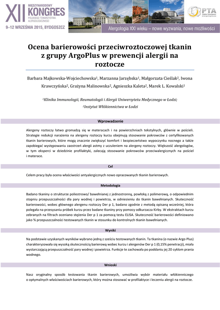 Ocena barierowości przeciwroztoczowej tkanin z grupy ArgoPlus w prewencji alergii na roztocze Barbara Majkowska-Wojciechowska1, Marzanna Jarzębska1, Małgorzata Cieślak2, Iwona Krawczyńska2, Grażyna Malinowska2, Agnieszka Kaleta2, Marek L. Kowalski1 1Klinika Immunologii, Reumatologii i Alergii Uniwersytetu Medycznego w Łodzi; 2Instytut Włókiennictwa w Łodzi Wprowadzenie Alergeny roztoczy łatwo gromadzą się w materacach i na powierzchniach tekstylnych, głównie w pościeli. Strategie redukcji narażenia na alergeny roztoczy kurzu obejmują stosowanie pokrowców z certyfikowanych tkanin barierowych, które mogą znacznie zwiększyć komfort i bezpieczeństwo wypoczynku nocnego a także zapobiegać występowaniu zaostrzeń alergii astmy z uczuleniem na alergeny roztoczy. Większość alergologów, w tym eksperci w dziedzinie profilaktyki, zalecają stosowanie pokrowców przeciwalergicznych na pościel i materace. Cel Celem pracy była ocena właściwości antyalergicznych nowo opracowanych tkanin barierowych. Metodologia Badano tkaniny o strukturze poliestrowo/ bawełnianej z jednostronną, powłoką z polimerową, o odpowiednim stopniu przepuszczalności dla pary wodnej i powietrza, w odniesieniu do tkanin bawełnianych. Skuteczność barierowości, wobec głównego alergenu roztoczy Der p 1, badano zgodnie z metodą opisaną wcześniej, która polegała na przesysaniu próbek kurzu przez badane tkaniny przy pomocy odkurzacza Kirby. W ekstraktach kurzu zebranych na filtrach oceniano stężenia Der p 1 za pomocą testu ELISA. Skuteczność barierowości definiowano jako % przepuszczalności testowanych tkanin w stosunku do kontrolnych tkanin bawełnianych. Wyniki Na podstawie uzyskanych wyników wybrano jedną z sześciu testowanych tkanin. Ta tkanina (o nazwie Argo Plus) charakteryzowała się wysoką skutecznością barierową wobec kurzu i alergenów Der p 1 (0,15% penetracji), miała wystarczającą przepuszczalność pary wodnej i powietrza. Funkcje te zachowała po poddaniu jej 20 cyklom prania wodnego. Wnioski Nasz oryginalny sposób testowania tkanin barierowych, umożliwia wybór materiału włókienniczego o optymalnych właściwościach barierowych, który można stosować w profilaktyce i leczeniu alergii na roztocze.
