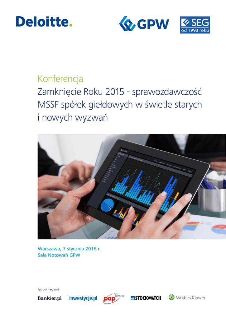 Konferencja Zamknięcie Roku 2015 - sprawozdawczość MSSF spółek giełdowych w świetle starych i nowych wyzwań Warszawa, 7 stycznia 2016 r. Sala Notowań GPW Patroni medialni Program konferencji 13:00 – 13:15 Rejestracja i kawa powitalna 13:15 – 13:25 Otwarcie konferencji Priorytety nadzorcze ESMA na rok 2015 – wytyczne dla emitentów • Inicjatywa Rady Międzynarodowych Standardów Rachunkowości dot. ujawnień 13:25 – 13:55 • Wpływ warunków na rynkach finansowych na sprawozdanie finansowe • Inne priorytety ESMA Monika Jakubczyk, Partner w Dziale Audytu Leasing dzisiaj i leasing w przyszłości • Rozliczanie sprzedaży i leasingu zwrotnego (MSR 17 i SKI 27) 13:55 – 14:25 • Wybrane aspekty nowego standardu o leasingu – aktualizacja statusu zmian Marcin Samolik, Starszy Menedżer, Zespół ds. Międzynarodowej Sprawozdawczości Finansowej Szczególne zagadnienia dotyczące transakcji w Grupie i podmiotami stowarzyszonymi • Klauzule rozwiązywania sporów a ocena współkontroli (MSSF 11) 14:25 – 14:55 • Zamiana zobowiązań na kapitał (KIMSF 19) • Nabycie jednostki stowarzyszonej etapami (MSR 27 i MSR 28) Przemysław Zawadzki, Dyrektor, Zespół ds. Międzynarodowej Sprawozdawczości Finansowej 14:55 – 15:10 Przerwa kawowa Wyzwania dla banków przy zamknięciu roku 2015 • Ujęcie wpłat na BFG i inne płatności nałożone na banki (IFRIC 21) 15:10 – 15:40 • Ujawnienia w zakresie ekspozycji restrukturyzowanych - główne wymogi i założenia Paweł Nowosadko, Dyrektor w Dziale Audytu, Sektor Finansowy Zalecenia i standardy dotyczące raportowania pozafinansowego. Czas na zmiany •Czynniki niefinansowe, a budowanie wartości firmy •Zobowiązania dla spółek wynikające z Dyrektywy 2014/95/UE ws. ujawniania informacji niefinansowych 15:40 – 16:10 •W jaki sposób spełnić wymagania Dyrektywy w praktyce, aby nie odbiegać od dobrych praktyk wypracowanych na rynku polskim? •Rola CFO w obliczu nowej Dyrektywy i zmian w zakresie raportowania spółek Irena Pichola, Partner w Zespole ds. zrównoważonego rozwoju w Polsce i w Europie Środkowej Nowy obraz cen transferowych w Polsce •Rozszerzenie zakresu obowiązków sprawozdawczych dla podmiotów powiązanych •Deklaracja CIT-TP – narzędzie służące ocenie przez administrację podatkową profilu oraz poziomu ryzyka w obszarze cen transferowych 16:10 – 16:40 •Rodzaje działalności biznesowej, które są postrzegane przez administrację podatkową jako główne obszary ryzyka w relacjach pomiędzy podmiotami powiązanymi •Jak osoby odpowiedzialne za finanse grupy oraz spółki mogą się przygotować do zmian w praktyce kontroli cen transferowych Iwona Georgijew, Partner w Dziale Doradztwa Podatkowego 16:40 – 17:10 Lunch Prelegenci Monika Jakubczyk Partner w Dziale Audytu Deloitte, Wiceprezes Zarządu Deloitte Polska Monika Jakubczyk nadzoruje i kieruje badaniami sprawozdań finansowych jak również projektami doradztwa rachunkowego i kontroli wewnętrznej w spółkach z różnych sektorów gospodarczych, ze szczególnym uwzględnieniem podmiotów notowanych na giełdzie warszawskiej. Swoje wieloletnie doświadczenie zawodowe zdobyła w Deloitte w Polsce oraz w Stanach Zjednoczonych. Monika Jakubczyk specjalizuje się w sprawozdawczości zgodnej z Międzynarodowymi Standardami Sprawozdawczości Finansowej (MSSF) oraz Amerykańskimi Standardami Sprawozdawczości Finansowej. Jest odpowiedzialna za współpracę Deloitte ze Stowarzyszeniem Emitentów Giełdowych i Giełdą Warszawską w zakresie Konferencji dotyczących sprawozdawczości MSSF. Jest również autorem licznych publikacji związanych z tematyką sprawozdawczości finansowej MSSF. Monika Jakubczyk jest członkiem ACCA, ukończyła studia International Master of Business Administration (MBA) na Politechnice Warszawskiej we współpracy z London Business School. E-mail: [email protected] Marcin Samolik Starszy Menedżer w Dziale Audytu, Zespół ds. Międzynarodowej Sprawozdawczości Finansowej Deloitte Jest członkiem Zespołu ds. Międzynarodowej Sprawozdawczości Finansowej od 2010 roku. Posiada ponad wieloletnie doświadczenie we współpracy z klientami z różnych branż, ze szczególnym uwzględnieniem spółek giełdowych. W ramach Zespołu MSSF, zajmuje się świadczeniem usług doradztwa w zakresie stosowania przepisów MSSF oraz interpretacji tych przepisów. Prowadzi też webcasty, konferencje, warsztaty i seminaria z zakresu MSSF oraz jest autorem licznych publikacji prasowych związanych z tematyką MSSF. Posiada uprawnienia biegłego rewidenta. E-mail: [email protected] Przemysław Zawadzki Dyrektor w Dziale Audytu, Zespół ds. Międzynarodowej Sprawozdawczości Finansowej Deloitte Przemysław Zawadzki jest Dyrektorem w dziale Audytu Deloitte, jest biegłym rewidentem oraz członkiem ACCA. Posiada wieloletnie doświadczenie audytorskie, zdobyte podczas pracy w Deloitte oraz uprawnienia biegłego rewidenta. Specjalizuje się w polskim prawie bilansowym oraz Międzynarodowych Standardach Sprawozdawczości Finansowej. E-mail: [email protected] Paweł Nowosadko Dyrektor w Dziale Audytu Deloitte Posiada wieloletnie doświadczenie w badaniu sprawozdań finansowych instytucji z sektora usług finansowych, głównie banków, funduszy i firm leasingowych. W trakcie swojej dotychczasowej kariery zajmował się również projektami o charakterze doradczym m.in. w zakresie implementacji MSSF i usprawnianiem procesów księgowych. Ma również bogate doświadczenie w projektach typu due-diligence oraz związanych z oceną ryzyka kredytowego. E-mail: [email protected] Irena Pichola Partner w Zespole ds. zrównoważonego rozwoju w Polsce i w Europie Środkowej Deloitte Doświadczony ekspert w obszarze zrównoważonego rozwoju. Wspólnie z kilkudziesięcioosobowym zespołem w Europie Środkowej doradza klientom w strategiach transformacji organizacji, raportowaniu, mierzeniu wpływu, zarządzaniu ryzykiem reputacyjnym 