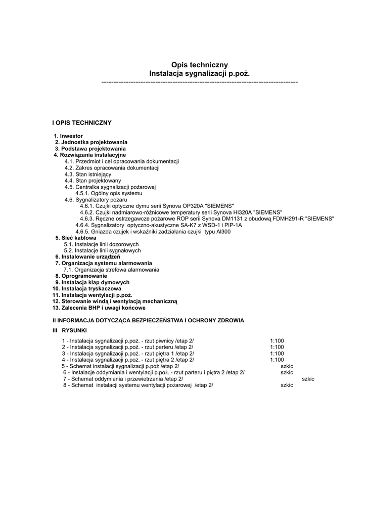 Opis techniczny Instalacja sygnalizacji p.poŜ. -------------------------------------------------------------------------------- I OPIS TECHNICZNY 1. Inwestor 2. Jednostka projektowania 3. Podstawa projektowania 4. Rozwiązania instalacyjne 4.1. Przedmiot i cel opracowania dokumentacji 4.2. Zakres opracowania dokumentacji 4.3. Stan istniejący 4.4. Stan projektowany 4.5. Centralka sygnalizacji poŜarowej 4.5.1. Ogólny opis systemu 4.6. Sygnalizatory poŜaru 4.6.1. Czujki optyczne dymu serii Synova OP320A "SIEMENS" 4.6.2. Czujki nadmiarowo-róŜnicowe temperatury serii Synova HI320A "SIEMENS" 4.6.3. Ręczne ostrzegawcze poŜarowe ROP serii Synova DM1131 z obudową FDMH291-R "SIEMENS" 4.6.4. Sygnalizatory optyczno-akustyczne SA-K7 z WSD-1 i PIP-1A 4.6.5. Gniazda czujek i wskaźniki zadziałania czujki typu Al300 5. Sieć kablowa 5.1. Instalacje linii dozorowych 5.2. Instalacje linii sygnałowych 6. Instalowanie urządzeń 7. Organizacja systemu alarmowania 7.1. Organizacja strefowa alarmowania 8. Oprogramowanie 9. Instalacja klap dymowych 10. Instalacja tryskaczowa 11. Instalacja wentylacji p.poŜ. 12. Sterowanie windą i wentylacją mechaniczną 13. Zalecenia BHP i uwagi końcowe II INFORMACJA DOTYCZĄCA BEZPIECZEŃSTWA I OCHRONY ZDROWIA III RYSUNKI 1 - Instalacja sygnalizacji p.poŜ. - rzut piwnicy /etap 2/ 2 - Instalacja sygnalizacji p.poŜ. - rzut parteru /etap 2/ 3 - Instalacja sygnalizacji p.poŜ. - rzut piętra 1 /etap 2/ 4 - Instalacja sygnalizacji p.poŜ. - rzut piętra 2 /etap 2/ 5 - Schemat instalacji sygnalizacji p.poŜ /etap 2/ 6 - Instalacje oddymiania i wentylacji p.poŜ. - rzut parteru i piętra 2 /etap 2/ 7 - Schemat oddymiania i przewietrzania /etap 2/ 8 - Schemat instalacji systemu wentylacji poŜarowej /etap 2/ 1:100 1:100 1:100 1:100 szkic szkic szkic szkic 1. Inwestor Kwidzyńskie Centrum Kultury ul. Katedralna 18, 82-500 Kwidzyn 2. Jednostka projektowania Przedsiębiorstwo Usługowo-Handlowe ELP-RO inŜ. Michał Pawłowski ul. Bydgoska 18/36 86-300 Grudziądz 3. Podstawa projektowania 3.1. Uzgodnienia z Inwestorem. 3.2. Wytyczne projektowe dla spełnienia wymagań ochrony przeciwpoŜarowej 3.3. Ustawa z dnia 07.07.1994r. Prawo Budowlane Dz.U.nr89 poz.414. 3.4. Zarządzenie ministra Spraw Wewnętrznych i Administracji z dnia 3.11.1998r. w sprawie szczegółowego zakresu i formy projektu budowlanego 9Dz.U. z 1998 r. Nr 140 ,poz. 906 ) 3.5. Rozporządzenie Ministra Infrastruktury z dnia 12.04.2002r. w sprawie warunków technicznych jakim powinny odpowiadać budynki i ich usytuowanie Dz.U. nr 75 poz.690 3.6. Uzgodnienia dokonywane w trakcie wykonywania dokumentacji. 4. Rozwiązania instalacyjne 4.1. Przedmiot i cel opracowania dokumentacji Przedmiotem opracowania jest ETAP 2 systemu sygnalizacji p.poŜ. dla obiektu kinoteatru w Kwidzynie. 4.2. Zakres opracowania dokumentacji Zakres niniejszego opracowania obejmuje: – – – kompletne rozwiązanie systemu sygnalizacji p.poŜ., rozmieszczenie urządzeń i elementów wykonawczych, organizację alarmu sygnalizacji p.poŜ. 4.3. Stan istniejący Budynek jest istniejący. Adoptowany budynek zbudowany został w latach sześćdziesiątych ub. wieku na miejscu dawnego budynku gminy ewangelickiej. Konstrukcja budynku - szkieletowa ramowo-słupowa, wypełnienie ścian murowane z cegły, słupy Ŝelbetowe. Stropy o rozpiętości 6m zelbetowe. Ścianki działowe murowane z cegły lub pustaków. Obudowa kanałów z cegły dzuiawki. Schody Ŝelbetowe wylewane na miejscu. Stropodach płyta Ŝelbetowa kryta papą membranową. Płyta fundamentowa i ściany piwnic Ŝelbetowe wykonywane na mokro. Zagospodarowanie budynku - piwnice: szatnie publicznosci i personelu, sale prób, sanitariaty, fosa orkiertry, magazyny, rozdzielnia elektryczna, akumulatornia, wentylatorownia, - parter: widownia, scena, kieszeń sceniczna, sanitariaty, foyer (wschodnie, środkowe, zachodnie, główne), hall wejściowy, kasy, komora pyłowa, - piętro 1: biura, sanitariaty, garderoby, sala prób, magazyny rekwizytów, projektorownia, - piętro 2: kabiny operatorów światła i dźwięku, biura, korytarz wentylacyjny, 4.4. Stan projektowany System sygnalizacji p.poŜ. etapu 2 podzielony jest na 4 pętle oraz 78 stref. Cały systemy projektuje się w oparciu o. centralę, manipulatory oraz czujki firmy „SIEMENS” w którego skład wchodzą: - analogowa adresowalna centrala typu FC 700A firmy „SIEMENS”, - akumulatory 12V/27Ah 2szt., - zestaw EPROM-ów FCA 185, - oprogramowanie serwisowe SWE 330A, - czujki optyczne dymu serii Synova OP320A "SIEMENS" w gniazdach SO320 z izolatorem zwarć, - czujki nadmiarowo-róŜnicowe temperatury serii Synova HI320A "SIEMENS" - ręczne manipulatory ROP wewnętrzne serii Synova DM1131 z obudową FDMH291-R "SIEMENS" - wskaźniki zadziałania czujek serii Synova AI30 "SIEMENS" - sygnalizatory optyczno-akustyczne SA-K7 "W2" z wyłącznikami sygnału dźwiękowego WSD-1 - puszki typu PIP-1A - przewody typu: - YnTKSY 1x2x0,8 /linia dozorowa adresowalna/ - Hdgs2x1ekwf /linia sygnalizacyjna/ - YTKSY2x2x0,6 /linia telefoniczna - monitoring/ - rurki RL21mm Systemy te umoŜliwiają identyfikację powstania poŜaru z dokładnością do pojedynczej czujki dozorowej /elementy adresowalne/ oraz sygnalizację optyczno-akustyczną i przekazywanie alarmu do systemu monitoringu w StraŜy PoŜarnej w Kwidzynie. Wszystkie elementy liniowe, oraz centralka sygnalizacji poŜarowej FC 700A firmy „SIEMENS” posiadają atest. 4.5. Centralka sygnalizacji poŜarowej Mikroprocesorowa centralka sygnalizacji poŜarowej centrala typu FC 700A firmy „SIEMENS” przeznaczona jest do akustycznego i optycznego sygnalizowania zagroŜenia poŜarowego oraz wskazania zagroŜonego miejsca na podstawie informacji odbieranych od ostrzegawczy poŜarowych zainstalowanych na liniach dozorowych, a takŜe do sterowania przeciwpoŜarowymi urządzeniami zabezpieczającymi i sygnalizacyjnymi. Centralka kontroluje takŜe sprawność urządzeń całego systemu, sygnalizuje