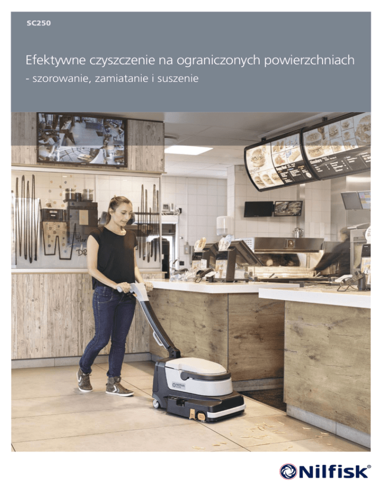 SC250 Efektywne czyszczenie na ograniczonych powierzchniach - szorowanie, zamiatanie i suszenie Regulowany uchwyt, który może zostać zablokowany przy czyszczeniu dużych powierzchni i łatwo odblokowany podczas czyszczenia pod meblami. Możliwość podniesienia listwy przedniej, aby łatwo zebrać większe zanieczyszczenia. Aby opróżnić, lub oczyścić tacę wystarczy ją wyciągnąć. Rozwiązanie zbiornika w zbiorniku ułatwia czyszczenie, napełnianie i opróżnianie. Czystość w każdym rogu Nilfisk SC250 to kompaktowy automat szorująco-zbierający przeznaczony do szybkiego i wydajnego czyszczenia twardych podłóg, który dotrze do każdego zakamarka, zapewniając skuteczne czyszczenie, również pod meblami i półkami. Lekka i wydajna maszyna nadająca się do pracy w dzień dzięki napędowi bateryjnemu, który znacznie zmniejsza poziom hałasu. Atrakcyjna oferta dla sklepów, szkół, restauracji, kawiarni, piekarni, sieci fast-food, hoteli, czy firm sprzątających. Wysoką wydajność zapewnia duża prędkość maszyny podczas jednoczesnego zamiatania, szorowania i suszenia w obu kierunkach, do przodu i wstecz. Cylindryczna 34-centymetrowa szczotka skutecznie usuwa zanieczyszczenia, śmieci i nawet najdrobniejsze cząstki pyłu. Aby uzyskać jeszcze większą skuteczność czyszczenia bez funkcji zamiatania, można zastosować opcjonalny wałek z mikrofibry. Łatwość manewrowania dzięki zastosowaniu obrotowych kółek i ergonomicznego regulowanego uchwytu. W celu łatwiejszego zebrania większych śmieci listwę przednią można łatwo podnieść z pozycji użytkownika podczas czyszczenia, bez potrzeby zatrzymywania maszyny. Dwa różne natężenia przepływu roztworu umożliwiają dostosowanie maszyny do zadania. Dwa proste sposoby na oszczędność czasu i kosztów bez pogorszenia wyników. • • • • • • • • • • • Wydajność: Równoczesne zamiatanie, szorowanie i suszenie. Wysoka skuteczność czyszczenia: Szczotka cylindryczna 34 cm lub wałek z mikrofibry. Efektywność: Pojemnik roztworu i pojemnik na nieczystości o pojemności 6 litrów zapewnia do 40 minut pracy bez konieczności uzupełniania. Moc: Bateria litowa Nilfisk 36V. Łatwa obsługa: Ergonomiczny uchwyt można ustawić w różnych pozycjach, jako swobodny, ruchomy, lub złożyć na czas przechowywania. Intuicyjna obsługa: Czytelny wyświetlacz umieszczony na uchwycie. Pełna kontrola: Uruchamianie wszystkich niezbędnych funkcji jednym przyciskiem oraz przełączniki sensorowe w uchwycie zapewniające wygodę obsługi. Nieprzerwane czyszczenie: Możliwość zmiany dwóch ustawień wody/roztworu podczas pracy. Bezpieczeństwo: Alarm chroniący maszynę w przypadku braku wody. Wygoda: Kompaktowa budowa i niska waga zapewniają łatwość transportu i przemieszczania. Niskie koszty eksploatacji: Wysoka trwałość i przeglądy, serwis i konserwacja bez użycia narzędzi. Dokładne czyszczenie spełniające higieniczne klinik i szpitali. wymagania Łatwe i szybkie czyszczenie podłóg - jednoczesne zamiatanie, szorowanie i suszenie. Niezawodność to nasza dewiza Maszyna SC250 zasilana jest baterią litową, która jest znacznie lżejsza i oferuje dłuższy czas użytkowania od tradycyjnych akumulatorów. Dzięki temu czas ciągłego czyszczenia to aż 40 minut. Dane Techniczne Opis Jednostka Numer katalogowy SC250 9087380020 Pobór mocy V 36 Moc znamionowa W 300 Poziom ciśnienia akustycznego dB(A) 66 ±3 Wydajność teoretyczna/praktyczna m2/h 1360/680 Szerokość czyszczenia mm 340 Zbiornik roztworu/nieczystości litr 6/6 Nacisk szczotki kg max. 12 Prędkość obrotowa szczotki obr./min. 1000 Max. czas pracy min 40 Długość x szerokość x wysokość mm 630x425x400 Ciężar samej maszyny kg 25 Ciężar maszyny gotowej do pracy kg 32 Standardowa, biała szczotka walcowa • Taca na zanieczyszczenia • Ładowarka • Bateria • Urządzenie Nilfisk działa w sposób optymalny, kiedy jest regularnie serwisowane i konserwowane. Z tego względu stworzyliśmy rozwiązania serwisowe dostosowane do różnych potrzeb użytkowników. Trzy poziomy serwisowania odpowiadające różnym wymogom i zapewniające w ramach dostępnych opcji zastępcze urządzenie w krytycznych sytuacjach. Pakiet StandardProfesjonalna konserwacja Pakiet PlusOptymalne wyniki Pakiet PremiumMaksymalizacja czasu pracy W tym podstawowym pakiecie zapewniamy wykonywanie przeglądów okresowych przez wykwalifikowanych i regularnie szkolonych techników Nilfisk oraz kontrolę nad kosztami dojazdu i robocizny w ramach usługi. W rozwiązaniu Plus gwarantujemy kontrolę nad kosztami robocizny i dojazdu do wszystkich przeglądów i napraw oraz pewność, że Twoja wydajność nigdy nie spadnie. Jeżeli Twoim priorytetem jest czas sprawnego działania, to ten program jest dla Ciebie. W tym rozbudowanym pakiecie uwzględnione są wszystkie niespodziewane koszty związane z eksploatacją maszyny (także te związane np. z nieprawidłowym użytkowaniem maszyny). Nilfisk Polska Sp. zo.o. Ul. 3 Maja 8 | 05-800 Pruszków Tel.: +48 22 738 37 50 · Fax: +48 22 738 37 51 [email protected] www.nilfisk.pl 96031406-02/16 CECHY: