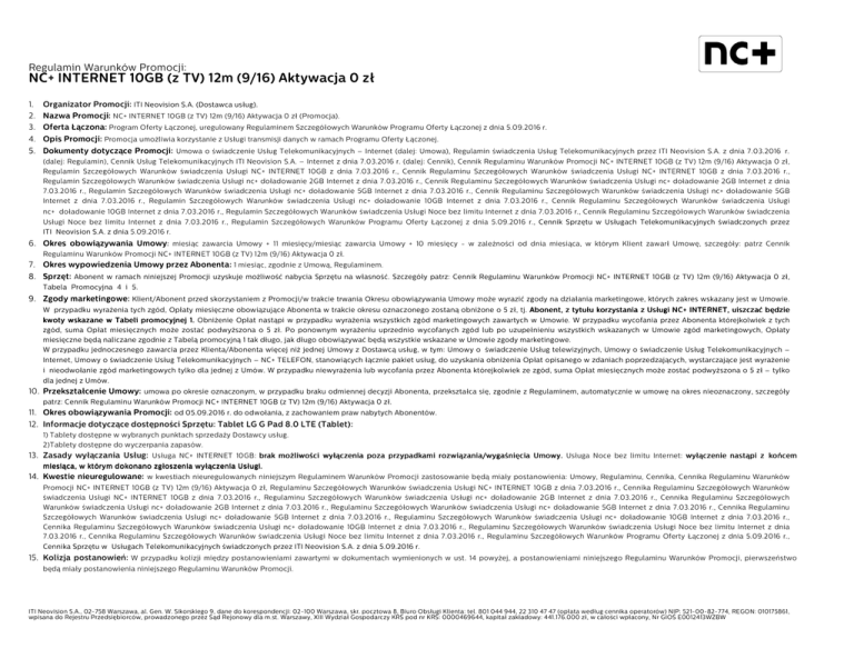 Regulamin Warunków Promocji: NC+ INTERNET 10GB (z TV) 12m (9/16) Aktywacja 0 zł 1. 2. 3. 4. 5. Organizator Promocji: ITI Neovision S.A. (Dostawca usług). Nazwa Promocji: NC+ INTERNET 10GB (z TV) 12m (9/16) Aktywacja 0 zł (Promocja). Oferta Łączona: Program Oferty Łączonej, uregulowany Regulaminem Szczegółowych Warunków Programu Oferty Łączonej z dnia 5.09.2016 r. Opis Promocji: Promocja umożliwia korzystanie z Usługi transmisji danych w ramach Programu Oferty Łączonej. Dokumenty dotyczące Promocji: Umowa o świadczenie Usług Telekomunikacyjnych – Internet (dalej: Umowa), Regulamin świadczenia Usług Telekomunikacyjnych przez ITI Neovision S.A. z dnia 7.03.2016 r. (dalej: Regulamin), Cennik Usług Telekomunikacyjnych ITI Neovision S.A. – Internet z dnia 7.03.2016 r. (dalej: Cennik), Cennik Regulaminu Warunków Promocji NC+ INTERNET 10GB (z TV) 12m (9/16) Aktywacja 0 zł, Regulamin Szczegółowych Warunków świadczenia Usługi NC+ INTERNET 10GB z dnia 7.03.2016 r., Cennik Regulaminu Szczegółowych Warunków świadczenia Usługi NC+ INTERNET 10GB z dnia 7.03.2016 r., Regulamin Szczegółowych Warunków świadczenia Usługi nc+ doładowanie 2GB Internet z dnia 7.03.2016 r., Cennik Regulaminu Szczegółowych Warunków świadczenia Usługi nc+ doładowanie 2GB Internet z dnia 7.03.2016 r., Regulamin Szczegółowych Warunków świadczenia Usługi nc+ doładowanie 5GB Internet z dnia 7.03.2016 r., Cennik Regulaminu Szczegółowych Warunków świadczenia Usługi nc+ doładowanie 5GB Internet z dnia 7.03.2016 r., Regulamin Szczegółowych Warunków świadczenia Usługi nc+ doładowanie 10GB Internet z dnia 7.03.2016 r., Cennik Regulaminu Szczegółowych Warunków świadczenia Usługi nc+ doładowanie 10GB Internet z dnia 7.03.2016 r., Regulamin Szczegółowych Warunków świadczenia Usługi Noce bez limitu Internet z dnia 7.03.2016 r., Cennik Regulaminu Szczegółowych Warunków świadczenia Usługi Noce bez limitu Internet z dnia 7.03.2016 r., Regulamin Szczegółowych Warunków Programu Oferty Łączonej z dnia 5.09.2016 r., Cennik Sprzętu w Usługach Telekomunikacyjnych świadczonych przez ITI Neovision S.A. z dnia 5.09.2016 r. 6. Okres obowiązywania Umowy: miesiąc zawarcia Umowy + 11 miesięcy/miesiąc zawarcia Umowy + 10 miesięcy - w zależności od dnia miesiąca, w którym Klient zawarł Umowę, szczegóły: patrz Cennik Regulaminu Warunków Promocji NC+ INTERNET 10GB (z TV) 12m (9/16) Aktywacja 0 zł. 7. Okres wypowiedzenia Umowy przez Abonenta: 1 miesiąc, zgodnie z Umową, Regulaminem. 8. Sprzęt: Abonent w ramach niniejszej Promocji uzyskuje możliwość nabycia Sprzętu na własność. Szczegóły patrz: Cennik Regulaminu Warunków Promocji NC+ INTERNET 10GB (z TV) 12m (9/16) Aktywacja 0 zł, Tabela Promocyjna 4 i 5. 9. Zgody marketingowe: Klient/Abonent przed skorzystaniem z Promocji/w trakcie trwania Okresu obowiązywania Umowy może wyrazić zgody na działania marketingowe, których zakres wskazany jest w Umowie. W przypadku wyrażenia tych zgód, Opłaty miesięczne obowiązujące Abonenta w trakcie okresu oznaczonego zostaną obniżone o 5 zł, tj. Abonent, z tytułu korzystania z Usługi NC+ INTERNET, uiszczać będzie kwoty wskazane w Tabeli promocyjnej 1. Obniżenie Opłat nastąpi w przypadku wyrażenia wszystkich zgód marketingowych zawartych w Umowie. W przypadku wycofania przez Abonenta którejkolwiek z tych zgód, suma Opłat miesięcznych może zostać podwyższona o 5 zł. Po ponownym wyrażeniu uprzednio wycofanych zgód lub po uzupełnieniu wszystkich wskazanych w Umowie zgód marketingowych, Opłaty miesięczne będą naliczane zgodnie z Tabelą promocyjną 1 tak długo, jak długo obowiązywać będą wszystkie wskazane w Umowie zgody marketingowe. W przypadku jednoczesnego zawarcia przez Klienta/Abonenta więcej niż jednej Umowy z Dostawcą usług, w tym: Umowy o świadczenie Usług telewizyjnych, Umowy o świadczenie Usług Telekomunikacyjnych – Internet, Umowy o świadczenie Usług Telekomunikacyjnych – NC+ TELEFON, stanowiących łącznie pakiet usług, do uzyskania obniżenia Opłat opisanego w zdaniach poprzedzających, wystarczające jest wyrażenie i nieodwołanie zgód marketingowych tylko dla jednej z Umów. W przypadku niewyrażenia lub wycofania przez Abonenta którejkolwiek ze zgód, suma Opłat miesięcznych może zostać podwyższona o 5 zł – tylko dla jednej z Umów. 10. Przekształcenie Umowy: umowa po okresie oznaczonym, w przypadku braku odmiennej decyzji Abonenta, przekształca się, zgodnie z Regulaminem, automatycznie w umowę na okres nieoznaczony, szczegóły patrz: Cennik Regulaminu Warunków Promocji NC+ INTERNET 10GB (z TV) 12m (9/16) Aktywacja 0 zł. 11. Okres obowiązywania Promocji: od 05.09.2016 r. do odwołania, z zachowaniem praw nabytych Abonentów. 12. Informacje dotyczące dostępności Sprzętu: Tablet LG G Pad 8.0 LTE (Tablet): 1) Tablety dostępne w wybranych punktach sprzedaży Dostawcy usług. 2)Tablety dostępne do wyczerpania zapasów. 13. Zasady wyłączania Usług: Usługa NC+ INTERNET 10GB: brak możliwości wyłączenia poza przypadkami przypadkam i rozwiązania/wygaśnięcia Umowy. Usługa Noce bez limitu Internet: wyłączenie nastąpi z końcem miesiąca, w którym dokonano zgłoszenia wyłączenia Usługi. Usługi. 14. Kwestie nieuregulowane: w kwestiach nieuregulowanych niniejszym Regulaminem Warunków Promocji zastosowanie będą miały postanowienia: Umowy, Regulaminu, Cennika, Cennika Regulaminu Warunków Promocji NC+ INTERNET 10GB (z TV) 12m (9/16) Aktywacja 0 zł, Regulaminu Szczegółowych Warunków świadczenia Usługi NC+ INTERNET 10GB z dnia 7.03.2016 r., Cennika Regulaminu Szczegółowych Warunków świadczenia Usługi NC+ INTERNET 10GB z dnia 7.03.2016 r., Regulaminu Szczegółowych Warunków świadczenia Usługi nc+ doładowanie 2GB Internet z dnia 7.03.2016 r., Cennika Regulaminu Szczegółowych Warunków świadczenia Usługi nc+ doładowanie 2GB Internet z dnia 7