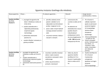 Egzaminy Instytutu Goethego dla młodzieży Nazwa egzaminu Chcesz … Goethe-Zertifikat A1: Fit in Deutsch 1 Po zdanym egzaminie … przystąpić do egzaminu dla Uwagi /poziom porównywalny z maturą … uczniów w wieku od 10 zakłada znajomość 10 do 16 lat. odpowiedzi oraz formułować lat. języka na pierwszym W zależności od poziomie biegłości pisać o sobie i innych ludziach doświadczenia w nauce A1 Europejskiego znajomości języka używając prostych zwrotów i języków obcych i niemieckiego. zdań. indywidualnych predyspozycji ocenia Systemu Opisu Kształcenia prośby i reagować na nie. potwierdzić ukończenie poziomu A1. zrozumieć rozmowy i teksty o rzeczach ci znanych. uzyskać oficjalny i uznawany za przystąpić do egzaminu dla młodzieży w wieku od 12 do 16 lat uzyskać zaświadczenie o podstawowej znajomości języka niemieckiego potwierdzić ukończenie poziomu A2 rozumiesz i potrafisz stosować Językowego . się czas przygotowania na 80 – 200 jednostek lekcyjnych po 45 min. granicą certyfikat. Fit in Deutsch 1 pytania i udzielać na nie najbardziej podstawowej Goethe-Zertifikat A2: Fit in Deutsch przeznaczony dla dzieci i młodzieży w wieku od uzyskać zaświadczenie o potrafisz zadawać proste Warunki Zaleca się, aby do matura podstawowa – od 30% do 75%. Potrafi prowadzić prostą rozmowę pod warunkiem, że rozmówca mówi wolno, zrozumiale i jest chętny do pomocy. Goethe-Zertifikat A2: zdania i często używane egzaminu Goethe- Fit in Deutsch wyrażenia w sytuacjach z życia codziennego. Zertifikat A2: Fit in Deutsch 2 podchodziły 2 potwierdza umiejętności umiesz się porozumieć w dzieci w wieku od 10 językowe na drugim prostych, rutynowych lat. poziomie (A2) Europejskiego uzyskać oficjalny i uznawany za granicą certyfikat sytuacjach, wymagających Aby osiągnąć ten Systemu Opisu jedynie wymiany informacji na poziom, potrzebnych Kształcenia znane i typowe tematy. jest – w zależności od Językowego umiesz opisać w prosty sposób nabytych wcześniej swoje pochodzenie i – od 76% do 100%; wykształcenie, bezpośrednie umiejętności – od 200 do 350 godzin otoczenie oraz rzeczy związane z lekcyjnych po 45 rozszerzona – od 30% najważniejszymi potrzebami minut. do 65%. lub matura życia codziennego. matura podstawowa Potrafi porozumiewać się w prostych sytuacjach komunikacyjnych, wymagających jedynie bezpośredniej wymiany zdań na tematy znane i typowe. Goethe-Zertifikat B1 uczęszczać w Niemczech do college’u przygotowującego do podjęcia studiów. mieszkać i pracować w Niemczech. potwierdzić ukończenie poziomu B1. uzyskać oficjalny i uznawany za granicą certyfikat. umiejętność zrozumienia Goethe-Zertifikat B1 Goethe-Zertifikat B1 głównych wątków przekazu dla młodzieży jest zakłada znajomość zawartego w jasnych, odpowiedni dla osób, języka niemieckiego standardowych wypowiedziach, które ukończyły 12 lat. na trzecim poziomie Goethe-Zertifikat B1 kompetencji osobie spraw i zdarzeń typowych dla pracy, szkoły, czasu wolnego dla dorosłych jest odpowiedni dla osób, językowej (B1) Europejskiego itd. które ukończyły 16 lat. Systemu Opisu które dotyczą znanych danej umiejętność poradzenia sobie w W zależności od Kształcenia większości sytuacji doświadczenia w nauce Językowego komunikacyjnych, które mogą języków obcych i się zdarzyć podczas podróży w indywidualnych krajach niemieckojęzycznych. umiejętność formułowania predyspozycji ocenia się czas przygotowania prostych i spójnych wypowiedzi na 350 – 650 jednostek na tematy, które są danej osobie lekcyjnych po 45 min. matura rozszerzona – od 66% do 100% znane bądź ją interesują. umiejętność opisywania doświadczeń, zdarzeń, nadziei, marzeń i zamierzeń oraz umiejętność formułowania krótkich uzasadnień bądź wyjaśnień. Goethe-Zertifikat B2 ukończone 16 lat złożonych tekstach na tematy zależności od doświadczenia w nauce konkretne i abstrakcyjne, łącznie języków obcych i na poziomie zawodowych zaawansowaną z rozumieniem dyskusji na indywidualnych kompetencji znajomość języka niemieckiego. tematy techniczne z zakresu jej językowej specjalności. predyspozycji ocenia się czas przygotowania potrafisz porozumiewać się na na 600 – 800 jednostek Systemu Opisu tyle płynnie i spontanicznie, by prowadzić normalną rozmowę z lekcyjnych po 45 min. Kształcenia Językowego uczęszczać w Niemczech do college’u przygotowującego do podjęcia studiów. potwierdzić w celach przygotować się do pracy w branży medycznej. potwierdzić ukończenie rozumiesz znaczenie głównych wątków przekazu zawartego w rodzimym użytkownikiem języka, Goethe-Zertifikat B2 zakłada znajomość języka niemieckiego B2 Europejskiego – tzn. powyżej poziomu B2 uzyskać oficjalny i uznawany za granicą certyfikat. nie powodując przy tym napięcia poziomu matury u którejkolwiek ze stron. rozszerzonej. potrafisz – w szerokim zakresie tematów – formułować przejrzyste i szczegółowe wypowiedzi ustne lub pisemne, a także wyjaśniać swoje stanowisko w sprawach będących przedmiotem dyskusji, rozważając wady i zalety różnych rozwiązań. Informacje o pozostałych egzaminach Instytutu Goethego na stronie: Goethe Institut Polen Źródło: www.goethe.de oprac. Aneta Tomasz-Majoch Aneta Tomasz-Majoch – nauczycielka języka niemieckiego; od 20 lat przygotowuje z sukcesem młodzież oraz osoby dorosłe do egzaminów Instytutu Goethego na poziomach kompetencji językowej A1, A2, B1 oraz B2 Europejskiego Systemu Opisu Kształcenia Językowego w ramach dodatkowych zajęć projektowych realizowanych przez szkołę oraz kursów organizowanych przez podmioty zewnętrzne