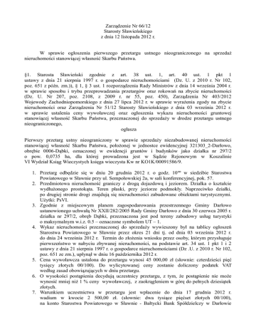 Zarządzenie Nr 66/12 Starosty Sławieńskiego z dnia 12 listopada 2012 r. W sprawie ogłoszenia pierwszego przetargu ustnego nieograniczonego na sprzedaż nieruchomości stanowiącej własność Skarbu Państwa. §1. Starosta Sławieński zgodnie z art. 38 ust. 1, art. 40 ust. 1 pkt 1 ustawy z dnia 21 sierpnia 1997 r. o gospodarce nieruchomościami (Dz. U. z 2010 r. Nr 102, poz. 651 z późn. zm.)), § 1, § 3 ust. 1 rozporządzenia Rady Ministrów z dnia 14 września 2004 r. w sprawie sposobu i trybu przeprowadzania przetargów oraz rokowań na zbycie nieruchomości (Dz. U. Nr 207, poz. 2108, z 2009 r. nr 55, poz. 450), Zarządzenia Nr 403/2012 Wojewody Zachodniopomorskiego z dnia 27 lipca 2012 r. w sprawie wyrażenia zgody na zbycie nieruchomości oraz Zarządzenia Nr 51/12 Starosty Sławieńskiego z dnia 03 września 2012 r. w sprawie ustalenia ceny wywoławczej oraz ogłoszenia wykazu nieruchomości gruntowej stanowiącej własność Skarbu Państwa, przeznaczonej do sprzedaży w drodze przetargu ustnego nieograniczonego, ogłasza Pierwszy przetarg ustny nieograniczony w sprawie sprzedaży niezabudowanej nieruchomości stanowiącej własność Skarbu Państwa, położonej w jednostce ewidencyjnej 321303_2-Darłowo, obrębie 0006-Dąbki, oznaczonej w ewidencji gruntów i budynków jako działka nr 297/2 o pow. 0,0735 ha, dla której prowadzona jest w Sądzie Rejonowym w Koszalinie VI Wydział Ksiąg Wieczystych księga wieczysta Kw nr KO1K/00091586/9. 1. Przetarg odbędzie się w dniu 20 grudnia 2012 r. o godz. 10ºº w siedzibie Starostwa Powiatowego w Sławnie przy ul. Sempołowskiej 2a, w sali konferencyjnej, pok. 57. 2. Przedmiotowa nieruchomość graniczy z drogą dojazdową i jeziorem. Działka o kształcie wydłużonego prostokąta. Teren płaski, przy jeziorze podmokły. Naprzeciwko działki, po drugiej stronie drogi znajdują się nieruchomości zabudowane obiektami turystycznymi. Użytki: PsVI. 3. Zgodnie z miejscowym planem zagospodarowania przestrzennego Gminy Darłowo ustanowionego uchwałą Nr XXII/282/2005 Rady Gminy Darłowo z dnia 30 czerwca 2005 r. działka nr 297/2, obręb Dąbki, przeznaczona jest pod tereny zabudowy usług turystyki o maksymalnym w.i.z. 0.5 – oznaczone symbolem UT – 1. 4. Wykaz nieruchomości przeznaczonej do sprzedaży wywieszony był na tablicy ogłoszeń Starostwa Powiatowego w Sławnie przez okres 21 dni tj. od dnia 03 września 2012 r. do dnia 24 września 2012 r. Termin do złożenia wniosku przez osoby, którym przysługuje pierwszeństwo w nabyciu zbywanej nieruchomości, na podstawie art. 34 ust. 1 pkt 1 i 2 ustawy z dnia 21 sierpnia 1997 r. o gospodarce nieruchomościami (Dz .U. z 2010 r. Nr 102, poz. 651 ze zm.), upłynął w dniu 16 października 2012 r. 5. Cena wywoławcza ustalona do przetargu wynosi 45 000,00 zł (słownie: czterdzieści pięć tysięcy złotych 00/100). Do wylicytowanej ceny zostanie doliczony podatek VAT według zasad obowiązujących w dniu przetargu. 6. O wysokości postąpienia decydują uczestnicy przetargu, z tym, że postąpienie nie może wynosić mniej niż 1 % ceny wywoławczej, z zaokrągleniem w górę do pełnych dziesiątek złotych. 7. Warunkiem uczestnictwa w przetargu jest wpłacenie do dnia 17 grudnia 2012 r. wadium w kwocie 2 500,00 zł. (słownie: dwa tysiące pięćset złotych 00/100), na konto Starostwa Powiatowego w Sławnie - Bałtycki Bank Spółdzielczy w Darłowie nr 79 8566 0003 00004141 2000 0007. Za termin wniesienia wadium uważa się dzień jego wpływu na rachunek bankowy. 8. Wpłacenie wadium jest równoznaczne z zapoznaniem się z Rozporządzeniem Rady Ministrów z dnia 14 września 2004 r. w sprawie sposobu i trybu przeprowadzania przetargów oraz rokowańna zbycie nieruchomości (Dz. U. Nr 207, poz. 2108 z późn. zm.). 9. Osoba fizyczna winna przybyć na przetarg z dowodem osobistym, stosownym pełnomocnictwem z notarialnie potwierdzonym podpisem osoby upoważniającej (dotyczy pełnomocników) i dowodem wpłaty wadium, a osoba prawna i jednostka organizacyjna nie posiadająca osobowości prawnej, a podlegająca wpisowi do rejestru, z aktualnym wyciągiem z właściwego rejestru (nie późniejszych aniżeli 3 miesiące), stosownym pełnomocnictwem, dowodem wpłaty wadium oraz dowodami tożsamości osób reprezentujących podmiot. W przypadku przystąpienia do przetargu przez jednego z małżonków z pisemna zgoda współmałżonka, z potwierdzonym notarialnie podpisem, na zakup nieruchomości do wspólnego majątku. 10. Przetarg będzie ważny bez względu na liczbę uczestników, a rozstrzygnięcie jego pozytywne, jeżeli przynajmniej jeden uczestnik zaoferuje co najmniej jedno postąpienie powyżej ceny wywoławczej. 11. Wadium wniesione przez oferenta, który przetarg wygrał zalicza się na poczet ceny nabycia nieruchomości. Pozostałym uczestnikom wadium zwraca się niezwłocznie, nie później niż trzy dni od dnia rozstrzygnięcia przetargu na wskazane przez nich konto. Nabywca nieruchomości zawiadomiony zostanie o miejscu i terminie zawarcia umowy sprzedaży najpóźniej w ciągu 21 dni od dnia rozstrzygnięcia przetargu. Wyznaczony termin nie może być krótszy niż 7 dni od dnia doręczenia zawiadomienia. W razie uchylenia się nabywcy od zawarcia umowy sprzedaży, wpłacone wadium przepada na rzecz sprzedającego. Koszty związane z przeniesieniem własności nieruchomości tj. koszt umowy notarialnej, wypisów z aktu oraz wpisów do ksiąg wieczystych ponosi nabywca. Przed zawarciem aktu notarialnego, oferent zobowiązany jest do wpłacenia ceny nabycia, która płatna jest jednorazowo najpóźniej na trzy dni przed sporządzeniem umowy notarialnej zbycia nieruchomości (data wpływu pieniędzy na konto sprzedającego). 12. Zastrzega się prawo odwołania przetargu z ważnych powodów. Ogłoszenie o przetargu zostało opublikowane na stronie internetowej www.bip.powiatslawno.pl. Szczegółowe informacje dotyczące zbywanych nieruchomości można uzyskać w 