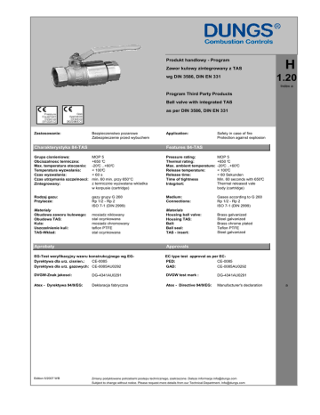 Produkt handlowy - Program Zawor kulowy zintegrowany z TAS wg DIN 3586, DIN EN 331 H 1.20 Index a Program Third Party Products Ball valve with integrated TAS as per DIN 3586, DIN EN 331 Zastosowanie: Bezpieczenstwo pozarowe Zabezpieczenie przed wybuchem Charakterystyka 84-TAS Application: Safety in case of fire Protection against explosion Features 84-TAS Grupa cisnieniowa: Obciazalnosc termiczna: Max. temperatura otoczenia: Temperatura wyzwalania: Czas wyzwalania: Czas utrzymania szczelnosci: Zintegrowany: MOP 5 +650 °C -20°C ..+60°C < 100°C < 60 s min. 60 min. przy 650°C z termicznie wyzwalana wkladka w korpusie (cartridge) Pressure rating: Thermal rating: Max. ambient temperature: Release temperature: Release time: Time of tightness Integriert: MOP 5 +650 °C -20°C ..+60°C < 100°C < 60 Sekunden Min. 60 seconds with 650°C Thermal released vale body (cartridge) Rodzaj gazu: Przylacze: gazy grupy G 260 Rp 1/2 - Rp 2 ISO 7-1 (DIN 2999) Medium: Connections: Gases according to G 260 Rp 1/2 - Rp 2 ISO 7-1 (DIN 2999) Materialy Obudowa zaworu kulowego: Obudowa TAS: Kula: Uszczelnienie kuli: TAS-Wklad: mosiadz niklowany stal ocynkowana mosiadz chromowany teflon PTFE stal ocynkowana Materials Housing ball valve: Housing TAS: Ball: Ball seal: TAS - insert: Brass galvanized Steel galvanized Brass chrome plated Teflon PTFE Steel galvanized Aprobaty Approvals EG-Test weryfikacyjny wzoru konstrukcyjnego wg EGDyrektywa dla urz. cisnien.: CE-0085 Dyrektywa dla urz. gazowych: CE-0085AU0292 EC type test approval as per ECPED: CE-0085 GAD: CE-0085AU0292 DVGW-Znak jakosci: DG-4341AU0291 DVGW test mark : DG-4341AU0291 Atex - Dyrektywa 94/9/EG: Deklaracja fabryczna Atex - Directive 94/9/EG: Manufacturer's declaration Edition 5/2007 WB Zmiany podyktowane potrzebami postepu technicznego, zastrzezone. Dalsze informacje [email protected] Subject to change without notice. Please request more details from our Technical Department. [email protected] a