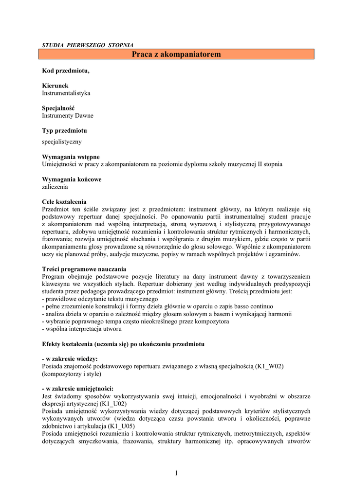 STUDIA PIERWSZEGO STOPNIA Praca z akompaniatorem Kod przedmiotu, Kierunek Instrumentalistyka Specjalność Instrumenty Dawne Typ przedmiotu specjalistyczny Wymagania wstępne Umiejętności w pracy z akompaniatorem na poziomie dyplomu szkoły muzycznej II stopnia Wymagania końcowe zaliczenia Cele kształcenia Przedmiot ten ściśle związany jest z przedmiotem: instrument główny, na którym realizuje się podstawowy repertuar danej specjalności. Po opanowaniu partii instrumentalnej student pracuje z akompaniatorem nad wspólną interpretacją, stroną wyrazową i stylistyczną przygotowywanego repertuaru, zdobywa umiejętność rozumienia i kontrolowania struktur rytmicznych i harmonicznych, frazowania; rozwija umiejętność słuchania i współgrania z drugim muzykiem, gdzie często w partii akompaniamentu głosy prowadzone są równorzędnie do głosu solowego. Wspólnie z akompaniatorem uczy się planować próby, audycje muzyczne, popisy w ramach wspólnych projektów i egzaminów. Treści programowe nauczania Program obejmuje podstawowe pozycje literatury na dany instrument dawny z towarzyszeniem klawesynu we wszystkich stylach. Repertuar dobierany jest według indywidualnych predyspozycji studenta przez pedagoga prowadzącego przedmiot: instrument główny. Treścią przedmiotu jest: - prawidłowe odczytanie tekstu muzycznego - pełne zrozumienie konstrukcji i formy dzieła głównie w oparciu o zapis basso continuo - analiza dzieła w oparciu o zależność między głosem solowym a basem i wynikającej harmonii - wybranie poprawnego tempa często nieokreślnego przez kompozytora - wspólna interpretacja utworu Efekty kształcenia (uczenia się) po ukończeniu przedmiotu - w zakresie wiedzy: Posiada znajomość podstawowego repertuaru związanego z własną specjalnością (K1_W02) (kompozytorzy i style) - w zakresie umiejętności: Jest świadomy sposobów wykorzystywania swej intuicji, emocjonalności i wyobraźni w obszarze ekspresji artystycznej (K1_U02) Posiada umiejętność wykorzystywania wiedzy dotyczącej podstawowych kryteriów stylistycznych wykonywanych utworów (wiedza dotycząca czasu powstania utworu i okoliczności, poprawne zdobnictwo i artykulacja (K1_U05) Posiada umiejętności rozumienia i kontrolowania struktur rytmicznych, metrorytmicznych, aspektów dotyczących smyczkowania, frazowania, struktury harmonicznej itp. opracowywanych utworów 1 (analiza utworów zwłaszcza pod kątem harmonicznym i zależności wynikających z basu cyfrowanego lub basu obligato) (K1_U13) - w zakresie kompetencji społecznych: Posiada umiejętność organizacji pracy własnej i zespołowej w ramach realizacji wspólnych zadań i projektów (umiejętność organizowania audycji muzycznych, popisów, prób generalnych, zespołów towarzyszących wykonaniu większego dzieła muzycznego) (K1_K03) Metody nauczania Ćwiczenia, zajęcia indywidualne Nakład pracy studenta potrzebny do osiągnięcia efektów uczenia się ROK SEMESTR 1 2 3 4 5 6 Punkty ECTS 1 1 1 1 1 1 Ilość godzin w semestrze Rodzaj zaliczenia 15 15 15 15 15 15 zal zal zal zal zal zal LEGENDA I II III zal –zaliczony; zs – zaliczenie ze stopniem; egz – egzamin; ed –egzamin dyplomowy Kryteria oceny Zaliczenie na podstawie: - znajomości repertuaru danej specjalności, czasu i okoliczności powstania utworów - w oparciu o pracę własną studenta, który dzięki swojej intuicji, wyobraźni i emocjonalności kreuje utwór muzyczny, a dzięki wykorzystaniu zdobytej wiedzy potrafi zagrać utwór w danym stylu - umiejętności rozumienia i kontrolowania struktur rytmicznych, metrorytmicznych, a w szczególności struktury harmonicznej opracowywanych utworów wynikającej głównie z basu cyfrowanego, poprawna ocena zależności pomiędzy partią solową instrumentu a partią basu - umiejętności planowania i organizowania prób, przesłuchań, audycji czy koncertów Literatura (piśmiennictwo) Zalecane pozycje literatury związane z realizowanym utworem, poszerzające wiedzę na temat danej epoki; biografie kompozytorów, wykonawców, nagrania omawianych utworów. Język wykładowy Polski, możliwość prowadzenia zajęć w języku angielskim Imię i nazwisko wykładowcy dr Ewa Rzetecka-Niewiadomska mgr Joanna Cyrulik 2