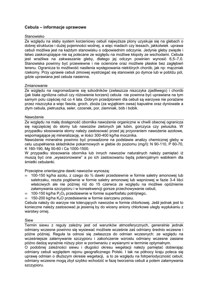Cebula – informacje uprawowe Stanowisko Ze względu na słaby system korzeniowy cebuli najwyŜsze plony uzyskuje się na glebach o dobrej strukturze i duŜej pojemności wodnej, a więc madach czy lessach, jakkolwiek uprawa cebuli moŜliwa jest na kaŜdym stanowisku o odpowiednim odczynie. Jedynie gleby zwięzłe i łatwo zaskorupiające nie są polecane ze względu na moŜliwe kłopoty ze wschodami. Cebula jest wraŜliwa na zakwaszanie gleby, dlatego jej odczyn powinien wynosić 6,5–7,0. Stanowiska powinny być przewiewne i nie ocienione oraz moŜliwie płaskie bez zagłębień terenu. Ogranicza to moŜliwość nasilenia występowania niektórych chorób, jak np: mączniak rzekomy. Przy uprawie cebuli zimowej wystrzegać się stanowisk po dymce lub w pobliŜu pól, gdzie uprawiana jest cebula nasienna. Zmianowanie Ze względu na nagromadzanie się szkodników (zwłaszcza niszczyka zjadliwego) i chorób (jak biała zgnilizna cebuli czy róŜowienie korzeni) cebula nie powinna być uprawiana na tym samym polu częściej niŜ co 4 lata. Dobrym przedplonem dla cebuli są warzywa nie poraŜane przez niszczyka a więc fasola, groch, zboŜa (za wyjątkiem owsa) kapustne oraz dyniowate a złym cebula, pietruszka, seler, czosnek, por, ziemniak, bób i bobik. NawoŜenie Ze względu na małą dostępność obornika nawoŜenie organiczne w chwili obecnej ogranicza się najczęściej do słomy lub nawozów zielonych jak łubin, gorczyca czy peluszka. W przypadku stosowania słomy naleŜy zastosować przed jej przyoraniem nawoŜenie azotowe, wspomagające jej mineralizację, w ilości 300-400 kg/ha mocznika. NawoŜenie mineralne powinno być prowadzone na podstawie analizy chemicznej gleby w celu uzupełnienia składników pokarmowych w glebie do poziomu (mg/l): N 90-110, P 60-70, K 160-190, Mg 50-60 i Ca 1000-1500. W przypadku stosowania obornika lub innych nawozów naturalnych naleŜy pamiętać iŜ muszą być one „wysezonowane” a po ich zastosowaniu będą potencjalnym wabikiem dla śmietki cebulanki. Przeciętne orientacyjne dawki nawozów wynoszą: • 100-150 kg/ha azotu, z czego do ¾ dawki przedsiewnie w formie saletry amonowej lub saletrzaku, reszta pogłównie w formie saletry amonowej lub wapniowej w fazie 3-4 liści właściwych ale nie później niŜ do 15 czerwca ze względu na moŜliwe opóźnienie załamywania szczypioru i w konsekwencji gorsze przechowywanie cebuli, • 100-150 kg/ha P2O5 przedsiewnie w formie superfosfatu potrójnego, • 150-200 kg/ha K2O przedsiewnie w formie siarczanu potasu. Cebula naleŜy do warzyw nie tolerujących nawozów w formie chlorkowej. Jeśli jednak jest to konieczne naleŜy zastosować je jesienią by do wiosny aniony chlorkowe uległy wypłukaniu z warstwy ornej. Siew Termin siewu z reguły zaleŜny jest od warunków atmosferycznych, generalnie jednak odmiany wczesne powinno się wysiewać moŜliwie wcześnie zaś odmiany średnio wczesne i późne później. Reguła ta odnosi się zwłaszcza do odmian wczesnych: ze względu na wcześniejsze załamywanie szczypioru i zakończenie wzrostu odmiany wczesne zasiane późno dadzą wyraźnie niŜszy plon w porównaniu z wysianymi w terminie optymalnym. O podobnej zaleŜności siewu i długości okresu wegetacji naleŜy pamiętać dobierając odmiany cebuli względem rejonu geograficznego Polski. I tak na północy kraju poleca się uprawę odmian o dłuŜszym okresie wegetacji, a to ze względu na fotrperiodyczność cebuli; odmiany wczesne mogą zbyt szybko wchodzić w fazę tworzenia cebuli a potem załamywania szczypioru. W przypadku odmian w typie amerykańskim polecany jest siew po 10 kwietnia ze względu na niebezpieczeństwo wystąpienia niskich temperatur i jarowizację. Polecana ilość wysiewanych nasion na 1 ha to średnio 3,2-4,5 jednostek na hektar (jednostka=250 000 nasion) dla cebuli w typie Rijnsburger i 2,5-2,8 jednostek na hektar dla odmian w typie amerykańskim. Normą wysiewu moŜemy w niewielkim zakresie regulować wielkość uzyskanych cebul - im mniejsza norma wysiewu tym większe cebule. Optymalna głębokość wysiewu to 2cm, a zagęszczenie 30-35 szt/mb podwójnego rzędu. Do siewu precyzyjnego siewnikami pneumatycznymi Nickerson-Zwaan poleca nasiona kalibrowane - duŜa dokładność ich wysiewu gwarantuje wyrównanie wielkości zebranych cebul. Ponadto nasiona kalibrowane zwykle charakteryzują się lepszymi parametrami jakości (np: lepsza energia kiełkowania i czystość genetyczna) Odmiany cebuli zimującej naleŜy wysiewać pomiędzy 15 a 20 sierpnia w ilości ok. 3,5-5,0 jednostek na ha. NaleŜy tu wziąć poprawkę na gorsze przetrwanie roślin i moŜliwość przerzedzenia plantacji w wyniku gorszego przezimowania. Nasiona bezwzględnie naleŜy zaprawić przeciwko śmietce cebulance oraz udnicy cebulówce. Zabieg zaprawiania moŜna wykonać samodzielnie w gospodarstwie postępując zgodnie z programem ochrony i zaleceniami producenta zaprawy lub zlecić go specjalistycznej firmie. Zabieg zaprawiania nasion przeciwko szkodnikom powinien być wykonany przed siewem. Nie powinno się zbyt długo przechowywać tak zaprawionych nasion ze względu na pewną fitotoksyczność preparatów i spadek siły kiełkowania. W przypadku większych partii nasion (grupy producenckie itp.) ekonomicznie uzasadnione jest zlecenie zaprawiania nasion firmie specjalizującej się w ich uszlachetnianiu bądź zakup nasion z pełną zaprawą w firmie Nickerson-Zwaan. Ochrona przed chwastami W celu zabezpieczenia plantacji cebuli przed chwastami zaleca się przeprowadzenia serii zabiegów chemicznych przy uŜyciu herbicydów. Wszelkie zabiegi ochrony chemicznej naleŜy stosować zgodnie z zaleceniami Programu Ochrony Roślin Warzywniczych przestrzegając zawartych tam instrukcji i stosując tylko preparaty zarejestrowane do stosowania w cebuli, a więc takie, które dla tego gatunku są najbezpieczniejsze. Najpowszechniej stosowana jest następująca kombinacja zabiegów: • tuŜ po siewie