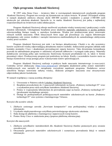 Opis programu Akademii Sieciowej W 1997 roku firma Cisco – światowy lider w rozwiązaniach internetowych uruchomiła program Akademii Sieciowej. Program ten rozwija się dynamicznie na całym świecie. W ponad 150 krajach wiedzę w ramach akademii zdobywa obecnie około 600 000 uczniów i studentów a ponad 2 500 000 osób ukończyło już szkolenia akademii. Sprawiło to, że marka Akademii Sieciowej jest jedną z najbardziej rozpoznawalnych na światowym rynku edukacyjnym. Program Akademii Sieciowej oferuje możliwość uzyskania wiedzy teoretycznej i praktycznej z wielu dziedzin informatyki. Udostępniane bezpłatnie przez akademię materiały szkoleniowe w języku polskim odzwierciedlają bieżące trendy w metodyce kształcenia. Wiedza jest przekazywana przez stosowanie różnych technik nauczania. Obok klasycznych form zajęć jak prezentacje czy zajęcia laboratoryjne udostępniany cały zestaw środków i narzędzi internetowo-multimedialnych do samodzielnego zdobywania wiedzy przez uczniów. Program Akademii Sieciowej jest stale i na bieżąco aktualizowany. Chodzi o to, aby uczestnicy kursów uzyskiwali wiedzę odpowiadającą aktualnemu stanowi techniki. Jednocześnie program zakłada stałe kontakty pomiędzy Cisco i akademiami prowadzącymi zajęcia kursowe. Taka dwustronna komunikacja pozwala na uaktualnianie programu w zależności od potrzeb odbiorców i wymagań rynku pracy. Materiały dydaktyczne zawierają pełny opis teoretyczny ilustrowany licznymi przykładami (m. in. także w formie prezentacji video). Przekazywany program jest podzielony na lekcje. Każdy z uczestników kursów może na bieżąco kontrolować swoje postępy przez wykonywanie testów sprawdzających. Program Akademii Sieciowej realizuje w praktyce hasło nauczania internetowego (e-nauczanie). Centralny serwer edukacyjny (http://cisco.netacad.net) udostępnia akademiom pełny zestaw materiałów dydaktycznych oraz narzędzi do zarządzania wszystkimi aspektami programu. Dodatkowo serwer umożliwia bieżące testowanie nabytej wiedzy, śledzenie postępów nauczania oraz utrzymywanie odpowiedniej jakości kształcenia. W ramach współpracy z naszą uczelnią oferujemy: 1. Utworzenie w Państwa szkole Lokalnej Akademii Sieciowej. 2. Bezpłatne przeszkolenie do 2 nauczycieli informatyki na kursie „Podstawy technologii IT” wraz z uzyskaniem przez nich certyfikatu instruktora Akademii Sieciowej. 3. Pomoc w wyposażeniu laboratorium do prowadzenia zajęć na kursie „Podstawy technologii IT” (przekazanie niezbędnego sprzętu). 4. Dostęp do profesjonalnych polskojęzycznych materiałów szkoleniowych na kursie „Podstawy technologii IT” oraz systemu e-learningowego Virtuoso. Korzyści dla uczniów szkoły: 1. Zdobycie cenionego zawodu „Serwisant komputerów” oraz profesjonalnej wiedzy z zakresu informatyki. 2. Uzyskanie międzynarodowego certyfikatu potwierdzającego ukończenie szkolenia. 3. Stały dostęp do platformy e-learningowej i najnowszych wersji kursów. 4. Pomoc firmy Cisco w znalezieniu pracy (poprzez platformę rekrutacyjną). Korzyści dla nauczycieli: 1. Zdobycie certyfikatów instruktorskich dla Akademii Sieciowej (bardzo pomocnych przy awansie zawodowym). 2. Otrzymanie gotowych materiałów szkoleniowych i scenariuszy prowadzenia lekcji w ramach informatyki. Opis programu Instytutu Przedsiębiorczości Instytut Przedsiębiorczości (Entrepreneur Institute) został utworzony z myślą o edukacji w zakresie przedsiębiorczości. Program został zainicjowany w kilku wybranych krajach (w tym w Polsce) we wrześniu 2007 roku. Instytut Przedsiębiorczości opracował własne treści edukacyjne, a także współpracuje z innymi organizacjami, które tworzą programy nauczania dla przedsiębiorców. Wśród nich są My Own Business Inc. (www.myownbusiness.com) , Stanford Technology Ventures Program oraz Cornell University. W ramach programu Instytut współpracuje z różnymi organizacjami, których zadaniem jest wspomaganie rozwoju małej i średniej przedsiębiorczości. Są to izby handlowe, agencje rozwoju przedsiębiorczości, centra innowacji oraz uniwersytety i szkoły biznesu. Organizacje, które chcą uczestniczyć w programie mogą utworzyć u siebie tak zwany Instytut Lokalny i oferować kursy firmowane przez Instytut Przedsiębiorczości. Instytut Przedsiębiorczości dostarcza narzędzia dydaktyczne i organizacyjne do prowadzenia szkoleń: System zarządzania instytutem – w oparciu o sieciowy system CRM o nazwie Salesforce.com. Za pomocą tego narzędzia instytut prowadzi rekrutację, tworzy klasy, komunikuje się z uczestnikami kursów i organizuje działania wspomagające proces dydaktyczny. System zarządzania treścią – w oparciu o sieciową platformę e-learningową Moodle. Jest to profesjonalne narzędzie do publikowania i udostępniania uczestnikom kursów treści programowych, wzbogaconych o materiały multimedialne i inne. Platforma jest dostępna pod adresem http://ciscoinstitute.net Materiały i narzędzia wspomagające dydaktykę – są to dodatkowe materiały w postaci prezentacji PowerPoint, podręczników instruktorskich, zeszytów ćwiczeniowych dla uczestników kursów itp. Oprócz platformy e-learningowej Cisco udostępnia instytutom platformę komunikacyjną (WebEx) umożliwiającą zdalne prowadzenie wybranych fragmentów kursów. W ramach współpracy z naszą uczelnią oferujemy: 1. Utworzenie w Państwa szkole Lokalnego Instytutu Przedsiębiorczości. 2. Bezpłatne przeszkolenie do 2 nauczycieli przedsiębiorczości na kursie „Moja własna firma” wraz z uzyskaniem przez nich certyfikatu instruktora Instytutu Przedsiębiorczości. 3. Bezpłatny dostęp do profesjonalnych polskojęzycznych materiałów szkoleniowych z zakresu przedsiębiorczości w ramach kursu „Moja własna firma” (dla nauczycieli i uczniów). 4. Udostępnienie nowoczesnej platformy prowadzenia e-learningowych szkoleń synchronicznych Webex, SalesForce oraz Moodl