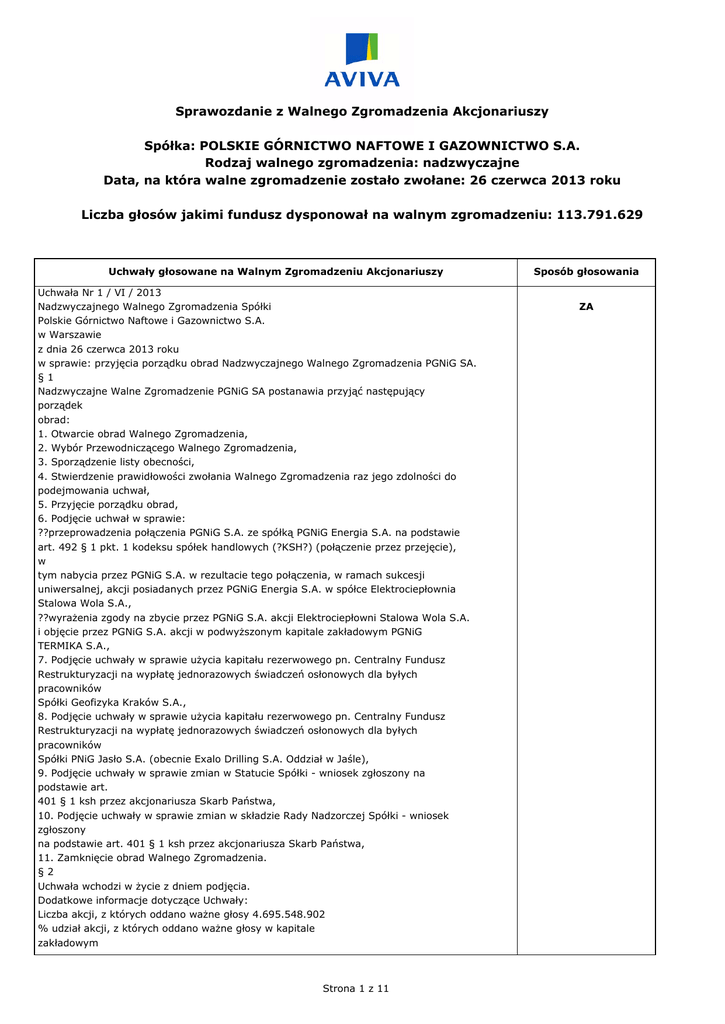 Sprawozdanie z Walnego Zgromadzenia Akcjonariuszy Spółka: POLSKIE GÓRNICTWO NAFTOWE I GAZOWNICTWO S.A. Rodzaj walnego zgromadzenia: nadzwyczajne Data, na która walne zgromadzenie zostało zwołane: 26 czerwca 2013 roku Liczba głosów jakimi fundusz dysponował na walnym zgromadzeniu: 113.791.629 Uchwały głosowane na Walnym Zgromadzeniu Akcjonariuszy Uchwała Nr 1 / VI / 2013 Nadzwyczajnego Walnego Zgromadzenia Spółki Polskie Górnictwo Naftowe i Gazownictwo S.A. w Warszawie z dnia 26 czerwca 2013 roku w sprawie: przyjęcia porządku obrad Nadzwyczajnego Walnego Zgromadzenia PGNiG SA. §1 Nadzwyczajne Walne Zgromadzenie PGNiG SA postanawia przyjąć następujący porządek obrad: 1. Otwarcie obrad Walnego Zgromadzenia, 2. Wybór Przewodniczącego Walnego Zgromadzenia, 3. Sporządzenie listy obecności, 4. Stwierdzenie prawidłowości zwołania Walnego Zgromadzenia raz jego zdolności do podejmowania uchwał, 5. Przyjęcie porządku obrad, 6. Podjęcie uchwał w sprawie: ??przeprowadzenia połączenia PGNiG S.A. ze spółką PGNiG Energia S.A. na podstawie art. 492 § 1 pkt. 1 kodeksu spółek handlowych (?KSH?) (połączenie przez przejęcie), w tym nabycia przez PGNiG S.A. w rezultacie tego połączenia, w ramach sukcesji uniwersalnej, akcji posiadanych przez PGNiG Energia S.A. w spółce Elektrociepłownia Stalowa Wola S.A., ??wyrażenia zgody na zbycie przez PGNiG S.A. akcji Elektrociepłowni Stalowa Wola S.A. i objęcie przez PGNiG S.A. akcji w podwyższonym kapitale zakładowym PGNiG TERMIKA S.A., 7. Podjęcie uchwały w sprawie użycia kapitału rezerwowego pn. Centralny Fundusz Restrukturyzacji na wypłatę jednorazowych świadczeń osłonowych dla byłych pracowników Spółki Geofizyka Kraków S.A., 8. Podjęcie uchwały w sprawie użycia kapitału rezerwowego pn. Centralny Fundusz Restrukturyzacji na wypłatę jednorazowych świadczeń osłonowych dla byłych pracowników Spółki PNiG Jasło S.A. (obecnie Exalo Drilling S.A. Oddział w Jaśle), 9. Podjęcie uchwały w sprawie zmian w Statucie Spółki - wniosek zgłoszony na podstawie art. 401 § 1 ksh przez akcjonariusza Skarb Państwa, 10. Podjęcie uchwały w sprawie zmian w składzie Rady Nadzorczej Spółki - wniosek zgłoszony na podstawie art. 401 § 1 ksh przez akcjonariusza Skarb Państwa, 11. Zamknięcie obrad Walnego Zgromadzenia. §2 Uchwała wchodzi w życie z dniem podjęcia. Dodatkowe informacje dotyczące Uchwały: Liczba akcji, z których oddano ważne głosy 4.695.548.902 % udział akcji, z których oddano ważne głosy w kapitale zakładowym Strona 1 z 11 Sposób głosowania ZA 79,59% Łączna liczba ważnych głosów 4.695.548.902 w tym głosów: za 4.694.177.748 przeciw 0 wstrzymujących się 1.371.154 Uchwała Nr 2 / VI / 2013 Nadzwyczajnego Walnego Zgromadzenia Spółki Polskie Górnictwo Naftowe i Gazownictwo S.A. w Warszawie z dnia 26 czerwca 2013 roku w sprawie: połączenia PGNiG S.A. z PGNiG Energia S.A. §1 Działając na podstawie art. 506 Kodeksu Spółek Handlowych (?KSH?) oraz § 56 ust. 4 pkt. 1 Statutu Spółki, uwzględniając pozytywną opinię Rady Nadzorczej Spółki w Uchwale nr 71/VI/2013 z dnia 24 kwietnia 2013 r. do wniosku Zarządu Spółki w Uchwale nr 238/2013 z dnia 27 marca 2013 r. Nadzwyczajne Walne Zgromadzenie niniejszym postanawia wyrazić zgodę na połączenie w trybie art. 492 § 1 pkt. 1 KSH spółki PGNiG Energia Spółka Akcyjna jako spółki przejmowanej ze spółką Polskie Górnictwo Naftowe i Gazownictwo Spółka Akcyjna z siedzibą w Warszawie, wpisaną do rejestru przedsiębiorców prowadzonego przez Sąd Rejonowy dla m.st. Warszawy w Warszawie, XII Wydział Gospodarczy Krajowego Rejestru Sądowego pod nr KRS 0000059492, jako spółką przejmującą, poprzez: (1) przeniesienie na spółkę przejmującą, jako jedynego akcjonariusza spółki przejmowanej, całego majątku spółki przejmowanej, w tym 14.100.000 posiadanych przez PGNiG Energia S.A. akcji Elektrociepłowni Stalowa Wola S.A. i wszystkich posiadanych przez PGNiG Energia S.A. udziałów spółki Biogazownia Ostrowiec Spółka z ograniczoną odpowiedzialnością w likwidacji oraz (2) rozwiązanie spółki przejmowanej bez przeprowadzenia jej likwidacji. §2 Połączenie spółek, o którym mowa w § 1, odbędzie się w sposób określony w art. 515 § 1 KSH bez podwyższania kapitału zakładowego PGNiG S.A. oraz bez zmiany statutu PGNiG S.A. i według zasad przewidzianych we wspólnym planie połączenia stanowiącym załącznik do niniejszej Uchwały, a uzgodnionym pomiędzy zarządami PGNiG S.A. i PGNiG Energia S.A. w dniu 29 kwietnia 2013 roku i ogłoszonym w dniu 7 maja 2013 w Monitorze Sądowym i Gospodarczym Nr 87 (4204). §3 Ponieważ PGNiG S.A. jest jedynym akcjonariuszem PGNiG Energia S.A., to zgodnie z art. 516 § 6 KSH połączenie, o którym mowa w § 1, zostanie dokonanie w trybie uproszczonym z ograniczeniami wynikającymi z faktu, że PGNiG S.A. jest spółką publiczną. §4 Nadzwyczajne Walne Zgromadzenie wyraża zgodę na załączony do niniejszej Uchwały plan połączenia. §5 4 Strona 4 z 16 Upoważnia się Zarząd Spółki do dokonania wszelkich niezbędnych czynności związanych z Strona 2 z 11 ZA przeprowadzeniem procedury połączenia PGNiG S.A. z PGNiG Energia S.A. §6 Uchwała wchodzi w życie z dniem powzięcia. Dodatkowe informacje dotyczące Uchwały: Liczba akcji, z których oddano ważne głosy 4.695.548.902 % udział akcji, z których oddano ważne głosy w kapitale zakładowym 79,59% Łączna liczba ważnych głosów 4.695.548.902 w tym głosów: za 4.693.977.748 przeciw 0 wstrzymujących się 1.571.154 Uchwała Nr 3 / VI / 2013 Nadzwyczajnego Walnego Zgromadzenia Spółki Polskie Górnictwo Naftowe i Gazownictwo S.A. w Warszawie z dnia 26 czerwca 2013 roku w sprawie: wyrażenia zgody na zbycie przez Spółkę akcji Elektrociepłowni Stalowa Wola S.A. i objęcie przez Spółkę akcji w podwyższonym kapitale zakładowym PGNiG TERMIKA S.A. §1 Działając na pod