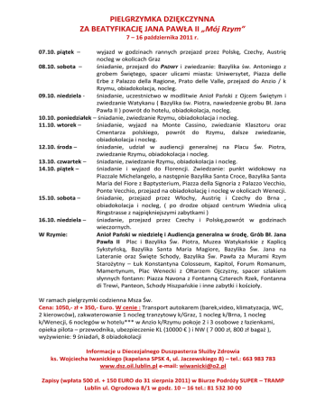 PIELGRZYMKA DZIĘKCZYNNA ZA BEATYFIKACJĘ JANA PAWŁA II „Mój Rzym” 7 – 16 października 2011 r. 07.10. piątek – wyjazd w godzinach rannych przejazd przez Polskę, Czechy, Austrię nocleg w okolicach Graz 08.10. sobota – śniadanie, przejazd do PADWY i zwiedzanie: Bazylika św. Antoniego z grobem Świętego, spacer ulicami miasta: Uniwersytet, Piazza delle Erbe z Palazzo della Ragione, Prato delle Valle, przejazd do Anzio / k Rzymu, obiadokolacja, nocleg. 09.10. niedziela śniadanie, uczestnictwo w modlitwie Anioł Paoski z Ojcem Świętym i zwiedzanie Watykanu ( Bazylika św. Piotra, nawiedzenie grobu Bł. Jana Pawła II ) powrót do hotelu, obiadokolacja, nocleg. 10.10. poniedziałek – śniadanie, zwiedzanie Rzymu, obiadokolacja i nocleg. 11.10. wtorek – śniadanie, wyjazd na Monte Cassino, zwiedzanie Klasztoru oraz Cmentarza polskiego, powrót do Rzymu, dalsze zwiedzanie, obiadokolacja i nocleg. 12.10. środa – śniadanie, udział w audiencji generalnej na Placu Św. Piotra, zwiedzanie Rzymu, obiadokolacja i nocleg. 13.10. czwartek – śniadanie, zwiedzanie Rzymu, obiadokolacja i nocleg. 14.10. piątek – śniadanie i wyjazd do Florencji. Zwiedzanie: punkt widokowy na Piazzale Michelangelo, a następnie Bazylika Santa Croce, Bazylika Santa Maria del Fiore z Baptysterium, Piazza della Signoria z Palazzo Vecchio, Ponte Vecchio, przejazd na obiadokolację i nocleg w okolicach Wenecji. 15.10. sobota – śniadanie, przejazd przez Włochy, Austrię i Czechy do Brna , obiadokolacja i nocleg, ( po drodze objazd centrum Wiednia ulicą Ringstrasse z najpiękniejszymi zabytkami ) 16.10. niedziela – śniadanie, przejazd przez Czechy i Polskę,powrót w godzinach wieczornych. W Rzymie: Anioł Paoski w niedzielę i Audiencja generalna w środę, Grób Bł. Jana Pawła II Plac i Bazylika Św. Piotra, Muzea Watykaoskie z Kaplicą Sykstyoską, Bazylika Santa Maria Magiore, Bazylika Św. Jana na Lateranie oraz Święte Schody, Bazylika Św. Pawła za Murami Rzym Starożytny – Łuk Konstantyna Colosseum, Kapitol, Forum Romanum, Mamertynum, Plac Wenecki z Ołtarzem Ojczyzny, spacer szlakiem słynnych fontann: Piazza Navona z Fontanną Czterech Rzek, Fontanna di Trewi, Panteon, Schody Hiszpaoskie i inne zabytki i kościoły. W ramach pielgrzymki codzienna Msza Św. Cena: 1050,- zł + 350,- Euro. W cenie : Transport autokarem (barek,video, klimatyzacja, WC, 2 kierowców), zakwaterowanie 1 nocleg tranzytowy k/Graz, 1 nocleg k/Brna, 1 nocleg k/Wenecji, 6 noclegów w hotelu*** w Anzio k/Rzymu pokoje 2 i 3 osobowe z łazienkami, opieka pilota – przewodnika, ubezpieczenie KL (10000 € ) i NW ( 7 000 zł, 800 zł bagaż ), wyżywienie: 9 śniadao, 8 obiadokolacji Informacje u Diecezjalnego Duszpasterza Służby Zdrowia ks. Wojciecha Iwanickiego (kapelana SPSK 4, ul. Jaczewskiego 8) – tel.: 663 983 783 www.dsz.oil.lublin.pl e-mail: [email protected] Zapisy (wpłata 500 zł. + 150 EURO do 31 sierpnia 2011) w Biurze Podróży SUPER – TRAMP Lublin ul. Ogrodowa 8/1 w godz. 10 – 16 tel.: 81 532 30 00