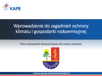 Wprowadzenie do zagadnień ochrony klimatu i gospodarki niskoemisyjnej . Planu Gospodarki Niskoemisyjnej dla miasta Józefowa Krajowa Agencja Poszanowania Energii S.A. Zmiany klimatu W ostatnich latach termin „ogólna zmiana klimatu” używany jest w kontekście globalnego ocieplenia i wzrostu temperatury na powierzchni Ziemi. Źródło: http://www.sfora.pl Krajowa Agencja Poszanowania Energii S.A. 2 Przyczyny zmian klimatu Antropogeniczne • Gazy cieplarniane • Aerozole atmosferyczne (pyły zawieszone) • Chmury i efekty pośrednie Naturalne • • • • Teoria cykli Milankovića Zmiany stałej słonecznej Wpływ erupcji wulkanów Gazy cieplarniane i pyły zawieszone Zwiększone stężenie CO2 zatrzymuje ciepło na Ziemi, stając się przyczyną globalnego ocieplenia. Zmiany klimatyczne są obecnie jednym z największych zagrożeń ekologicznych na naszej planecie, mają szkodliwy wpływ zarówno na ekosystemy, bioróżnorodność, jak i na gospodarkę oraz życie człowieka. Krajowa Agencja Poszanowania Plan Gospodarki Niskoemisyjnej dla MaistaEnergii Józefów S.A. 3 Efekt cieplarniany jest to efekt stałego podnoszenia się średniej temperatury na Ziemi, spowodowany uwalnianiem do atmosfery gazów cieplarnianych. Jednym z głównych gazów szklarnianych zawartych w atmosferze jest dwutlenek węgla, który zatrzymuje ciepło. Krajowa Agencja Poszanowania Energii S.A. 4 Jak powstaje efekt cieplarniany? Źródło: www.biomasa.org Krajowa Agencja Poszanowania Energii S.A. 5 Gazy cieplarniane (Green House Gases – GHG) Gazami cieplarnianymi (szklarniowymi) nazywamy te składniki atmosfery ziemskiej, które dzięki swoim własnościom fizykochemicznym mają zdolność zatrzymywania energii słonecznej w obrębie atmosfery ziemskiej. Należą do nich przede wszystkim: Krajowa Agencja Poszanowania Energii S.A. 6 Źródła emisji gazów cieplarnianych Źródło: www.ziemianarozdrożu.pl Krajowa Agencja Poszanowania Energii S.A. 7 Skutki zmiany klimatu Źródło: www.ziemianarozdrożu.pl Krajowa Agencja Poszanowania Energii S.A. 8 Światowe zużycie energii Źródło: www.ziemianarozdrożu.pl Krajowa Agencja Poszanowania Plan Gospodarki Niskoemisyjnej dla MaistaEnergii Józefów S.A. 9 Co dalej? Krajowa Agencja Poszanowania Energii S.A. 10 Gospodarka niskoemisyjna • Gospodarka*, której wzrost osiąga się w wyniku integracji wszystkich jej aspektów wokół: • niskoemisyjnych technologii i praktyk, • wydajnych rozwiązań energetycznych, • czystej i odnawialnej energii, oraz • proekologicznych innowacji technologicznych. • W ramach takiej gospodarki w sposób efektywny zużywa się/lub wytwarza energię i materiały, a także usuwa, bądź odzyskuje odpady metodami minimalizującymi emisję gazów cieplarnianych. • Terminologia niskoemisyjna obejmuje całkowitą ilość gazów cieplarnianych wyrażonych w CO2eq *) Źródło: Budowa gospodarki niskoemisyjnej, Podręcznik dla regionów europejskich, INTERREG IVC, grudzień 2011 Krajowa Agencja Poszanowania Energii S.A. 11 Gospodarka Niskoemisyjna to taka działalność człowieka, która przynosi: • zysk inwestorom • wzrost gospodarczy krajowi • i znaczną redukcję emisji CO2 Krajowa Agencja Poszanowania Energii S.A. 12 Gospodarka niskoemisyjna - cele UE • Unia Europejska określa gospodarkę niskoemisyjną poprzez cel, do którego ma dążyć Wspólnota, zgodnie z uzgodnionym na szczeblu międzynarodowym zadaniem utrzymania ocieplenia atmosferycznego na poziomie poniżej 2°C. • Aby to osiągnąć, emisja gazów cieplarnianych z obszaru UE musi ulec zmniejszeniu o 80-95 % do 2050 roku, co oznacza konieczność redukcji emisji GHG o 40% do 2030 roku. • Istotnym celem gospodarki niskoemisyjnej jest zmniejszenie uzależnienia UE od importu paliw kopalnych oraz zwiększenie bezpieczeństwa energetycznego Wspólnoty. Samorządy są istotnym partnerem rządu w wypełnianiu zobowiązań pakietu „3 x 20” Krajowa Agencja Poszanowania Energii S.A. 13 Pakiet klimatyczno-energetyczny nazywany skrótowo pakietem „3 x 20%” został przyjęty w marcu 2007 r. przez Parlament Europejski i przywódców krajów członkowskich UE. Zawiera on następujące cele dla UE: • zmniejszenie emisji gazów cieplarnianych przynajmniej o 20% w 2020 r. w porównaniu do bazowego 1990 r. • zwiększenie udziału energii ze źródeł odnawialnych w zużyciu energii końcowej do 20% w 2020 r. (dla Polski o 15%) • zwiększenie efektywności wykorzystania energii o 20% do 2020 r. w porównaniu do prognozy zapotrzebowania na paliwa i energię. Polska podpisała pakiet klimatyczno-energetyczny w grudniu 2008 r. Krajowa Agencja Poszanowania Energii S.A. 14 Narodowy Program Rozwoju Gospodarki Niskoemisyjnej Istotą Programu jest zapewnienie korzyści ekonomicznych, społecznych i środowiskowych (zgodnie z zasadą zrównoważonego rozwoju) płynących z działań zmniejszających emisje, osiąganych m.in. poprzez wzrost innowacyjności i wdrożenie nowych technologii, zmniejszenie energochłonności, utworzenie nowych miejsc pracy, a w konsekwencji sprzyjających wzrostowi konkurencyjności gospodarki. Kluczowy jest wzrost gospodarczy !!! Krajowa Agencja Poszanowania Energii S.A. 15 Narodowy Program Rozwoju Gospodarki Niskoemisyjnej GŁÓWNY CEL : Rozwój gospodarki niskoemisyjnej przy zapewnieniu zrównoważonego rozwoju kraju. Krajowa Agencja Poszanowania Energii S.A. 16 Jak obniżyć emisje? • Budowa nowych budynków o niskim zużyciu energii. • Termomodernizacja budynków. • Modernizacja/wymiana źródła ciepła, zmiana paliwa. • Likwidacja kotłowni i podłączenie do sieci ciepłowniczej. • Instalacja odnawialnych źródeł energii m.in.: kolektory słoneczne, panele fotowoltaiczne, pompy ciepła..). • Modernizacja/wymiana oświetlenia. • Zakup energooszczędnych urządzeń. • Niskoemisyjne pojazdy. • Eko-jazda. Krajowa Agencja Poszanowania Energii S.A. 17 Laboratorium przemysłowe Polsko-Japońskiego Centrum E