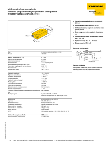 Inklinometry kąta nachylenia z dwoma programowalnymi punktami przełączania B1N360V-Q20L60-2UP6X3-H1151 ■ Kształt prostopadłościenny, wysokość 20 mm ■ tworzywo sztuczne PBT-GF30-V0 ■ Wskazanie stanu napięcia zasilania oraz przełączania ■ Dwa programowalne wyjścia dwustanowe ■ Punkty przełączania ustawiane w zakresie 0° do 360° ■ 4-przewodowy DC, 10…30 VDC ■ Złącze męskie M12 x 1 Schemat podłączenia Typ Nr kat. B1N360V-Q20L60-2UP6X3-H1151 1534051 Zakres pomiarowy [A…B] Zakres pomiarowy osi z Warunki montażowe Powtarzalność Bezwzględna dokładność (przy 25°C) Nominalny współczynnik temperaturowy Rozdzielczość Temperatura pracy 0…360° 0…360° pionowo ð 0.2 % pełnej skali +/- 0.5 ° 0.03 °/K ð 0.14 ° -30…+70 °C Napięcie zasilania Tętnienia szczątkowe Prąd bez obciążenia I0 Prąd szczątkowy Napięcie testowe izolacji Prąd wyjścia Opóźnienie zadziałania Opóźnienie zwalniania Zabezpieczenie przed zwarciem Spadek napięcia przy Ie Ochrona przed przerwą w obwodzie/odwrotną polaryzacją Funkcja wyjścia 10… 30VDC ð 10 % Uss ð 35 mA ð 0.1 mA ð 0.5 kV ð 500 mA 500 ms 350 ms tak/ termiczne ð 1V tak/ całkowita Wykonanie Wymiary Materiał obudowy Połączenie elektryczne Odporność na wibracje Odporność na uderzenia Klasa ochrony MTTF prostopadłościenna, Q20L60 60 x 30 x 20 mm tworzywo sztuczne, PC złącze kołnierzowe, M12 x 1 55 Hz (1 mm) 30 g (11 ms) IP68 / IP69K 399 rok/lata zgodnie z SN 29500 (Ed. 99) 40 °C Wskaźnik napięcia zasilania Wskaźnik stanu przełączenia LED zielony 2 x LED żółta Zasada działania Nachylenie określane jest w sposób bezkontaktowy przez czujnik półprzewodnikowy. Edition • 2016-11-09T11:09:36+01:00 5 pinów, NO/NZ , 2 × PNP Ochrona przepięciowa od +Ub do (Ub - 40V) 1/4 Hans Turck GmbH & Co.KG ñ D-45472 Mülheim an der Ruhr ñ Witzlebenstraße 7 ñ Tel. 0208 4952-0 ñ Fax 0208 4952-264 ñ [email protected] ñ www.turck.com Inklinometry kąta nachylenia z dwoma programowalnymi punktami przełączania B1N360V-Q20L60-2UP6X3-H1151 Instrukcja montażu / Opis Programowanie punktów przełączania z pomocą adaptera TX1-Q20L60 Punkty załączenia i wyłączenia są swobodnie programowane w całym zakresie inklinometru 360°. Mogą one być ustawiane w kierunku zgodnym lub przeciwnym do obrotu wskazówek zegara. Czujnik musi być montowany w pozycji pionowej. Przed przystąpieniem do programowania punktów przełączania należy inklinometr przemieścić do pozycji startowej. Więcej informacji na temat programowania znajduje się na następnej stronie. W przypadku programowania w trybie z ustawieniami fabrycznymi zakresu 180°, ustawiany jest tylko punkt Edition • 2016-11-09T11:09:36+01:00 załączenia. 2/4 Hans Turck GmbH & Co.KG ñ D-45472 Mülheim an der Ruhr ñ Witzlebenstraße 7 ñ Tel. 0208 4952-0 ñ Fax 0208 4952-264 ñ [email protected] ñ www.turck.com Inklinometry kąta nachylenia z dwoma programowalnymi punktami przełączania B1N360V-Q20L60-2UP6X3-H1151 Akcesoria montażowe Typ Nr kat. SG-Q20L60 6901100 Rysunek wymiarowy Obudowa dla inklinometru serii Q20L60; dodatkowa ochrona przed uszkodzeniem mechanicznym; materiał: Stal nierdzew- Edition • 2016-11-09T11:09:36+01:00 na 3/4 Hans Turck GmbH & Co.KG ñ D-45472 Mülheim an der Ruhr ñ Witzlebenstraße 7 ñ Tel. 0208 4952-0 ñ Fax 0208 4952-264 ñ [email protected] ñ www.turck.com Inklinometry kąta nachylenia z dwoma programowalnymi punktami przełączania B1N360V-Q20L60-2UP6X3-H1151 Instrukcja pracy Zastosowanie Instrukcja obsługi Edition • 2016-11-09T11:09:36+01:00 Nastawa punktu przełączania: NO - kierunek przeciwny do obrotu wskazówek zegara, NZ - kierunek zgodny z obrotem wskazówek zegara Nacisnąć T1 (T2) na 5 sek. Dioda LED zasilania miga Ustawić czujnik w odpowiedniej pozycji Nacisnąć T1 (T2) na 1 sek. w celu ustawienia punktu załączenia Migają diody LED zasilania i wyjścia 1 (2) Ustawić czujnik w odpowiedniej pozycji końcowej Nacisnąć T1 (T2) na 3 sek. w celu ustawienia punktu wyłączenia Diody LED zasilania i wyjścia 1 (2) migają przez 3 sek., a później świecą w sposób ciągły Proces nauki zakończony, czujnik gotowy do pracy. Nastawa punktu przełączania: NO - kierunek zgodny z obrotem wskazówek zegara, NZ - kierunek przeciwny do obrotu wskazówek zegara Nacisnąć T1 (T2) na 5 sek. Dioda LED zasilania miga Ustawić czujnik w odpowiedniej pozycji Nacisnąć T1 (T2) na 3 sek. w celu ustawienia punktu załączenia Szybko migają diody LED zasilania i wyjścia 1 (2) Ustawić czujnik w odpowiedniej pozycji końcowej Nacisnąć T1 (T2) na 1 sek. w celu ustawienia punktu wyłączenia Diody LED zasilania i wyjścia 1 (2) migają przez 3 sek., a później świecą w sposób ciągły Proces nauki zakończony, czujnik gotowy do pracy. Nastawa punktu przełączania: NO - kierunek przeciwny do obrotu wskazówek zegara, NZ - kierunek zgodny z obrotem wskazówek zegara (ustawienie fabryczne 180°) Nacisnąć T1 (T2) na 5 sek. Dioda LED zasilania miga Ustawić czujnik w odpowiedniej pozycji Nacisnąć T1 (T2) na 1 sek. w celu ustawienia punktu załączenia Migają diody LED zasilania i wyjścia 1 (2) Nacisnąć T1 (T2) na 1 sek. w celu ustawienia kąta obrotu 180° i histerezy 1° Diody LED zasilania i wyjścia 1 (2) migają przez 3 sek., a później świecą w sposób ciągły Proces nauki zakończony, czujnik gotowy do pracy. Nastawa punktu przełączania: NO - kierunek zgodny z obrotem wskazówek zegara, NZ - kierunek przeciwny do obrotu wskazówek zegara (ustawienie fabryczne 180°) Nacisnąć T1 (T2) na 5 sek. Dioda LED zasilania miga Ustawić czujnik w odpowiedniej pozycji Nacisnąć T1 (T2) na 3 sek. w celu ustawienia punktu załączenia Szybko migają diody LED zasilania i wyjścia 1 (2) Nacisnąć T1 (T2) na 3 sek. w celu ustawienia kąta obrotu 180° i histerezy 1° Diody LED zasilania i wyjścia 1 (2) migają przez 3 sek., a później świecą w sposób ciągły Proces na